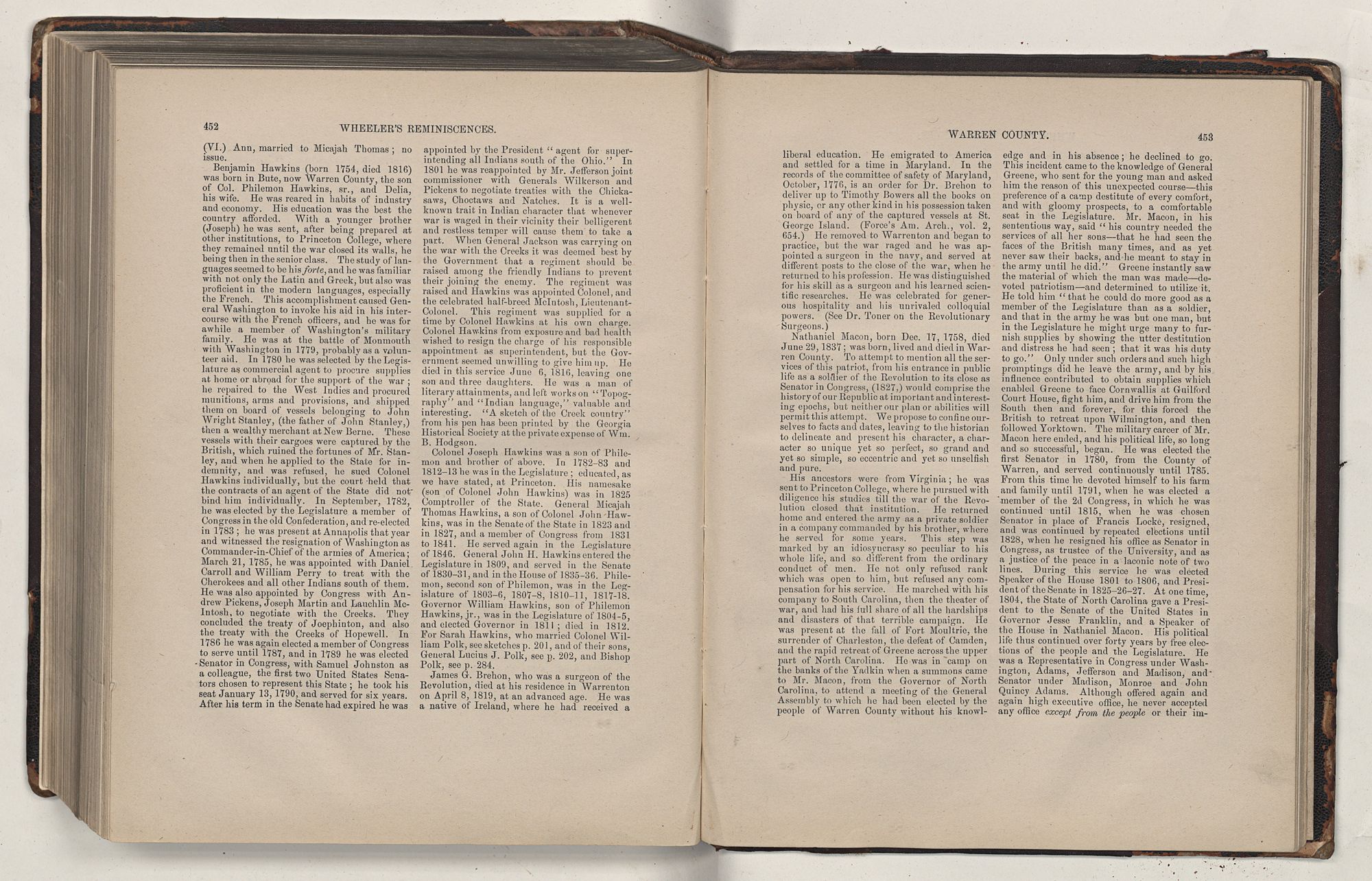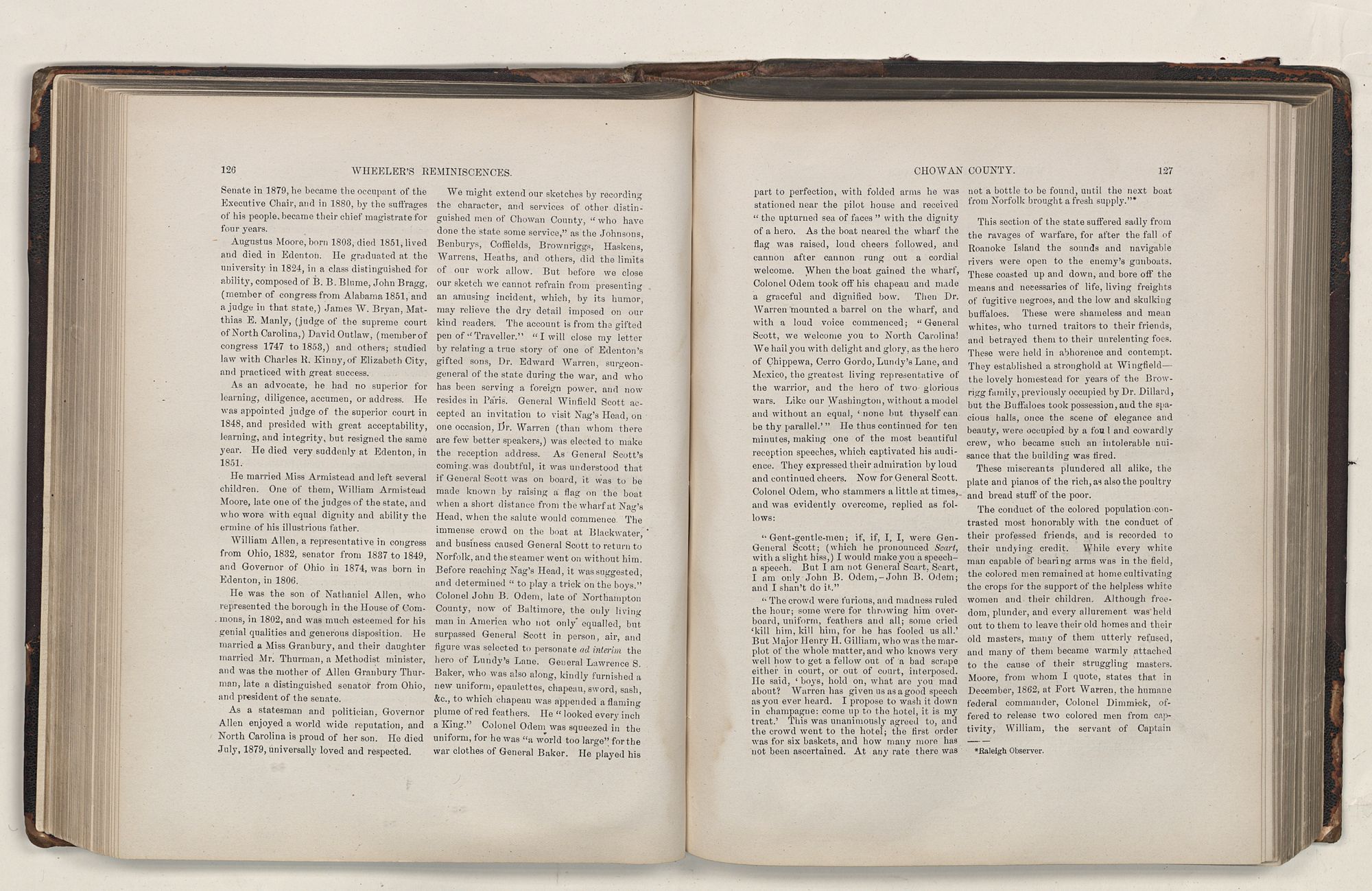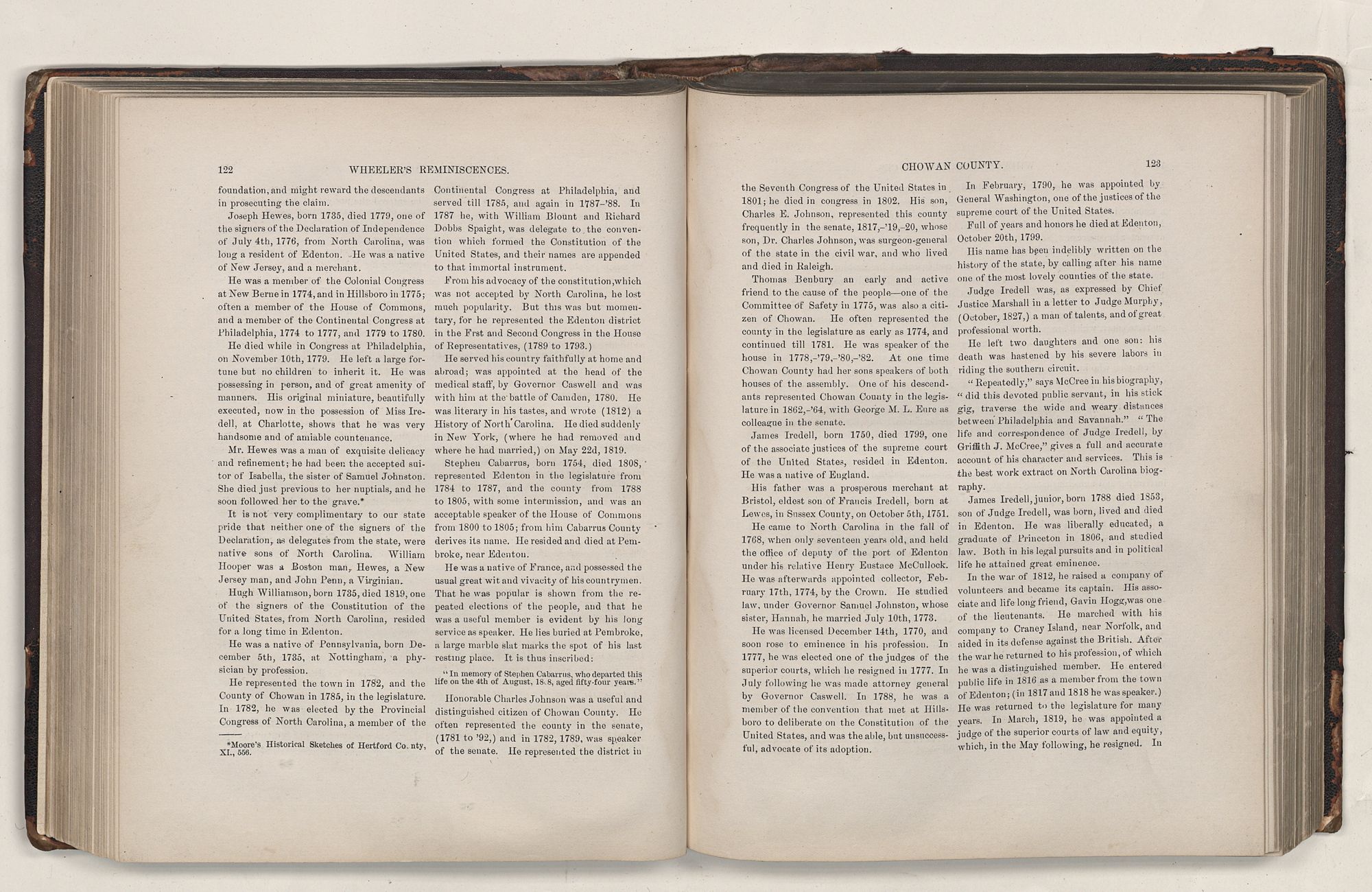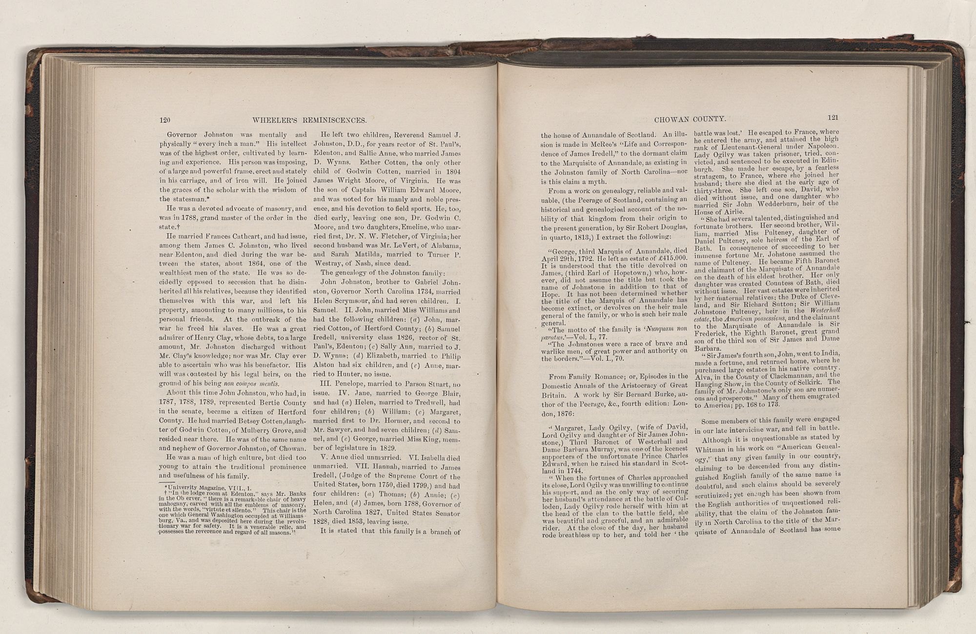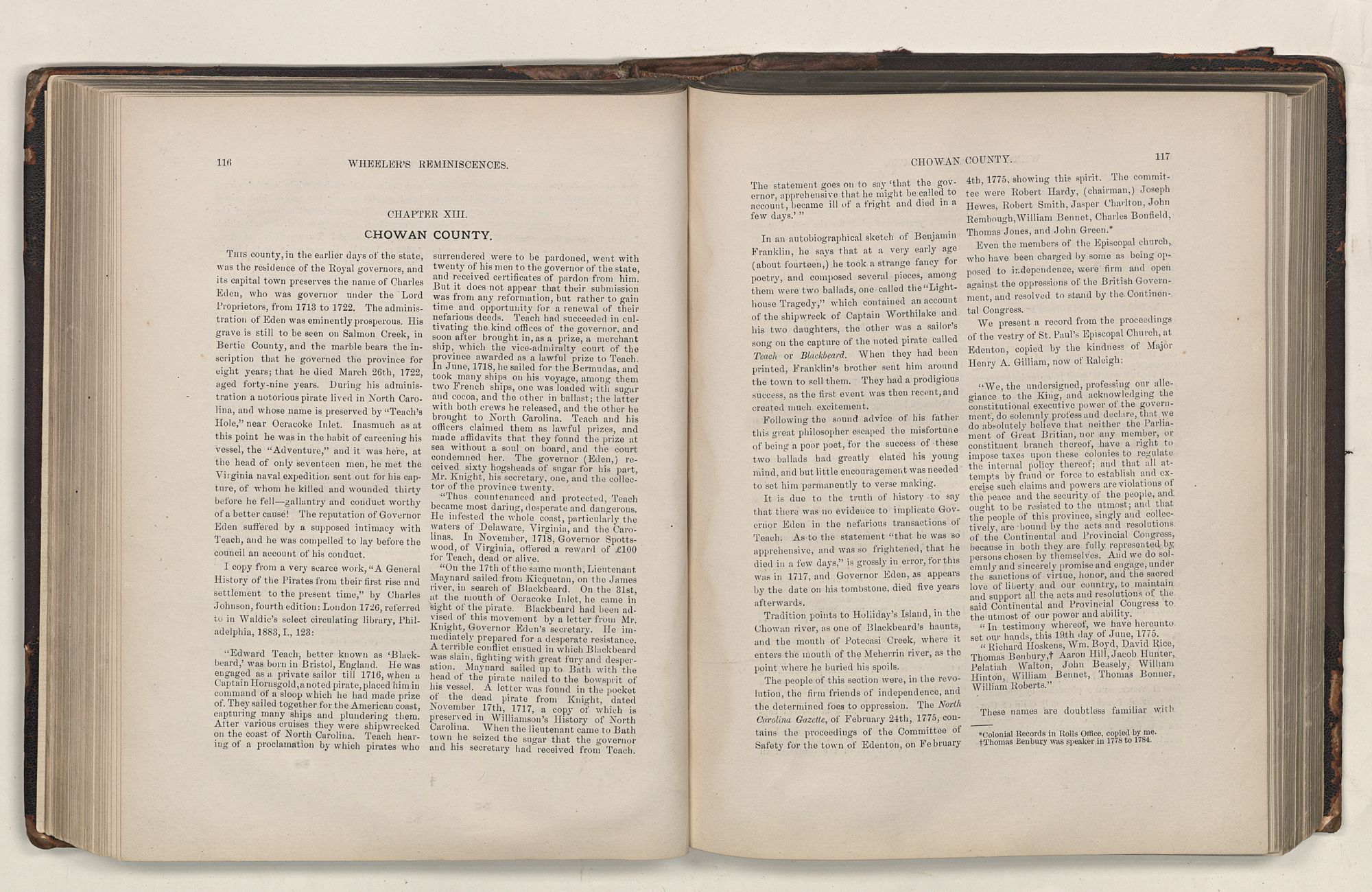 Governor Eden, (for whom the County-town is named); sketch of him and his alleged intimacy with the noted pirate, Edward Teach commonly called “Black Beard”; the bloody deeds of this marauder; his wicked life and bloody end. The principles and character of the early inhabitants of Chowan. The proceedings of the Committee of Safety in 1775; the names of the members. The Vestry of St. Paul's Church, and the patriotic resolves of the ladies of Edenton. Life, services and character of Samuel Johnston; the opinion of the Royal Governor (Martin) of him, who removed him from the office of Deputy Naval Officer, and Mr. Johnston's reply to the Governor; member of the Provincial Congress in 1775, and of the Continental Congress in 1780; elected Governor in 1787; U. S. Senator in 1789; in 1800 Judge of the Superior Court. A devoted advocate of freemasonry. Genealogy of the Johnston family. The title of the Marquis of Annandale supposed to belong to them. Sketch of Joseph Hewes, signer of the Declaration of Independence; of Hugh Williamson, a member of the Colonial and Continental Congresses; and of the U. S.; author of a history of North Carolina; of Stephen Cabarrus, long Speaker of the House of Commons; of Charles Johnson; of Thomas Benbury. Of James Iredell, appointed Judge of Supreme Court of the U. S. by General Washington; of his son, James Iredell Jr., Speaker of the House in 1817; Judge of the Superior Court 1819; Governor of the State 1821; U. S. Senator in 1827, succeeding Mr. Macon. In the war of 1812, was Captain, with Gavin Hogg as one of his Lieutenants. Sketch of Gavin Hogg. Life and services of Agustus Moore, one of the Judges of the Superior Court; sketch of his son, William A. Moore; of Governor William Allen, of Ohio, member of Congress in 1833; Senator in 1837-49, and Governor of Ohio in 1874, a native of Edenton. An amusing incident connected with the names of General Scott, Dr. Warren, Major Gilliam and others.