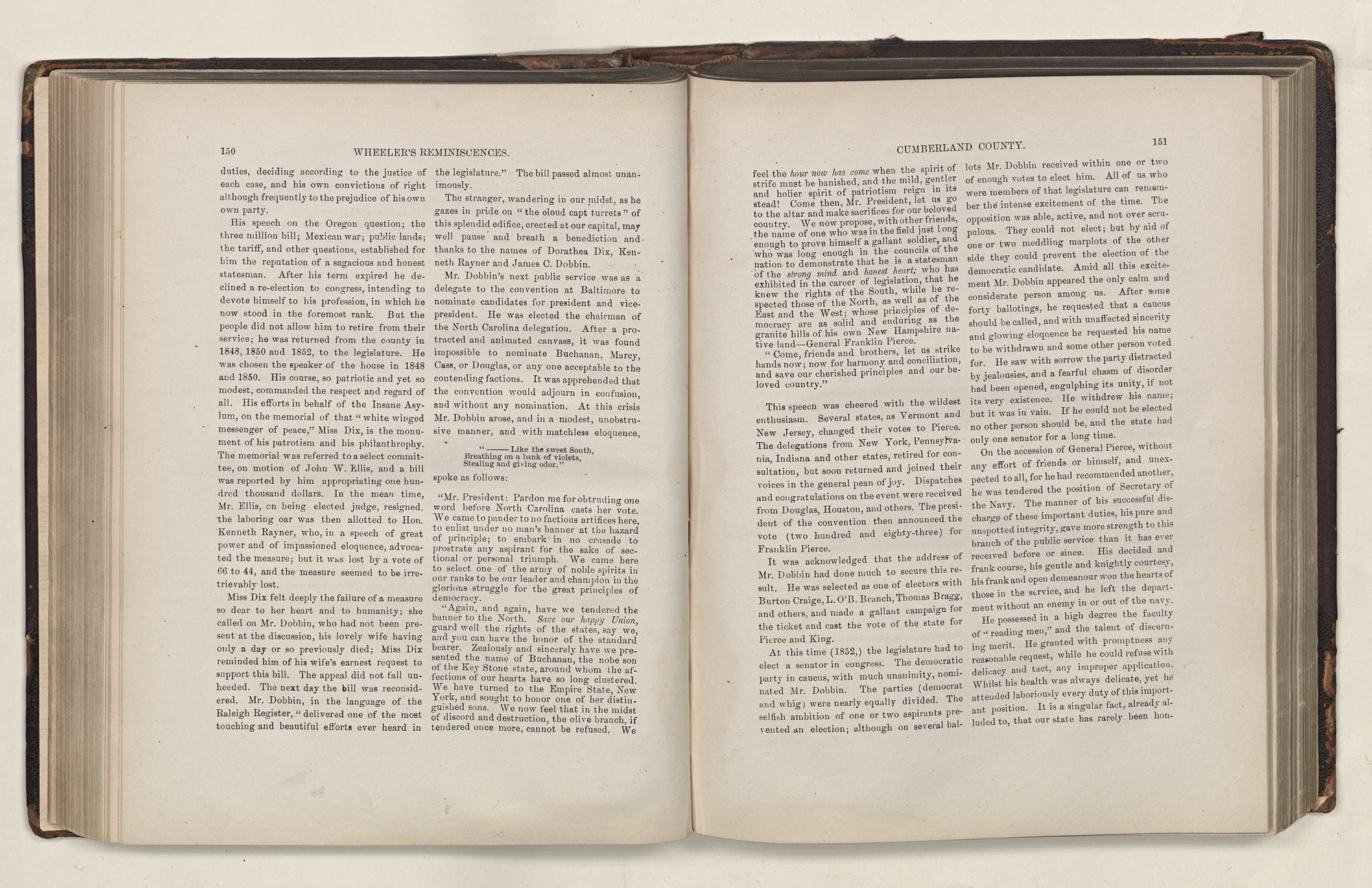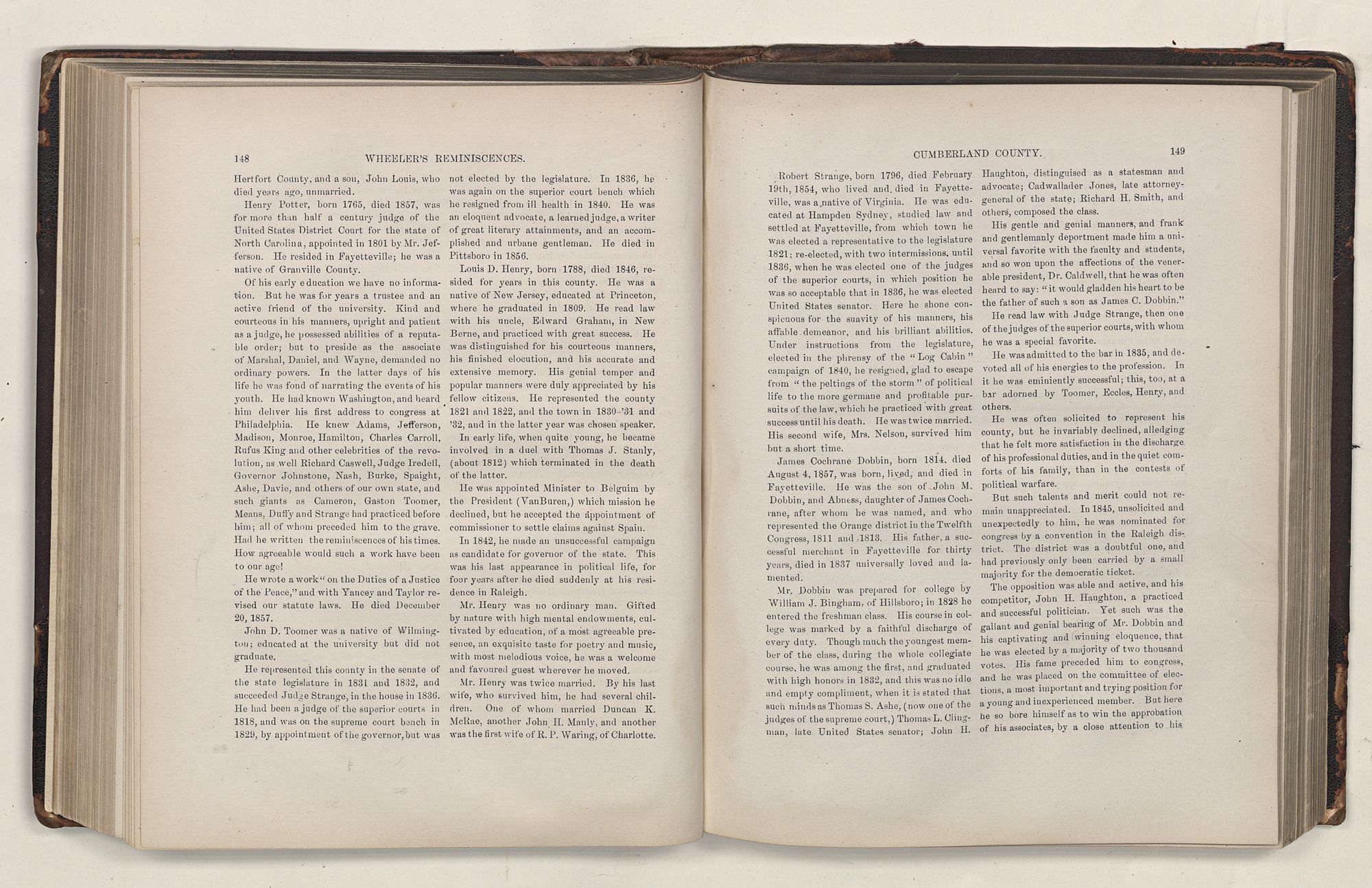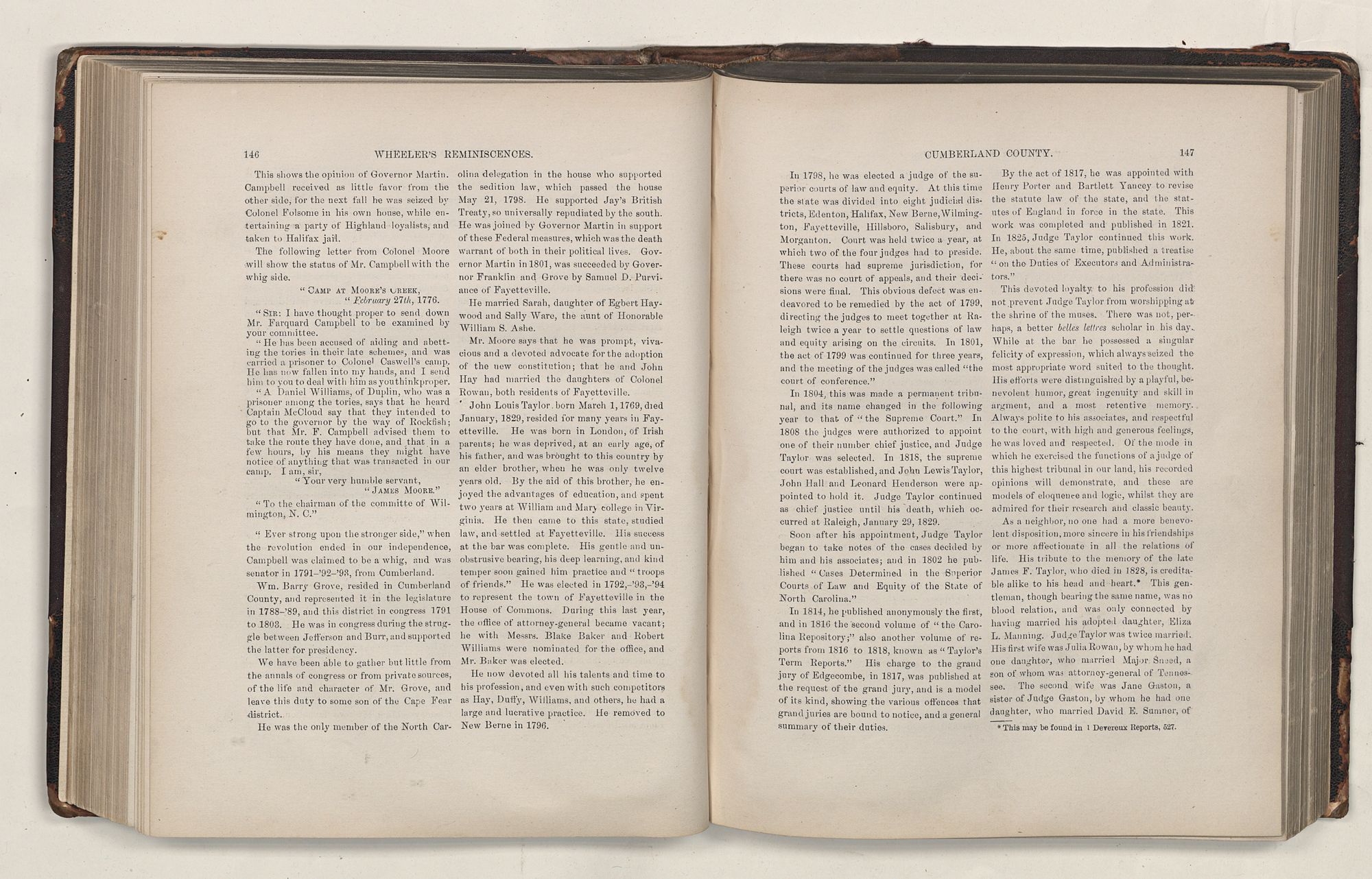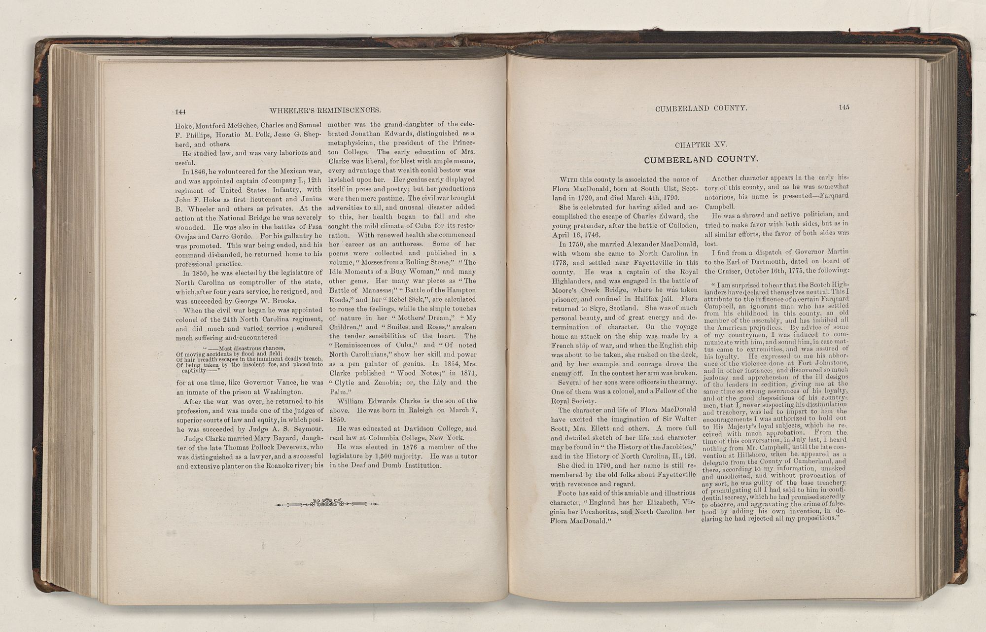 The Scotch heroine, Flora MacDonald, once lived in this County. Sketch of her life and character; of Farquard Campbell, Governor Martin's opinion of him; of William Barry Grove; of John Louis Taylor, late Chief Justice of the Supreme Court of North Carolina. Judicial System of the State as it existed from 1798 to 1804. Sketch of Henry Potter, Judge U. S. District Court; of John D. Toomer; of Louis D. Henery; of Robert Strange; of James C. Dobbin; of Warren Winslow; of Duncan K. MacRae; of Mrs. Miller; of Henry W. Hilliard of Georgia, a native of Cumberland; of W. C. Troy.
