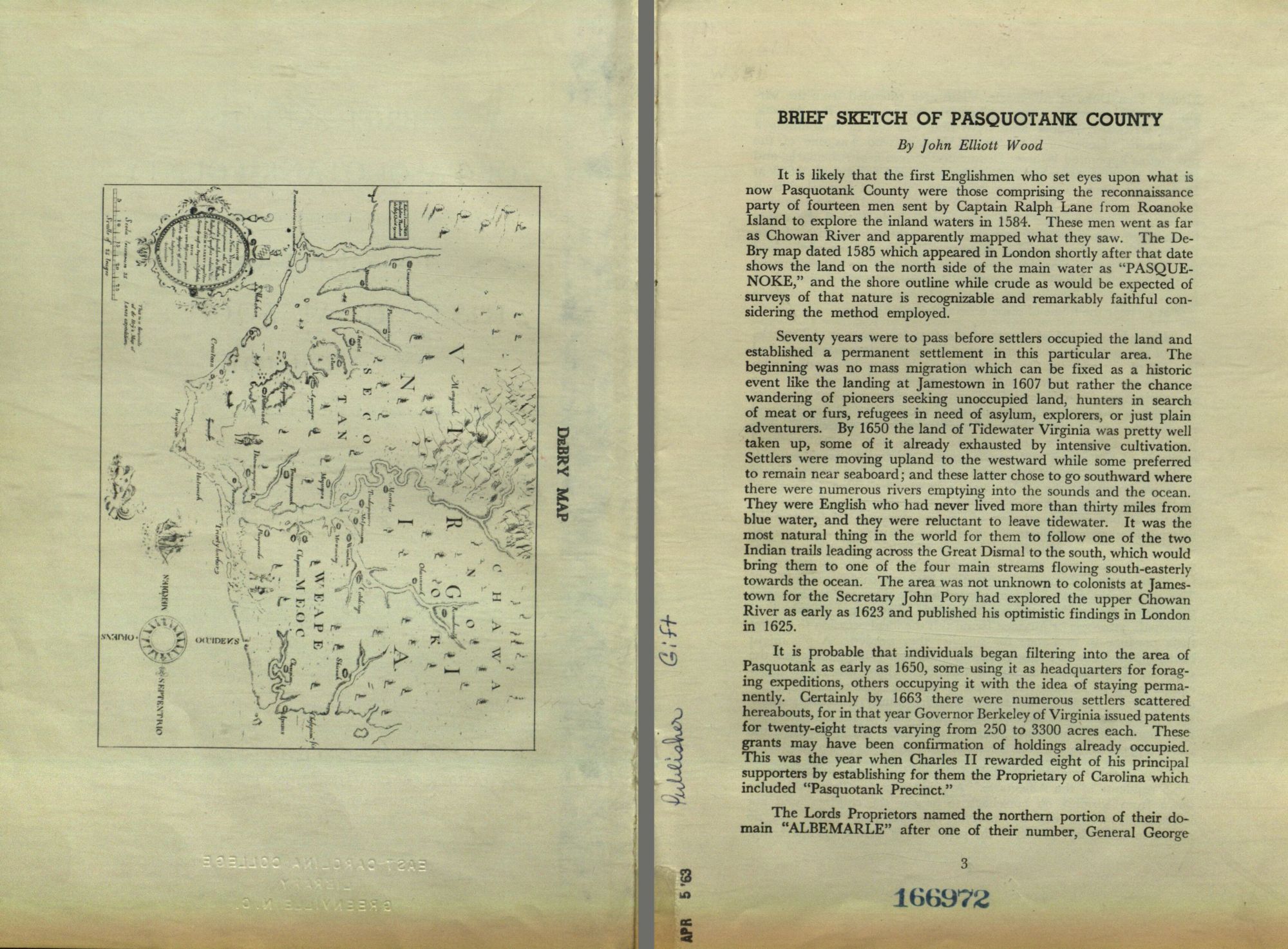 It is likely that the first Englishmen who set eyes upon what is now Pasquotank County were those comprising the reconnaissance party of fourteen men sent by Captain Ralph Lane from Roanoke Island to explore the inland waters in 1584. These men went as far as Chowan River and apparently mapped what they saw. The DeBry map dated 1585 which appeared in London shortly after that date shows the land on the north side of the main water as "PASQUENOKE," and the shore outline while crude as would be expected of surveys of that nature is recognizable and remarkably faithful considering the method employed.