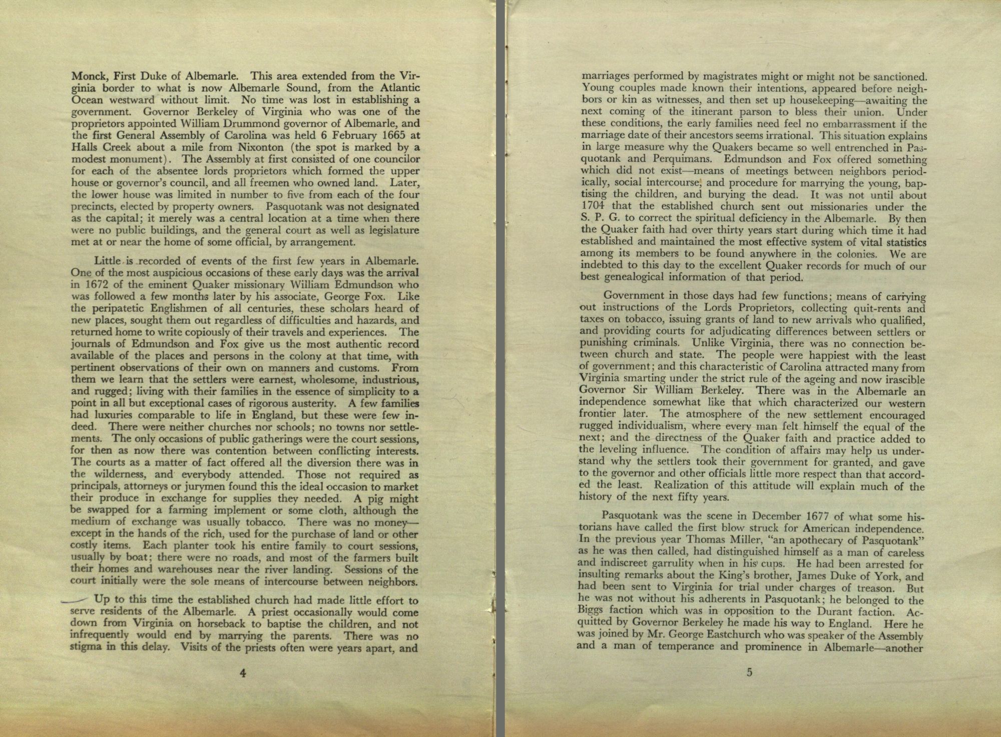 Pasquotank was the scene in December 1677 of what some historians have called the first blow struck for American independence. In the previous year Thomas Miller, "an apothecary of Pasquotank" as he was then called, had distinguished himself as a man of careless and indiscreet garrulity when in his cups. He had been arrested for insulting remarks about the King's brother, James Duke of York, and had been sent to Virginia for trial under charges of treason. But he was not without his adherents in Pasquotank; he belonged to the Biggs faction which was in opposition to the Durant faction. Acquitted by Governor Berkeley he made his way to England. Here he was joined by Mr. George Eastchurch who was speaker of the Assembly and a man of temperance and prominence in Albemarle-another