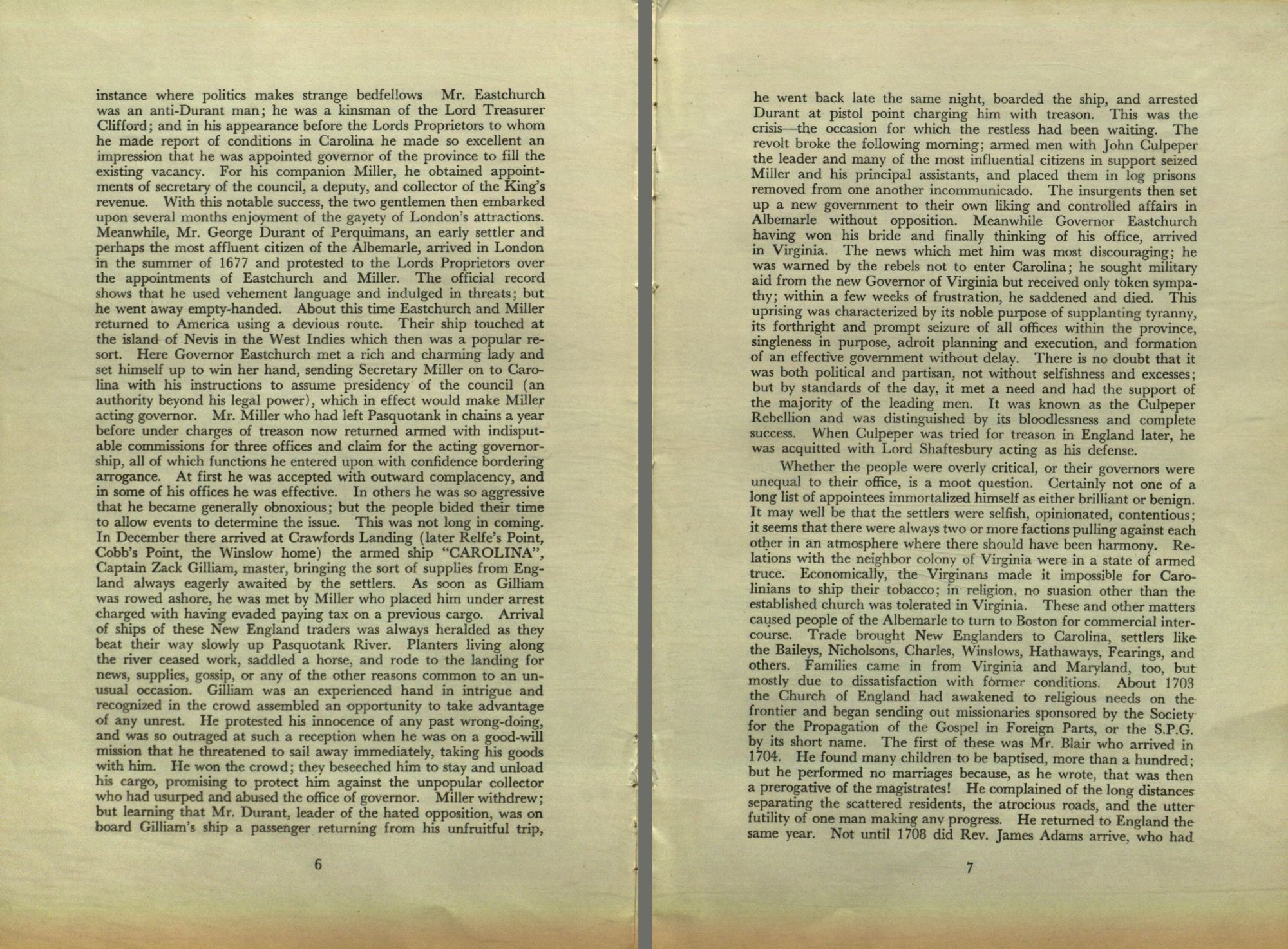 instance where politics makes strange bedfellows Mr. Eastchurch was an anti-Durant man; he was a kinsman of the Lord Treasurer Clifford; and in his appearance before the Lords Proprietors to whom he made report of conditions in Carolina he made so excellent an impression that he was appointed governor of the province to fill the existing vacancy. For his companion Miller, he obtained appointments of secretary of the council, a deputy, and collector of the King's revenue. With this notable success, the two gentlemen then embarked upon several months enjoyment of the gayety of London's attractions. Meanwhile, Mr. George Durant of Perquimans, an early settler and perhaps the most affluent citizen of the Albemarle, arrived in London in the summer of 1677 and protested to the Lords Proprietors over the appointments of Eastchurch and Miller. The official record shows that he used vehement language and indulged in threats; but he went away empty-handed. About this time Eastchurch and Miller returned to America using a devious route. Their ship touched at the island of Nevis in the West Indies which then was a popular resort. Here Governor Eastchurch met a rich and charming lady and set himself up to win her hand, sending Secretary Miller on to Carolina with his instructions to assume presidency of the council (an authority beyond his legal power), which in effect would make Miller acting governor. Mr. Miller who had left Pasquotank in chains a year before under charges of treason now returned armed with indisputable commissions for three offices and claim for the acting governorship, all of which functions he entered upon with confidence bordering arrogance. At first he was accepted with outward complacency, and in some of his offices he was effective. In others he was so aggressive that he became generally obnoxious; but the people bided their time to allow events to determine the issue. This was not long in coming. In December there arrived at Crawfords Landing (later Relfe's Point, Cobb's Point, the Winslow home) the armed ship "CAROLINA", Captain Zack Gilliam, master, bringing the sort of supplies from England always eagerly awaited by the settlers. As soon as Gilliam was rowed ashore, he was met by Miller who placed him under arrest charged with having evaded paying tax on a previous cargo. Arrival of ships of these New England traders was always heralded as they beat their way slowly up Pasquotank River. Planters living along the river ceased work, saddled a horse, and rode to the landing for news, supplies, gossip, or any of the other reasons common to an unusual occasion. Gilliam was an experienced hand in intrigue and recognized in the crowd assembled an opportunity to take advantage of any unrest. He protested his innocence of any past wrong-doing, and was so outraged at such a reception when he was on a good-will mission that he threatened to sail away immediately, taking his goods with him. He won the crowd; they beseeched him to stay and unload his cargo, promising to protect him against the unpopular collector who had usurped and abused the office of governor. Miller withdrew; but learning that Mr. Durant, leader of the hated opposition, was on board Gilliam's ship a passenger returning from his unfruitful trip,