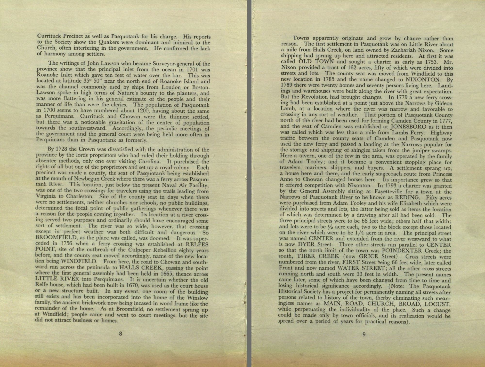 Towns apparently originate and grow by chance rather than reason. The first settlement in Pasquotank was on Little River about a mile from Halls Creek, on land owned by Zachariah Nixon. Some shipping had sprung up here and attracted residents. At first it was called OLD TOWN and sought a charter as early as 1753. Mr. Nixon provided a tract of 162 acres, fifty of which were divided into streets and lots. The county seat was moved from Windfield to this new location in 1785 and the name changed to NIXONTON. By 1789 there were twenty homes and seventy persons living here. Landings and warehouses were built along the river with great expectation. But the Revolution had brought changes. In 1779 a new ferry crossing had been established at a point just above the Narrows by Gideon Lamb, at a location where the river was narrow and favorable to crossing in any sort of weather. That portion of Pasquotank County north of the river had been used for forming Camden County in 1777, and the seat of Camden was established at JONESBORO as it then was called which was less than a mile from Lambs Ferry. Highway traffic between the county seats of Camden and Pasquotank now used the new ferry and passed a landing at the Narrows popular for the storage and shipping of shingles taken from the juniper swamps. Here a tavern, one of the few in the area, was operated by the family of Adam Tooley; and it became a convenient stopping place for travelers, mariners, shippers, and buyers. A settlement sprang up, a house here and there, and the early stagecoach route from Princess Anne to Chowan changed horses here. Its importance grew so that it offered competition with Nixonton. In 1793 a charter was granted by the General Assembly sitting at Fayetteville for a town at the Narrows of Pasquotank River to be known as REDING. Fifty acres were purchased from Adam Tooley and his wife Elizabeth which were divided into streets and lots, the latter being sold as items the location of which was determined by a drawing after all had been sold. The three principal streets were to be 66 feet wide; others half that width; and lots were to be ? acre each, two to the block except those located on the river which were to be 1/4 acre in area. The principal street was named CENTER and extended from the river westward to what is now DYER Street. Three other streets ran parallel to CENTER so that the north limit of the town was POINDEXTER Creek; the south, TIBER CREEK (now GRICE Street). Cross streets were numbered from the river, FIRST Street being 66 feet wide, later called Front and now named WATER STREET; all the other cross streets running north and south were 33 feet in width. The present names came later, some of which have been changed from time to time and losing historical significance accordingly. (Note: The Pasquotank Historical Society has a project for permanently naming all streets after persons related to history of the town, therby eliminating such meaningless names as MAIN, ROAD, CHURCH, BROAD, LOCUST, while perpetuating the individuality of the place. Such a change could be made only by town officials, and its realization would be spread over a period of years for practical reasons).