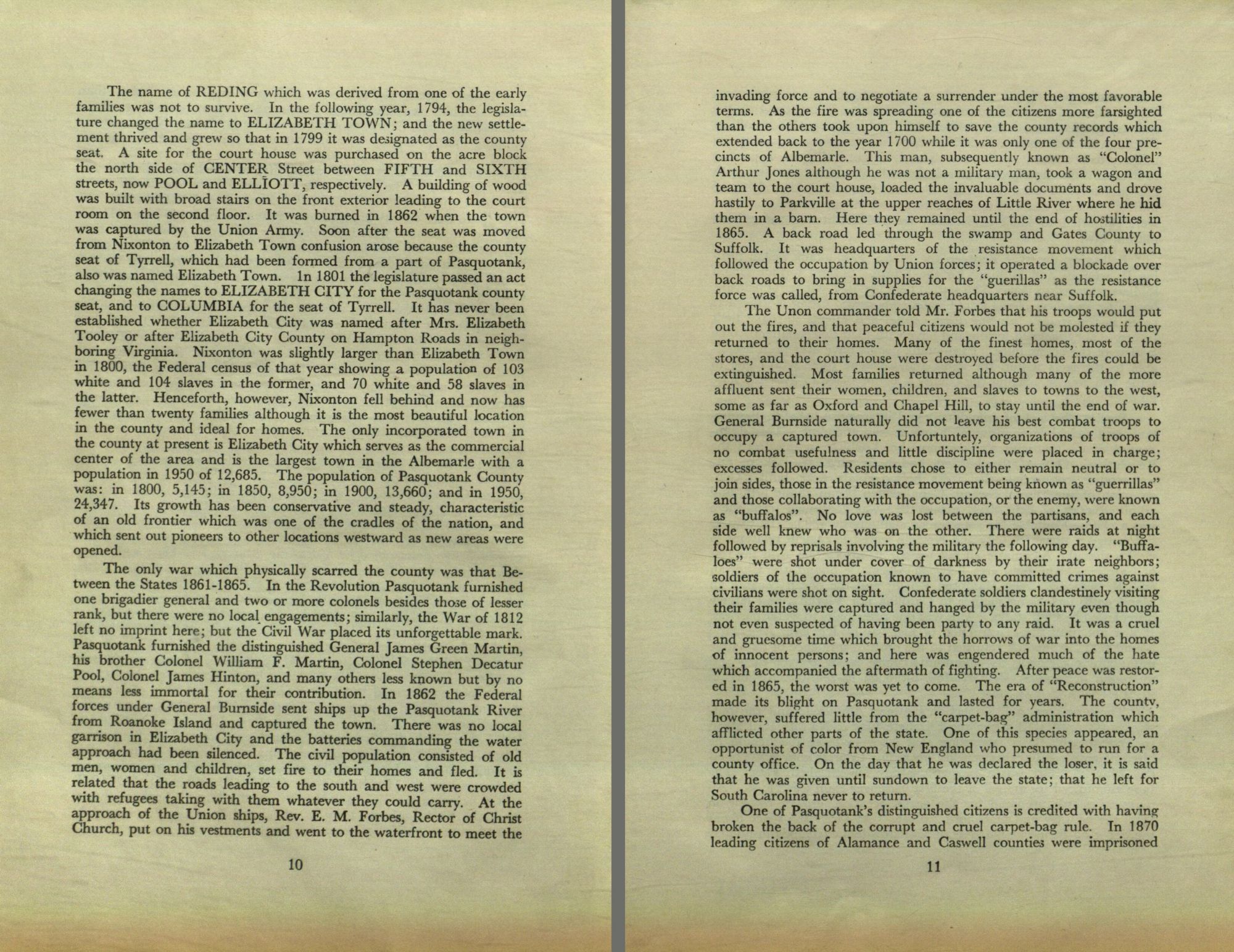 The Unon commander told Mr. Forbes that his troops would put out the fires, and that peaceful citizens would not be molested if they returned to their homes. Many of the finest homes, most of the stores, and the court house were destroyed before the fires could be extinguished. Most families returned although many of the more affluent sent their women, children, and slaves to towns to the west, some as far as Oxford and Chapel Hill, to stay until the end of war. General Burnside naturally did not leave his best combat troops to occupy a captured town. Unfortunately, organizations of troops of no combat usefulness and little discipline were placed in charge; excesses followed. Residents chose to either remain neutral or to join sides, those in the resistance movement being known as "guerrillas" and those collaborating with the occupation, or the enemy, were known as "buffalos". No love was lost between the partisans, and each side well knew who was on the other. There were raids at night followed by reprisals involving the military the following day. "Buffaloes" were shot under cover of darkness by their irate neighbors; soldiers of the occupation known to have committed crimes against civilians were shot on sight. Confederate soldiers clandestinely visiting their families were captured and hanged by the military even though not even suspected of having been party to any raid. It was a cruel and gruesome time which brought the horrows of war into the homes of innocent persons; and here was engendered much of the hate which accompanied the aftermath of fighting. After peace was restored in 1865, the worst was yet to come. The era of "Reconstruction" made its blight on Pasquotank and lasted for years. The county, however, suffered little from the "carpet-bag" administration which afflicted other parts of the state. One of this species appeared, an opportunist of color from New England who presumed to run for a county office. On the day that he was declared the loser, it is said that he was given until sundown to leave the state; that he left for South Carolina never to return.