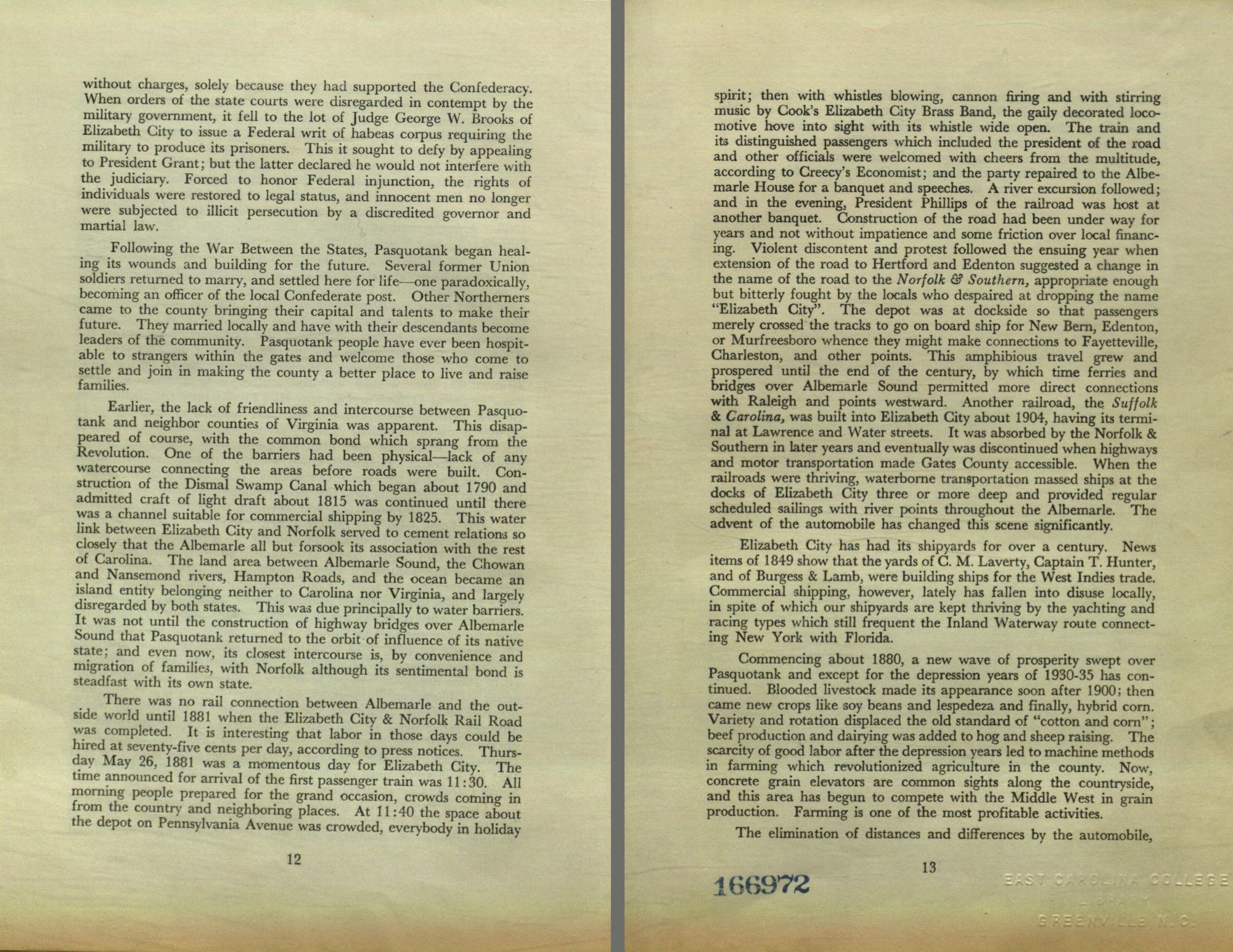 spirit; then with whistles blowing, cannon firing and with stirring music by Cook's Elizabeth City Brass Band, the gaily decorated locomotive hove into sight with its whistle wide open. The train and its distinguished passengers which included the president of the road and other officials were welcomed with cheers from the multitude, according to Creecy's Economist; and the party repaired to the Albemarle House for a banquet and speeches. A river excursion followed; and in the evening, President Phillips of the railroad was host at another banquet. Construction of the road had been under way for years and not without impatience and some friction over local financing. Violent discontent and protest followed the ensuing year when extension of the road to Hertford and Edenton suggested a change in the name of the road to the Norfolk & Southern, appropriate enough but bitterly fought by the locals who despaired at dropping the name "Elizabeth City". The depot was at dockside so that passengers merely crossed the tracks to go on board ship for New Bern, Edenton, or Murfreesboro whence they might make connections to Fayetteville, Charleston, and other points. This amphibious travel grew and prospered until the end of the century, by which time ferries and bridges over Albemarle Sound permitted more direct connections with Raleigh and points westward. Another railroad, the Suffolk & Carolina, was built into Elizabeth City about 1904, having its terminal at Lawrence and Water streets. It was absorbed by the Norfolk & Southern in later years and eventually was discontinued when highways and motor transportation made Gates County accessible. When the railroads were thriving, waterborne transportation massed ships at the docks of Elizabeth City three or more deep and provided regular scheduled sailings with river points throughout the Albemarle. The advent of the automobile has changed this scene significantly.