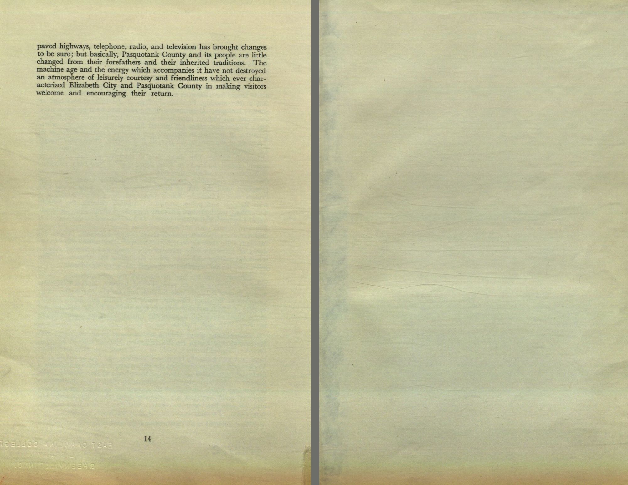 paved highways, telephone, radio, and television has brought changes to be sure; but basically, Pasquotank County and its people are little changed from their forefathers and their inherited traditions. The machine age and the energy which accompanies it have not destroyed an atmosphere of leisurely courtesy and friendliness which ever characterized Elizabeth City and Pasquotank County in making visitors welcome and encouraging their return.