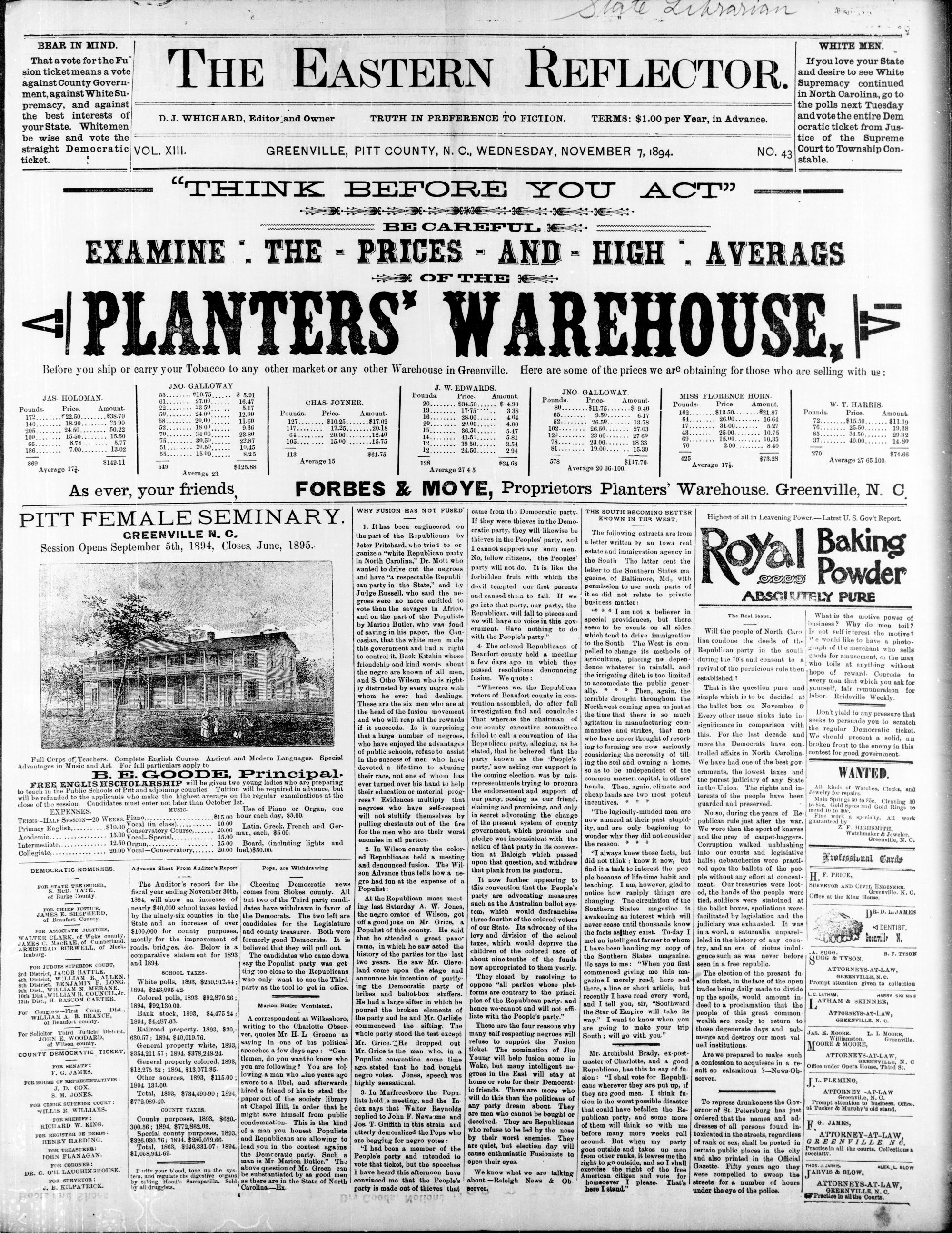 GREENVILLE, PITT COUNTY, N. C, WEDNESDAY, NOVEMBER 1894.