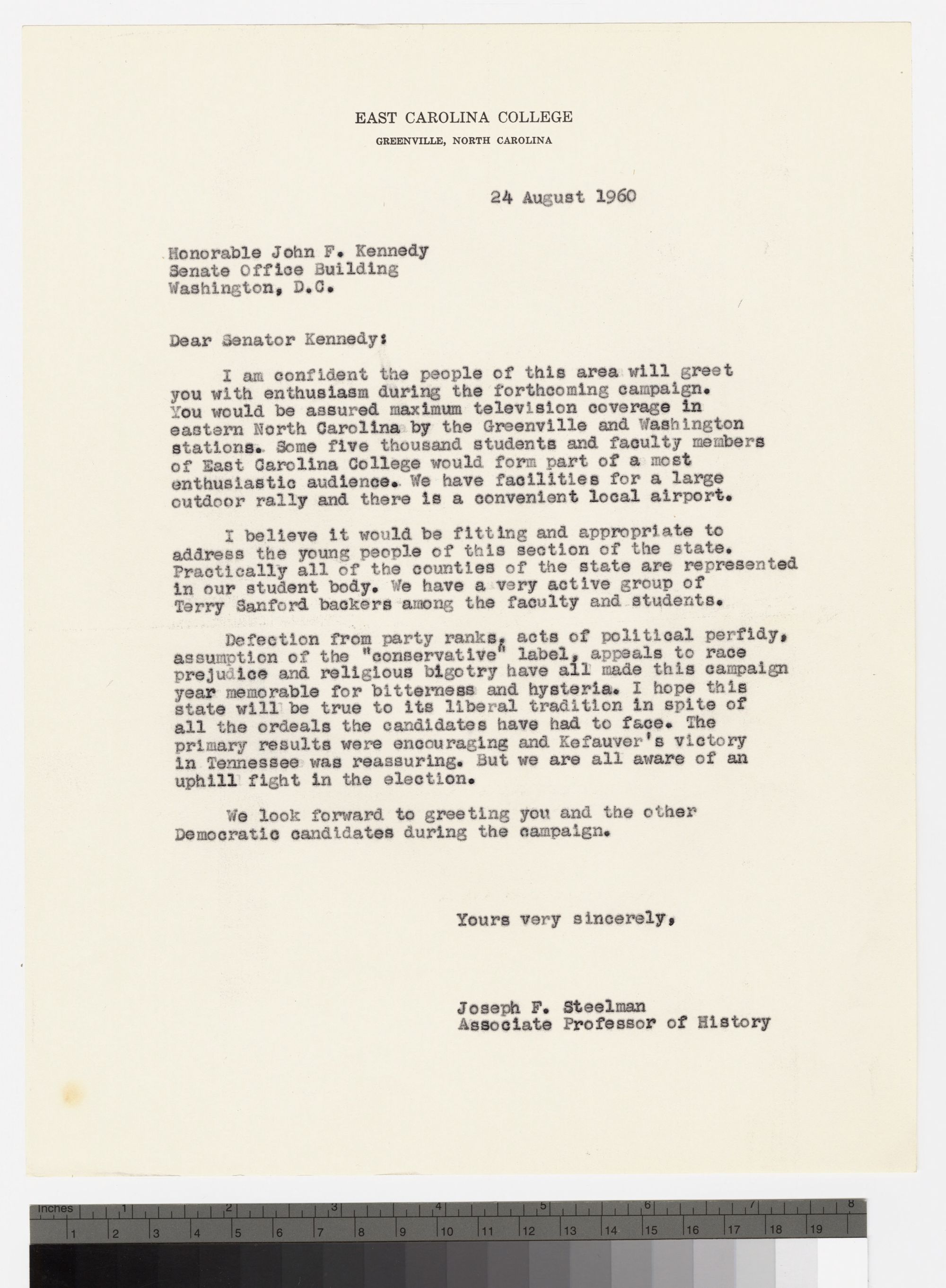 Letter to Senator John F. Kennedy from Joseph F. Steelman, August 24, 1960. Steelman, an Associate Professor of History at East Carolina College, describes local support for Kennedy and Terry Sanford.
