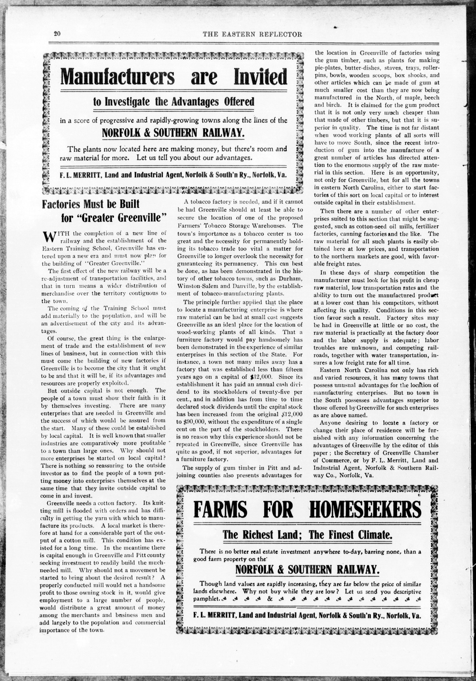 F. L. MERRITT, Land and Industrial Agent, Norfolk & South'sn Ry., Norfolk, Va.