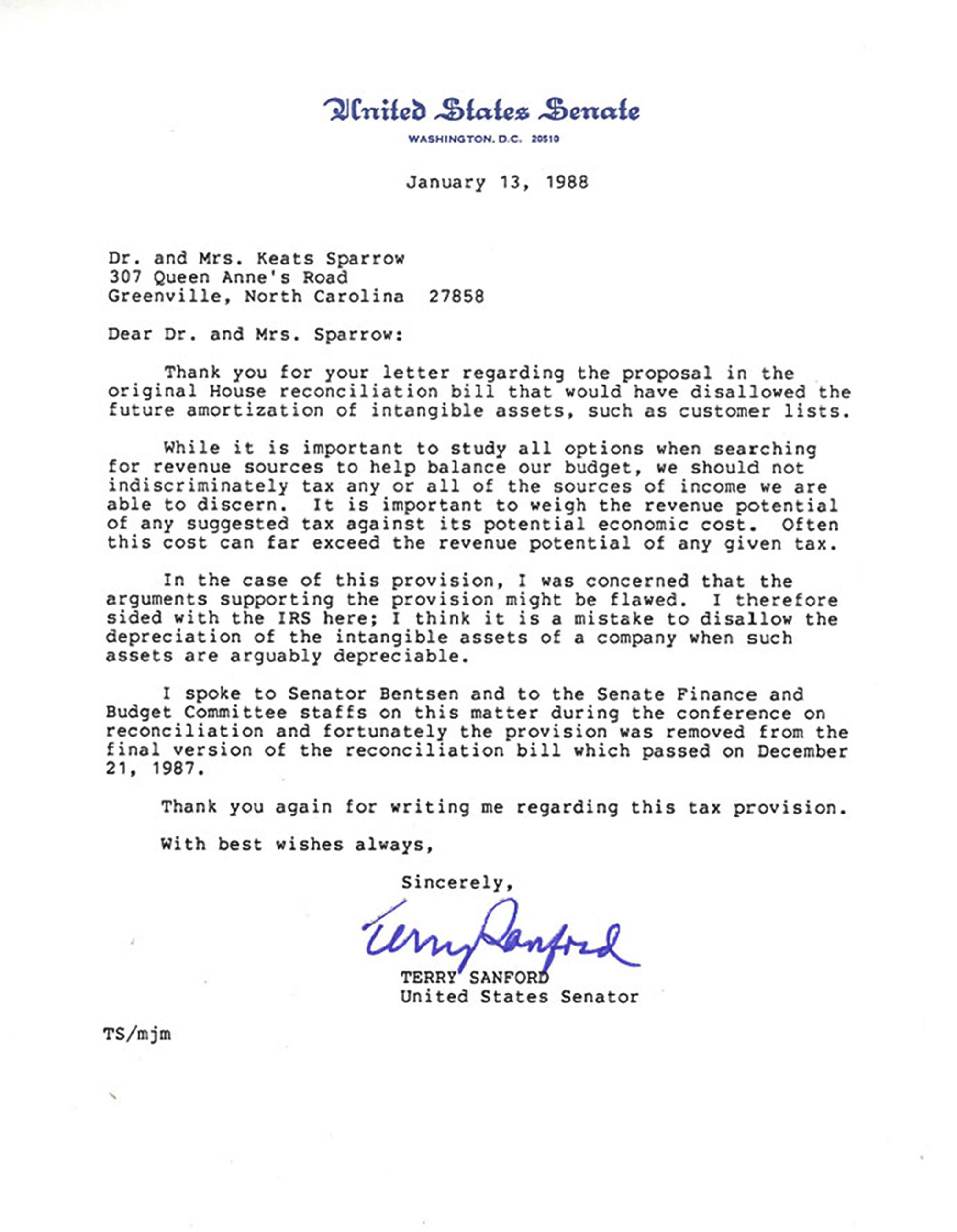 Sincerely, Terry Sanford