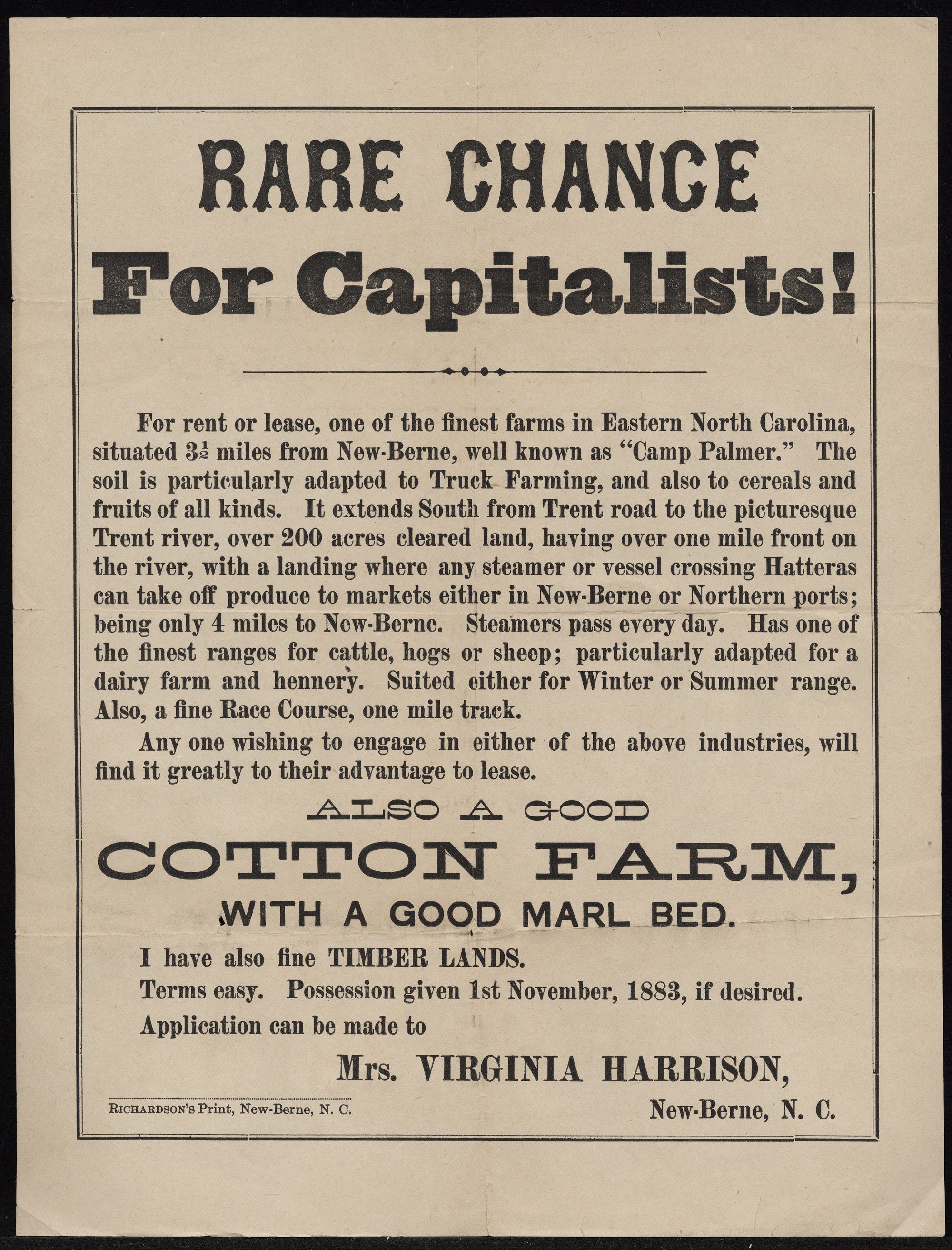 Original broadside (circa 1883) offering a “Rare Chance for Capitalists!” Offered for rent or lease by Mrs. Virginia Harrison of New Berne, N.C. is Camp Palmer, “one of the finest farms in Eastern North Carolina.” She also states she has “a good cotton farm” and “fine timber lands” available as well.