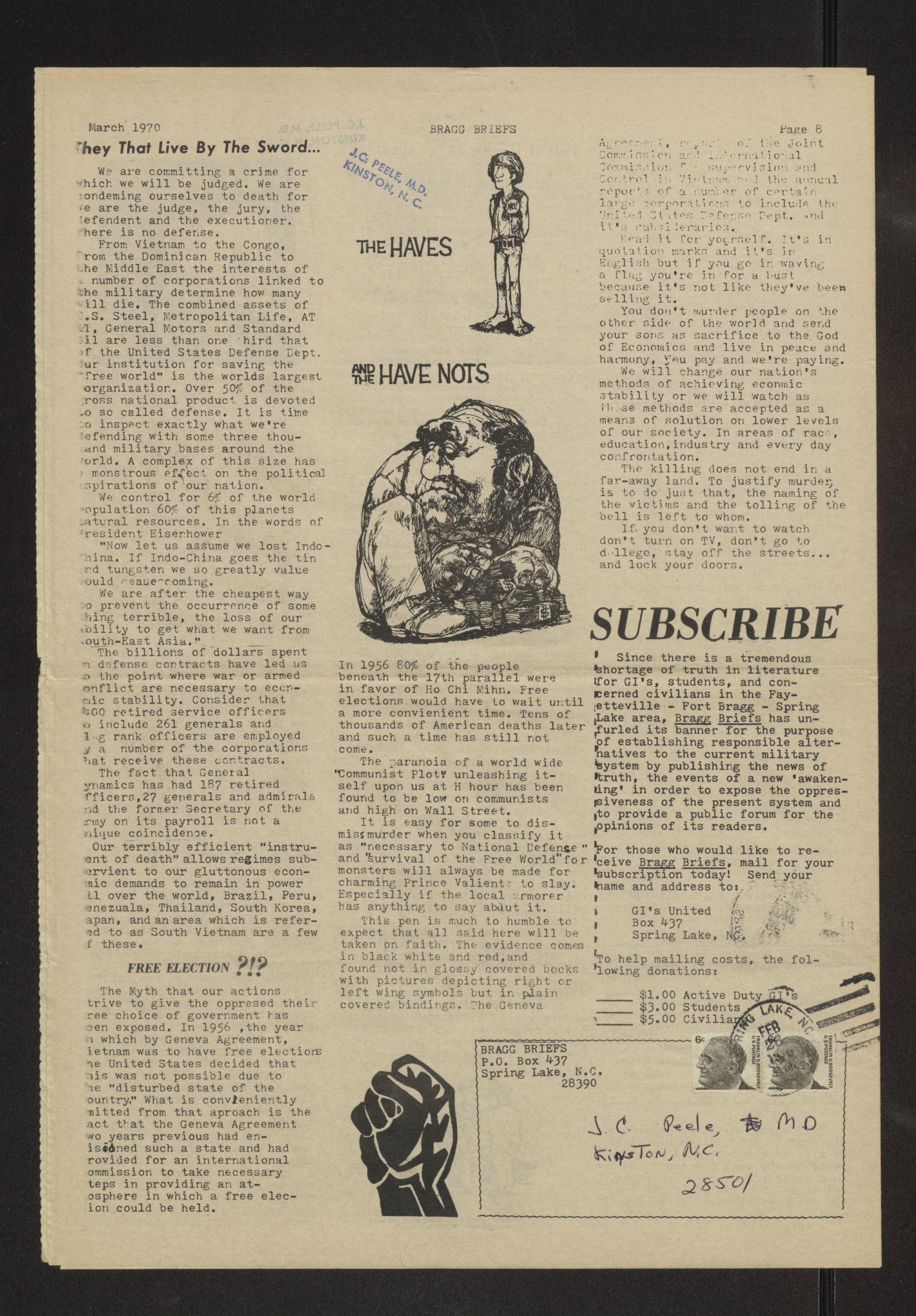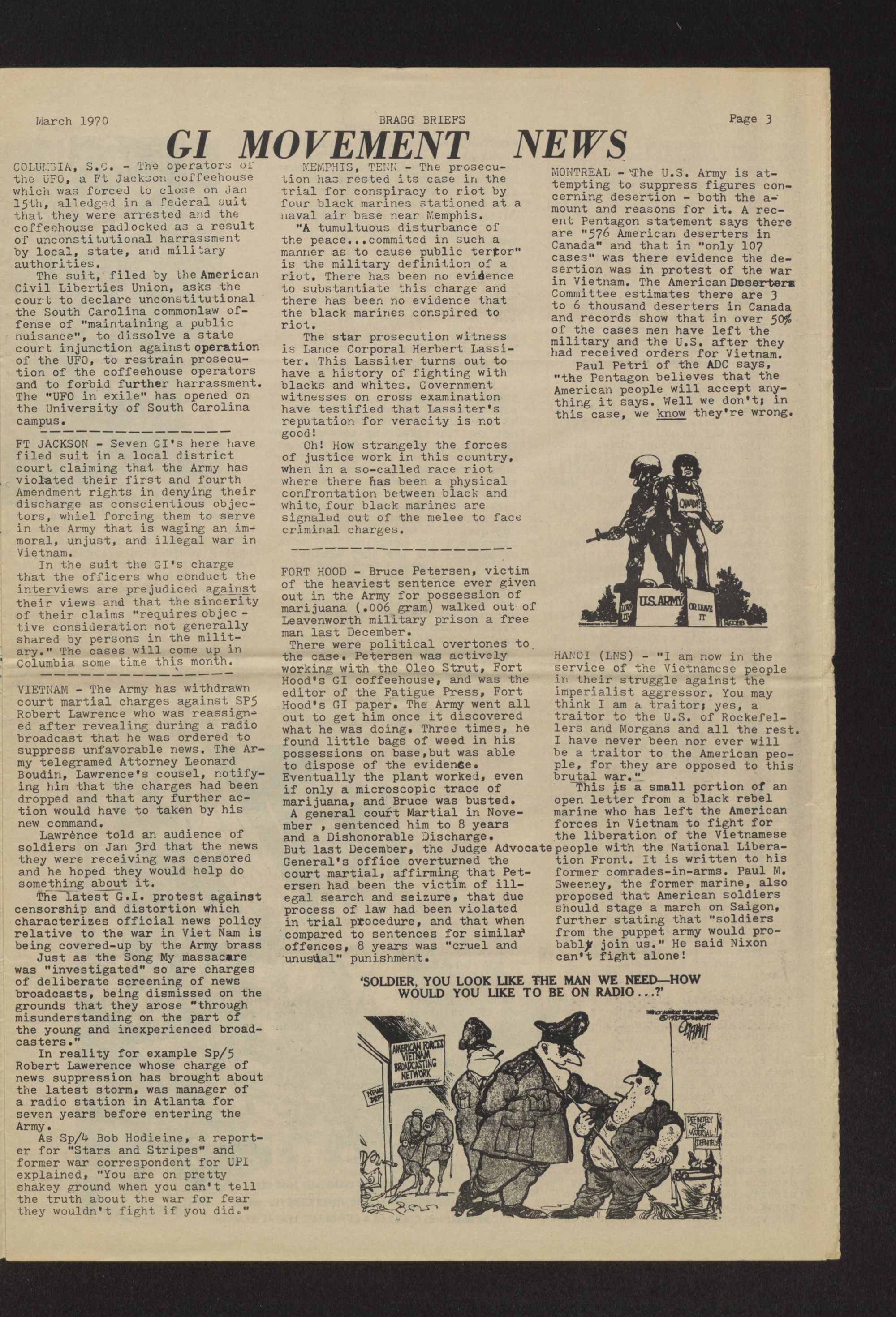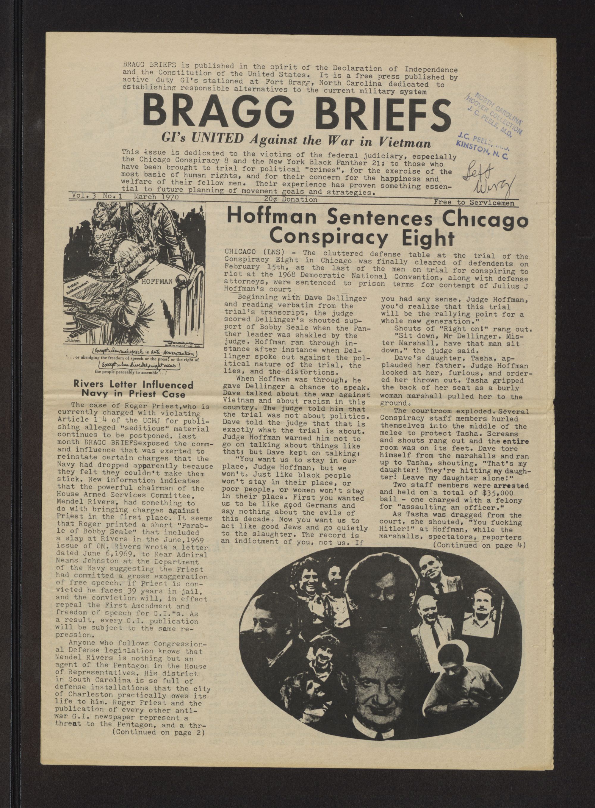 Bragg briefs. Vol 3, no. 1. Volume 3. No 1. March 1970. Bragg briefs is published in the spirit of the Declaration of Independence and the Constitution of the United States. It is a free press published by active duty GI's stationed at Fort Bragg, North Carolina dedicated to establishing responsible alternatives to the current military system. This issue is dedicated to the victims of the federal judiciary, especially the Chicago Conspiracy 8 and the New York Black Panther 21. The papers were passed out to service men at Fort Bragg in Fayetteville, N.C.