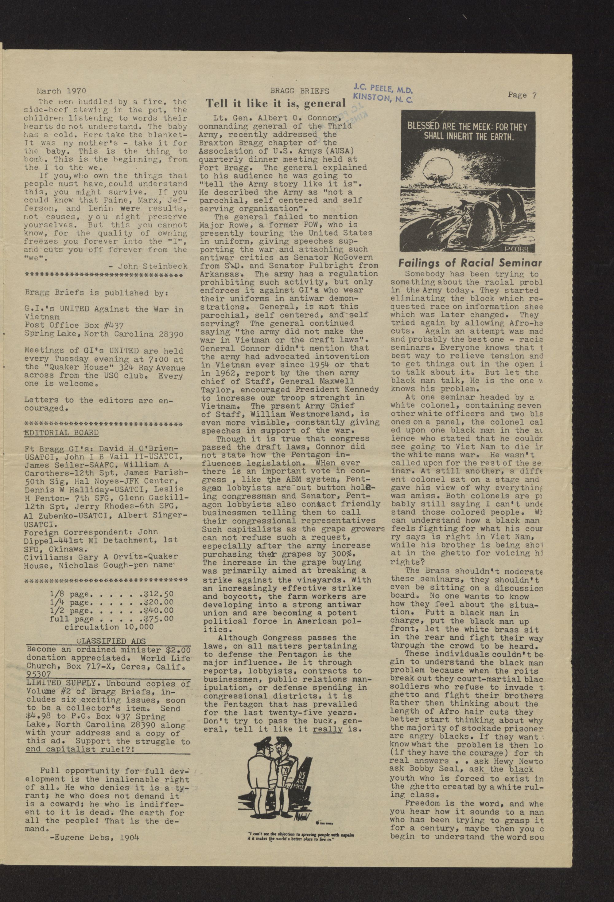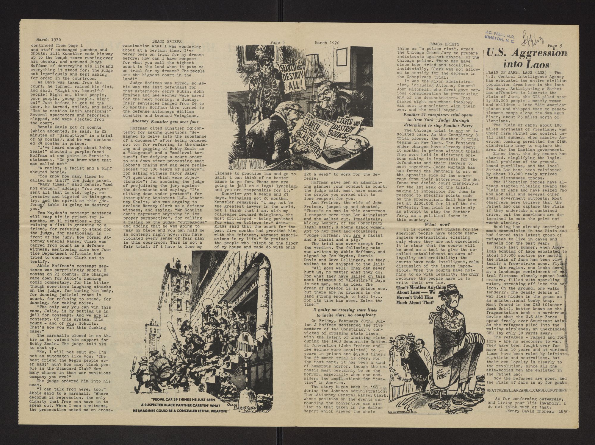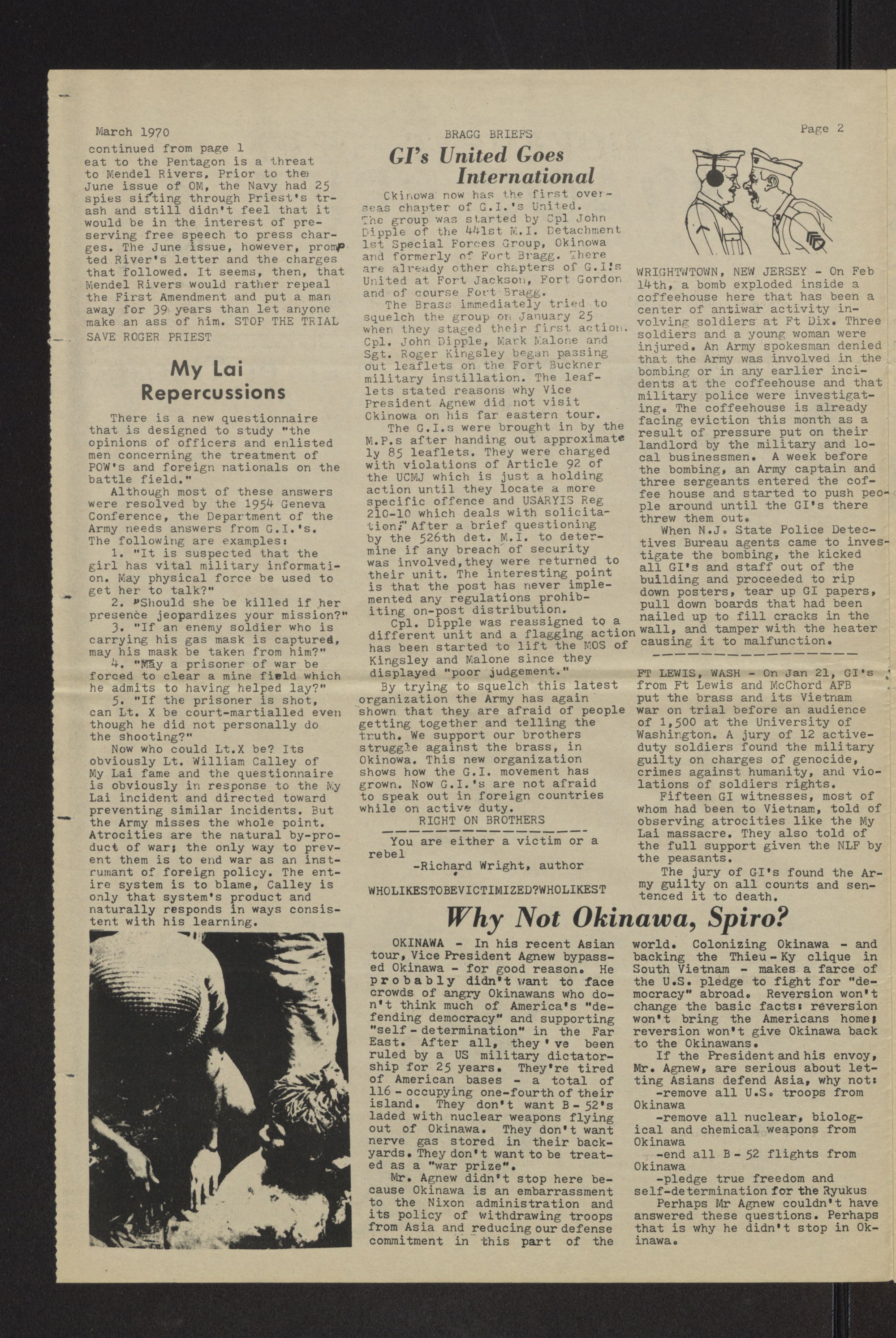 Bragg briefs. Vol 3, no. 1. Volume 3. No 1. March 1970. Bragg briefs is published in the spirit of the Declaration of Independence and the Constitution of the United States. It is a free press published by active duty GI's stationed at Fort Bragg, North Carolina dedicated to establishing responsible alternatives to the current military system. This issue is dedicated to the victims of the federal judiciary, especially the Chicago Conspiracy 8 and the New York Black Panther 21. The papers were passed out to service men at Fort Bragg in Fayetteville, N.C.