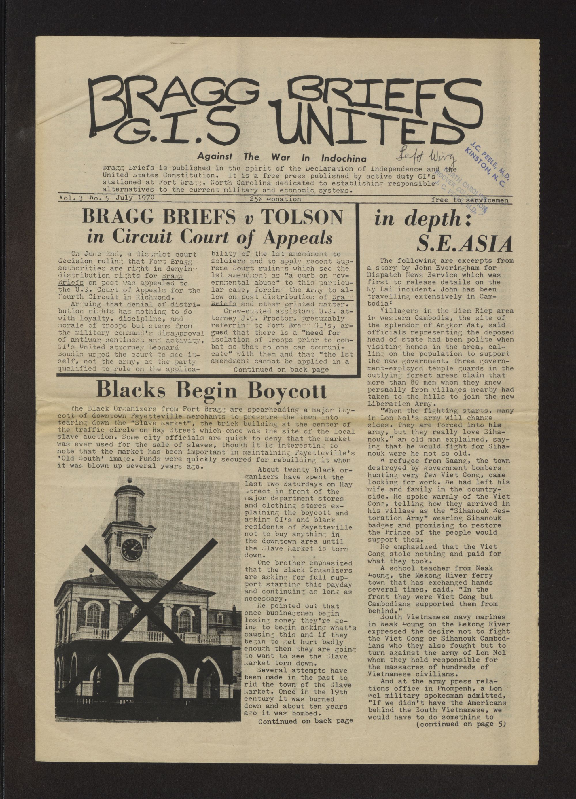 Bragg briefs. Vol. 3, no 5. July 1971. Bragg briefs is published in the spirit of the Declaration of Independence and the Constitution of the United States. It is a free press published by active duty GI's stationed at Fort Bragg, North Carolina dedicated to establishing responsible alternatives to the current military system. The papers were passed out to service men at Fort Bragg in Fayetteville, N.C.