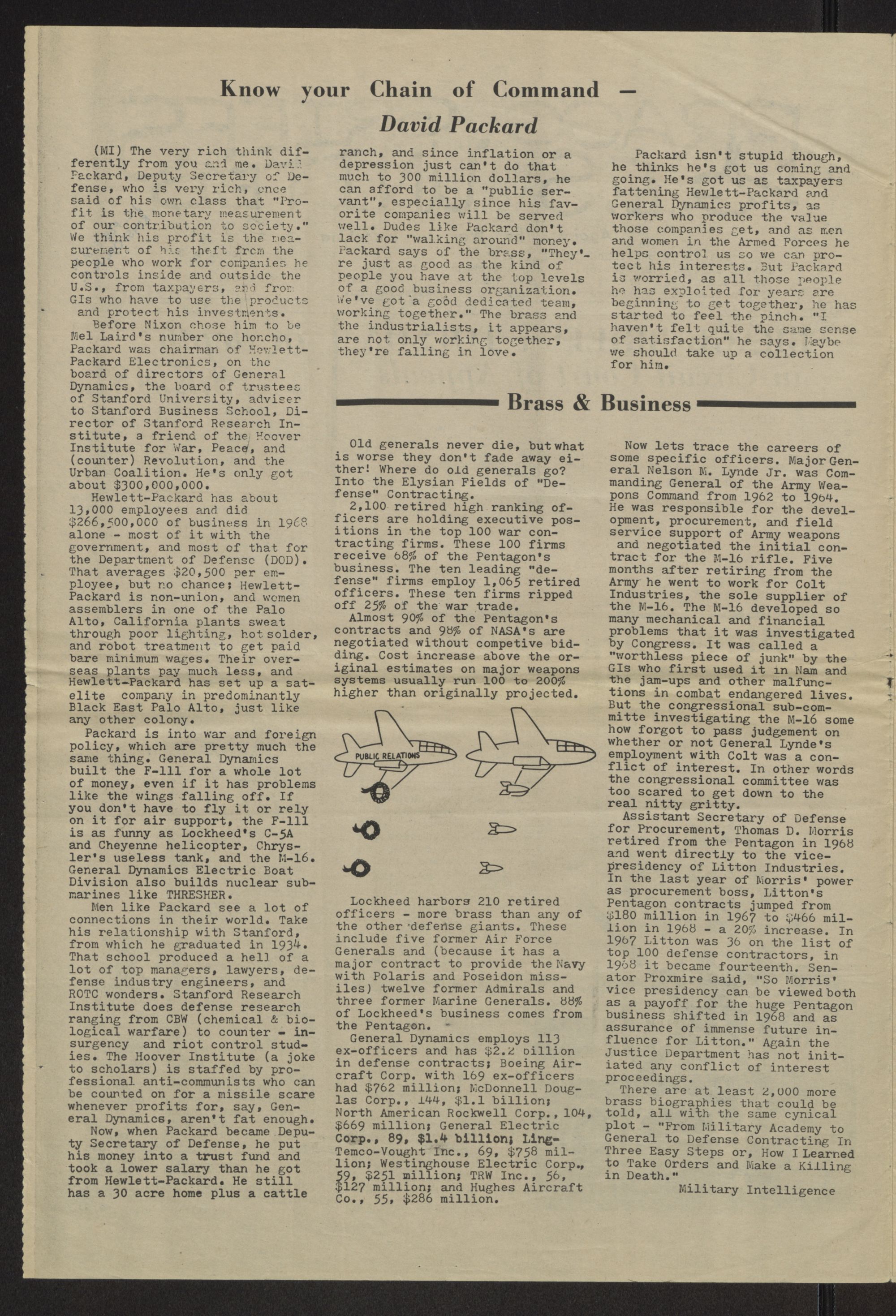 Men like Packard see a lot of connections in their world. Take his relationship with Stanford, from which he graduated in 1934. That school produced a hell of a lot of top managers, lawyers, defense industry engineers, and ROTC wonders. Stanford Research Institute does defense research ranging from CBW (chemical & biological warfare) to counter - insurgency and riot control studies. The Hoover Institute (a joke to scholars) is staffed by professional anti-communists who can be courted on for a missile scare whenever profits for, say, General Dynamics, aren't fat enough.