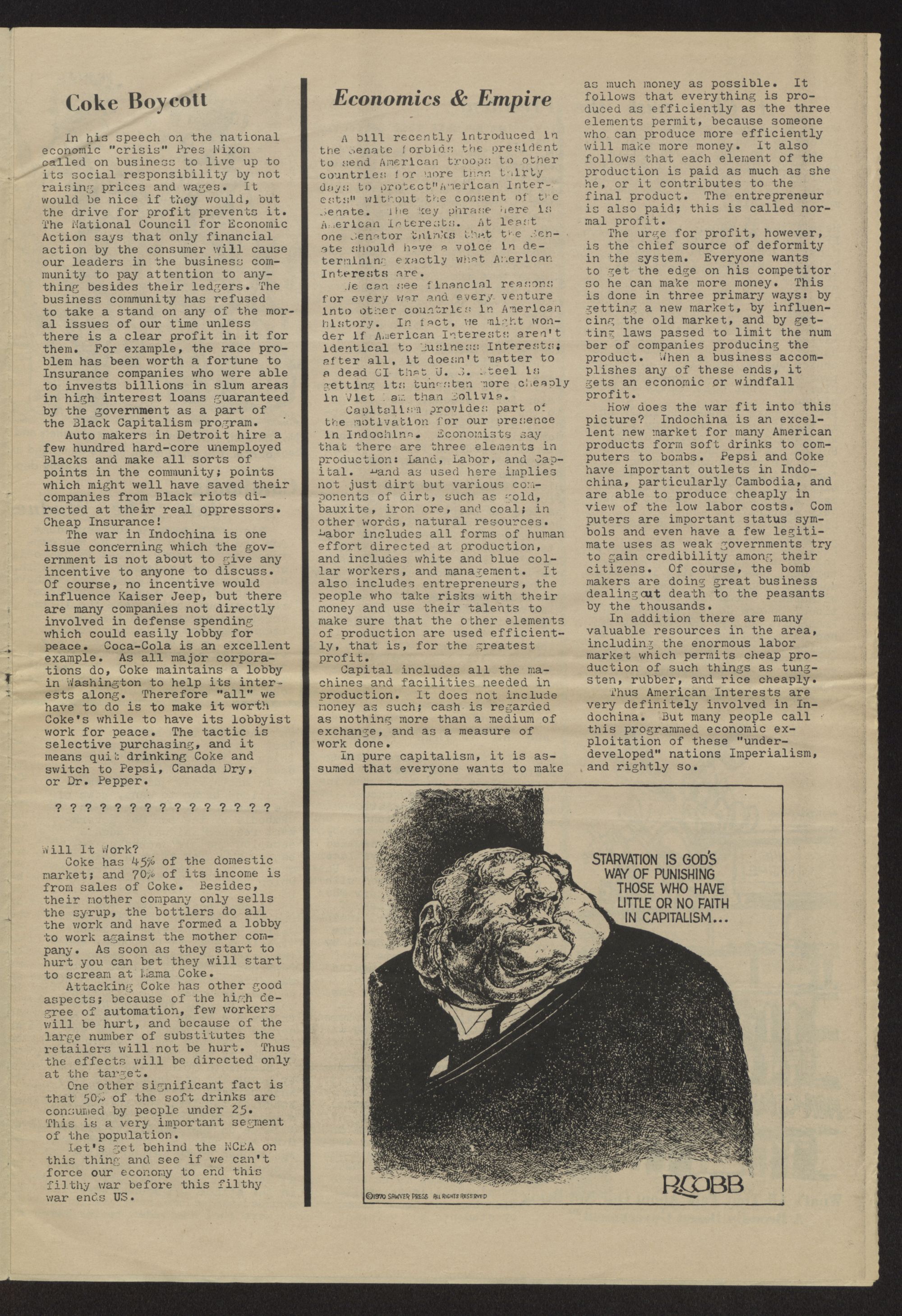 The war in Indochina is one issue concerning which the government is not about to give any incentive to anyone to discuss. Of course, no incentive would influence Kaiser Jeep, but there are many companies not directly involved in defense spending; which could easily lobby for peace. Coca-Cola is an excellent example. As all major corporations do, Coke maintains a lobby in Washington to help its interests along. Therefore "all" we have to do is to make it worth Coke's while to have its lobbyist work for peace. The tactic is selective purchasing, and it means quit drinking Coke and switch to Pepsi, Canada Dry,