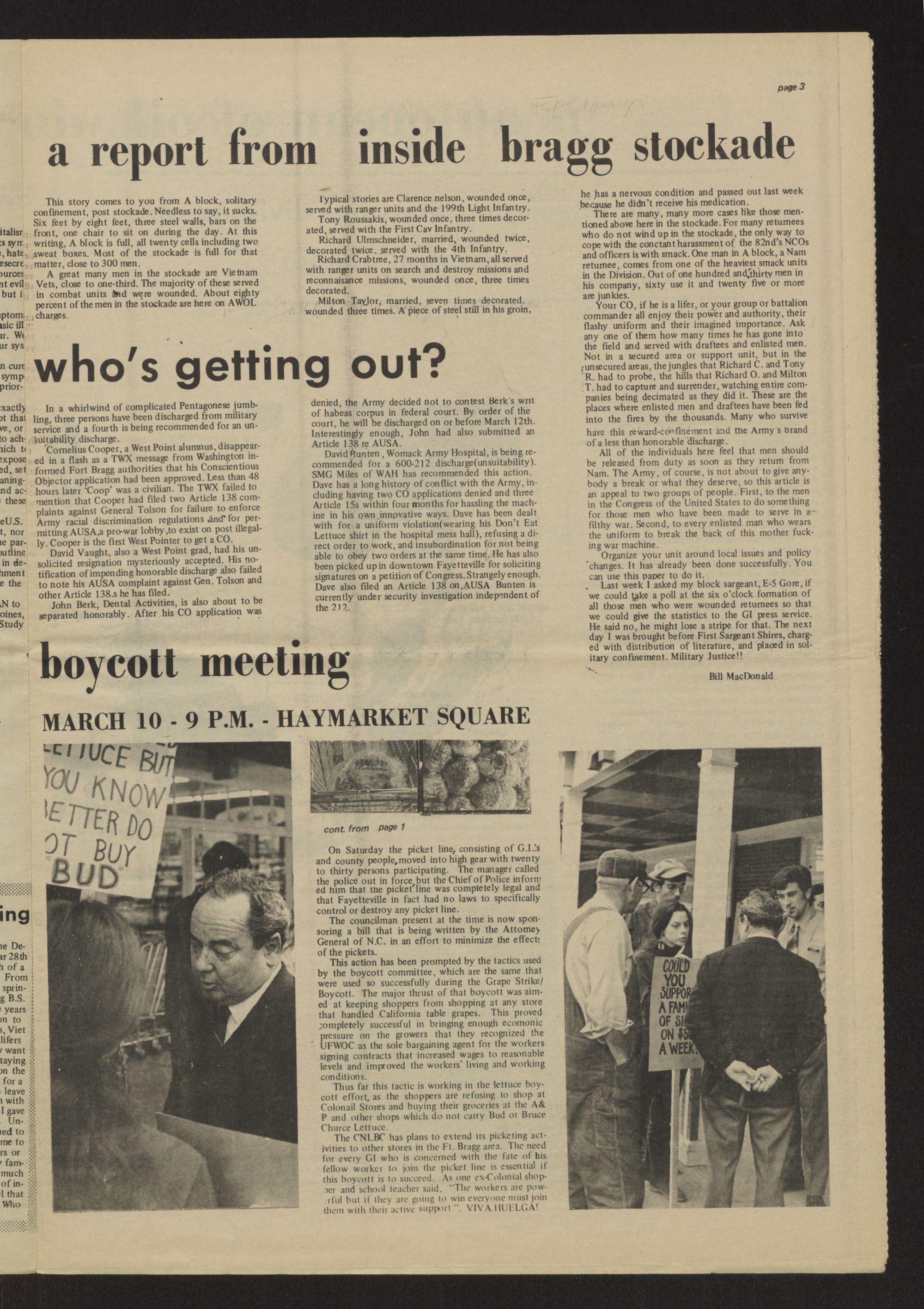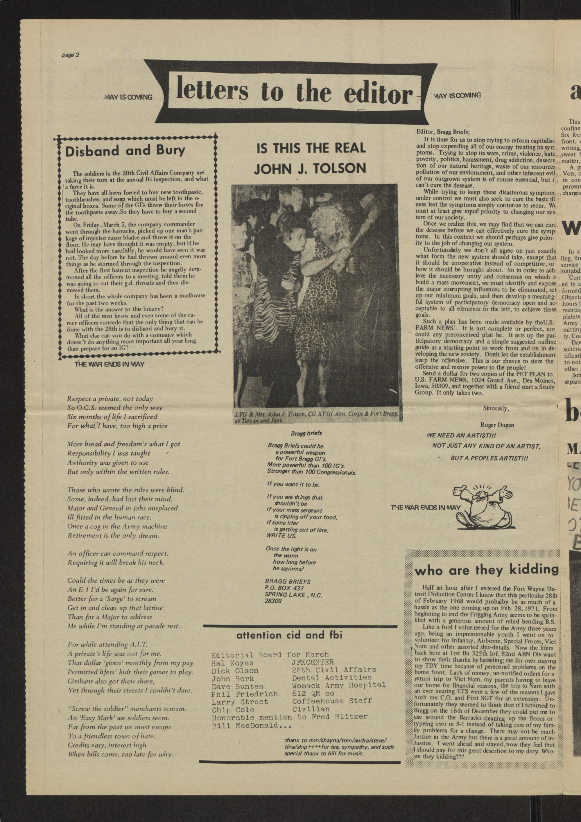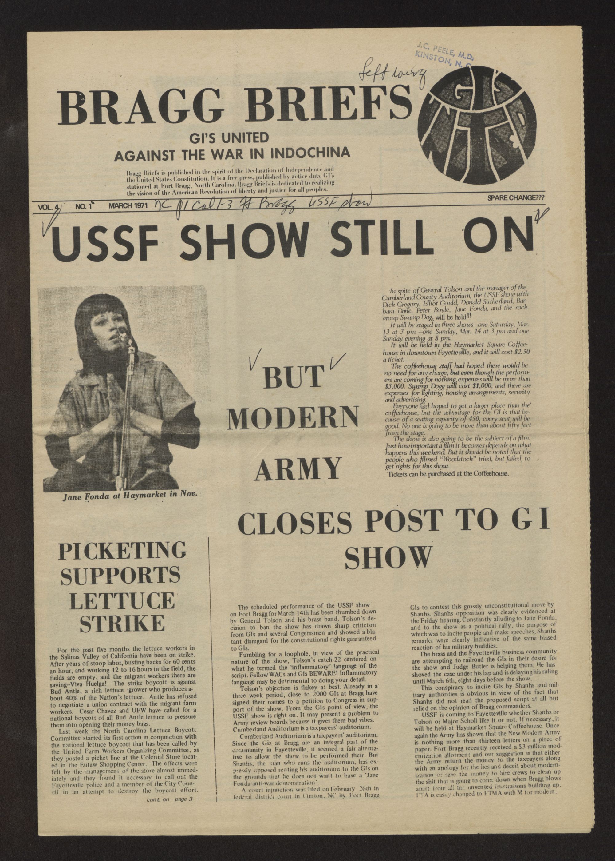 Bragg briefs. Vol. 4, no. 1. March 1971. Bragg briefs is published in the spirit of the Declaration of Independence and the Constitution of the United States. It is a free press published by active duty GI's stationed at Fort Bragg, North Carolina dedicated to establishing responsible alternatives to the current military system. The papers were passed out to service men at Fort Bragg in Fayetteville, N.C.