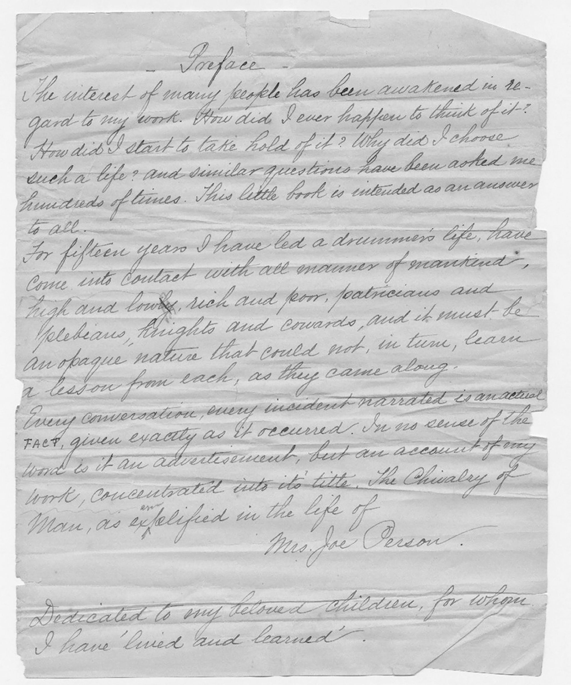 Every conversation, every incident narrated is an actual FACT, given exactly as it occurred. In no sense of the word is it an advertisement, but an account of my work, concentrated into its title--The Chivalry of Man, as exemplified in the life of Mrs. Joe Person.