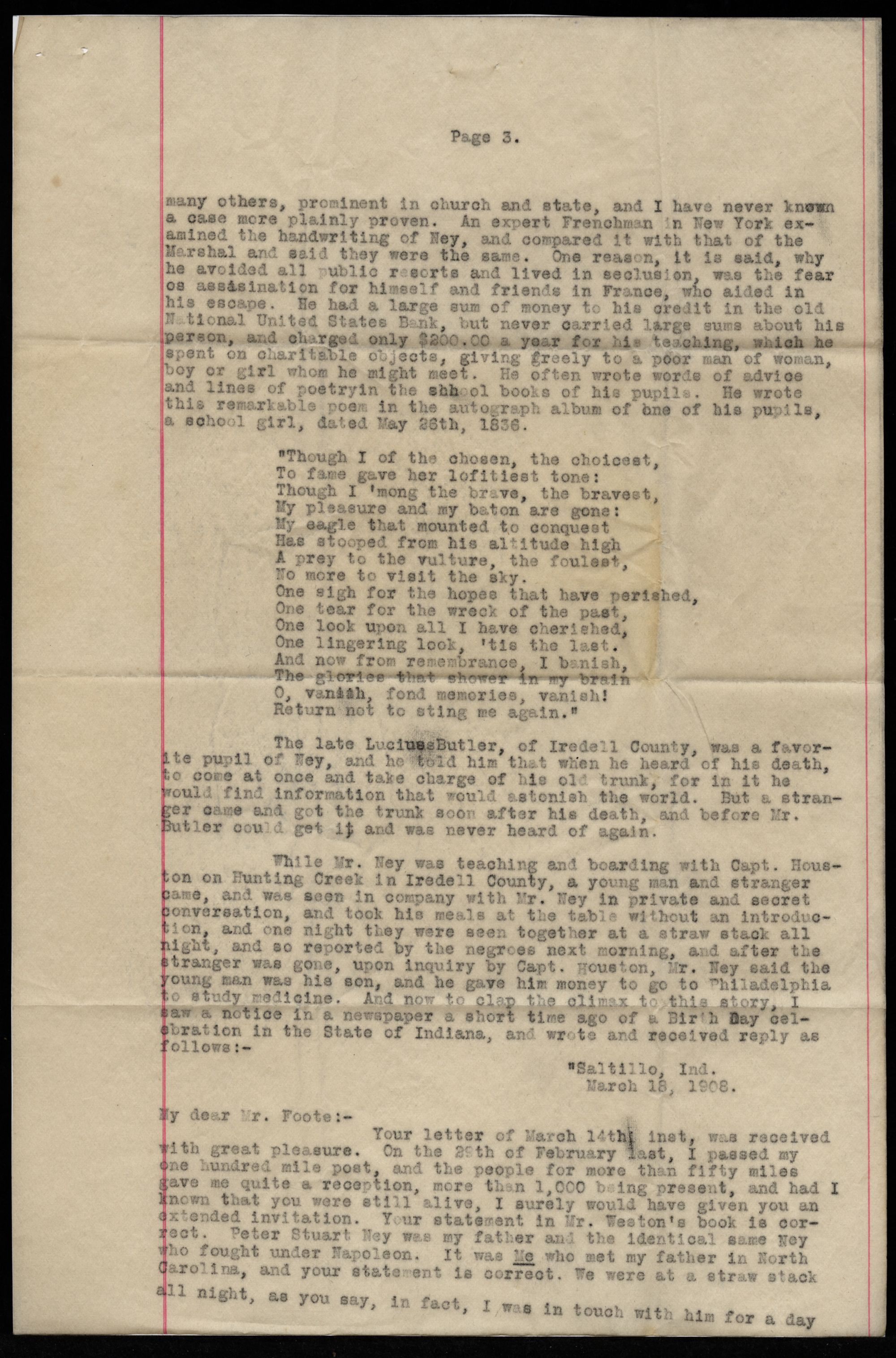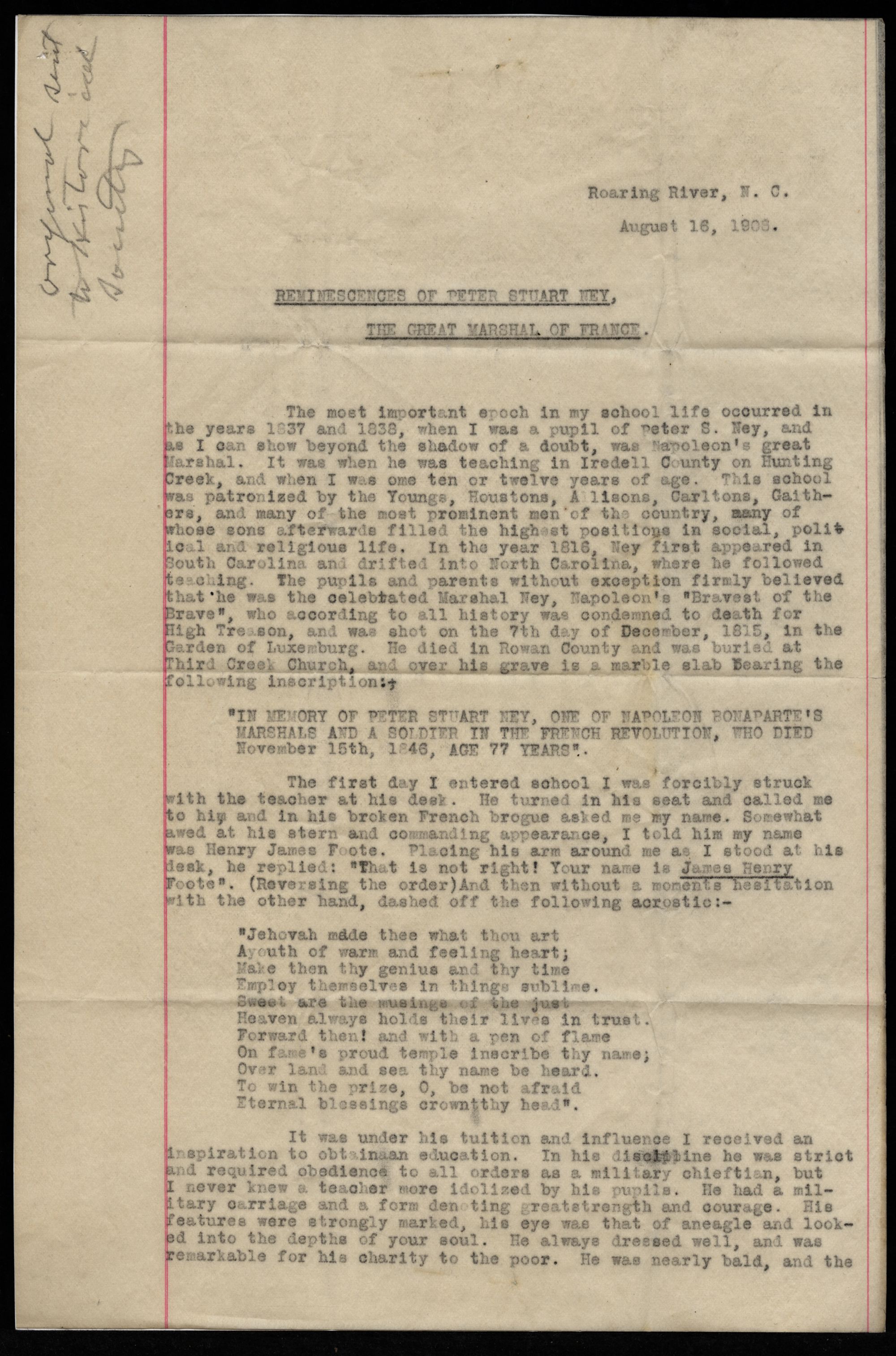 Michel Ney, 1st Duc d’Elchingen, 1st Prince de la Moskowa, popularly known as Marshall Ney was a eighteenth and nineteenth century French military commander. After service during the French Revolutionary Wars and the Napoleonic Wars, Ney fell out of favor and was arrested and condemned to death for treason in December of 1815. In January of 1816 Peter Stuart Ney arrived at Charleston, SC., where he subsequently disappeared. In 1821 he appeared in Mocksville, NC where he assumed the position of a school teacher. He also worked as a teacher in Hillsborough, Salisbury and Mecklenburg county before returning again to Mocksville. He died there on 15 November 1826 and is buried at the Third Creek Presbyterian Church. This document typed in August of 1908 at Roaring River, NC, relates the life of Peter Stuart Ney, the Great Marshall of France. In the relation Peter Stuart Ney’s grandson, E. M. C. Neyman of Saltillo, IN, states that his grandfather was in fact the Michel Ney. This document is signed by James H. Foote, born 8 November 1825 and “is taken as proof that the old Tar Heel Teacher was the Great Marshall of France.” At the bottom the relation is noted as being done “at the request of my friend, Judge Allen.” A pencil notation on the first page states “copyied and sent to the Historical Society.”