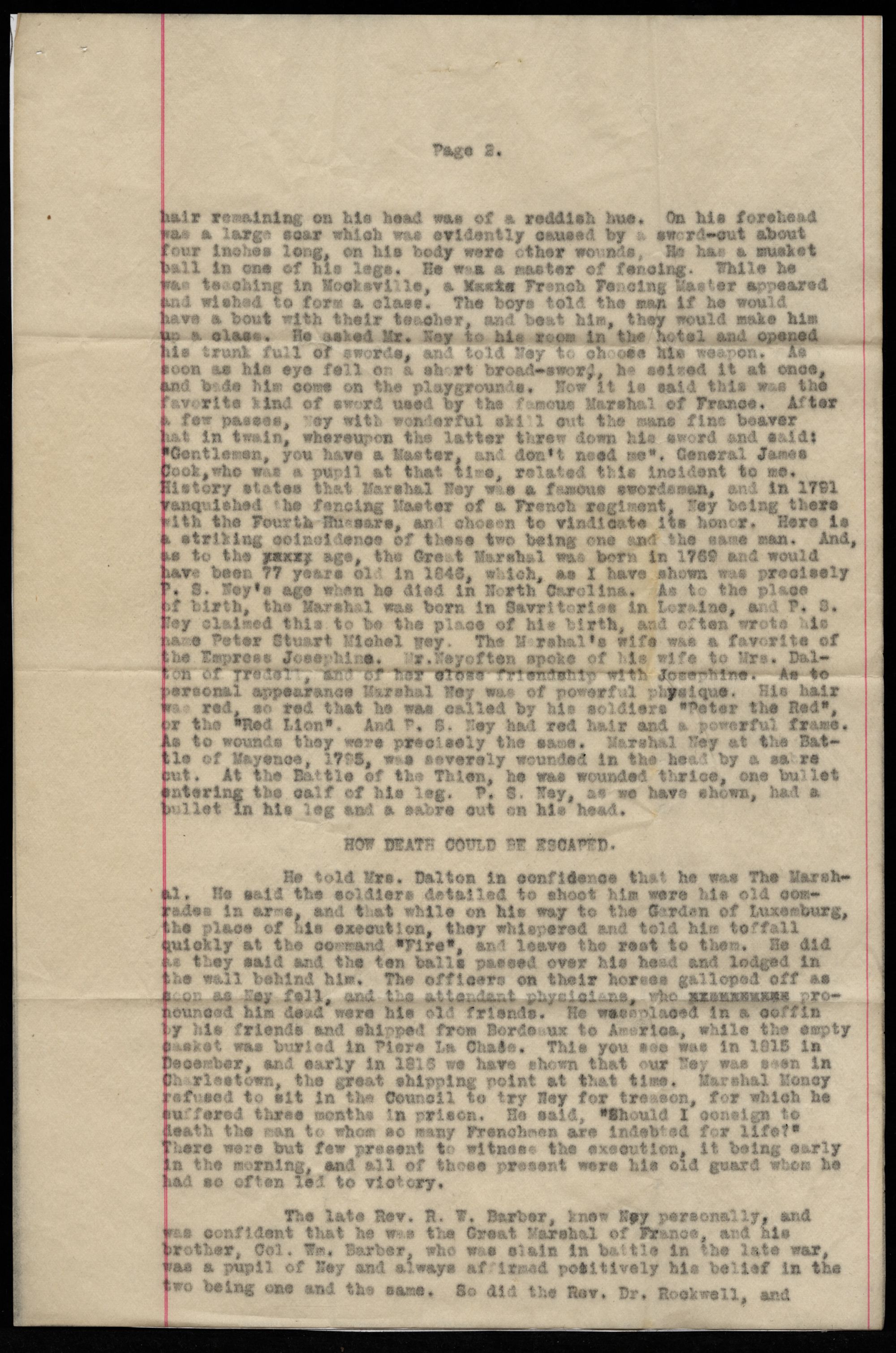 hair remaining on his head was of a reddish hue. On his forehead was a large soar which was evidently caused by a sword-cut about four inches long, on his body were other wounds, He has a musket ball in one of his legs. He was a master of fencing. While he was teaching in Nooksville, a [illegible] French Fencing Master appeared and wished to form a class. The boys told the man if he would have a bout with their teacher, and beat him, they would make him up a class. He asked Mr. Ney to his room in the hotel and opened his trunk full of swords, and told Ney to choose his weapon. As soon as his eye fell on a short broad-sword, he seized it at once, and bade him come on the playgrounds. How it is said this was the favorite kind of sword used by the famous Marshal of France. After a few passes, Ney with a wonderful skill out the mans fine beaver hat in twain, whersupon the latter threw down his sword and said "Gentelman, you have a master and done need me". General James Cook, who was a pupil at that time, related this incident to me. History states that Marchal Ney was a famous swordsman and in 1791, vanquished the fencing Master of a French Regiment, Ney being there with the Fourth [illegible], and chosen to vindicate its honor. Here is a striking coincidence of these two being one and the same man. And as to the [illegible] age, the Great Marshal was born in 1769 and would have been 77 years olf in 1846, which as I have shown was precisely P.S. Ney's age when he died in North Carolina. As to the place of birth, the Marshal was born in [Savritorise] in Loraine and P.S. Ney claimed this to be the place of his birth, and often wrote his name Peter Stuart Nichel Ney. The Marshal's wife was a favorite of the Empress Joesphine. Mr. Neyoften spoke of his wife to Mrs. Dalton of Iredell, and of her close friendship with Josephine. As to personal appearance Marshal Ney was of powerful physique. His hair was red, so red that he was called by his soldiers "Peter the Red" or the "red Lion". And P.S. Ney had red hair and a powerful frame. As to the wounds there were precisely the same. Marshal Ney at the battle of Mayence, 1795, was severely wounded in the head by a sabre cut. At the Battle of the Thien, he was wounded thrice, one bullet entering the calf of his leg. P.S. Ney, as we have shown had a bullet in his leg and a sabre cut on his head