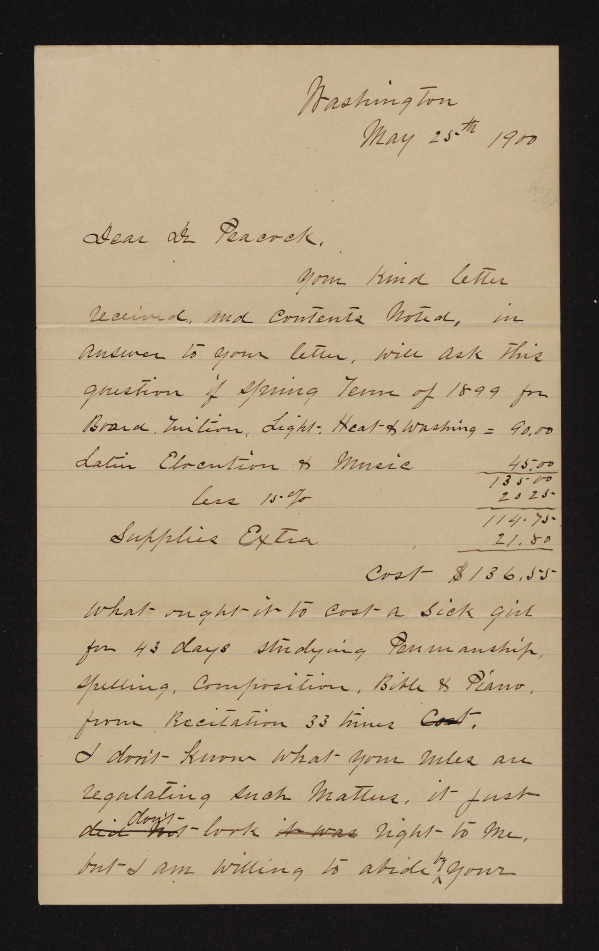 Your kind letter received, and contents noted. In answer to your letter, will ask this question. If Spring Term of 1899 for Board, Tuition, Light-, Heat- and Washington equals 90.00 Latin Elocution and Music + 45.00 = 135.00 Less 15 percent - 20.25 = 114.75 Supplies Extra + 21.80 = Cost $136.55 What ought it to cost a sick girl for 43 days studying Penmanship, Spelling, Composition, Bible and Piano, from Recitation 33 times.[?]