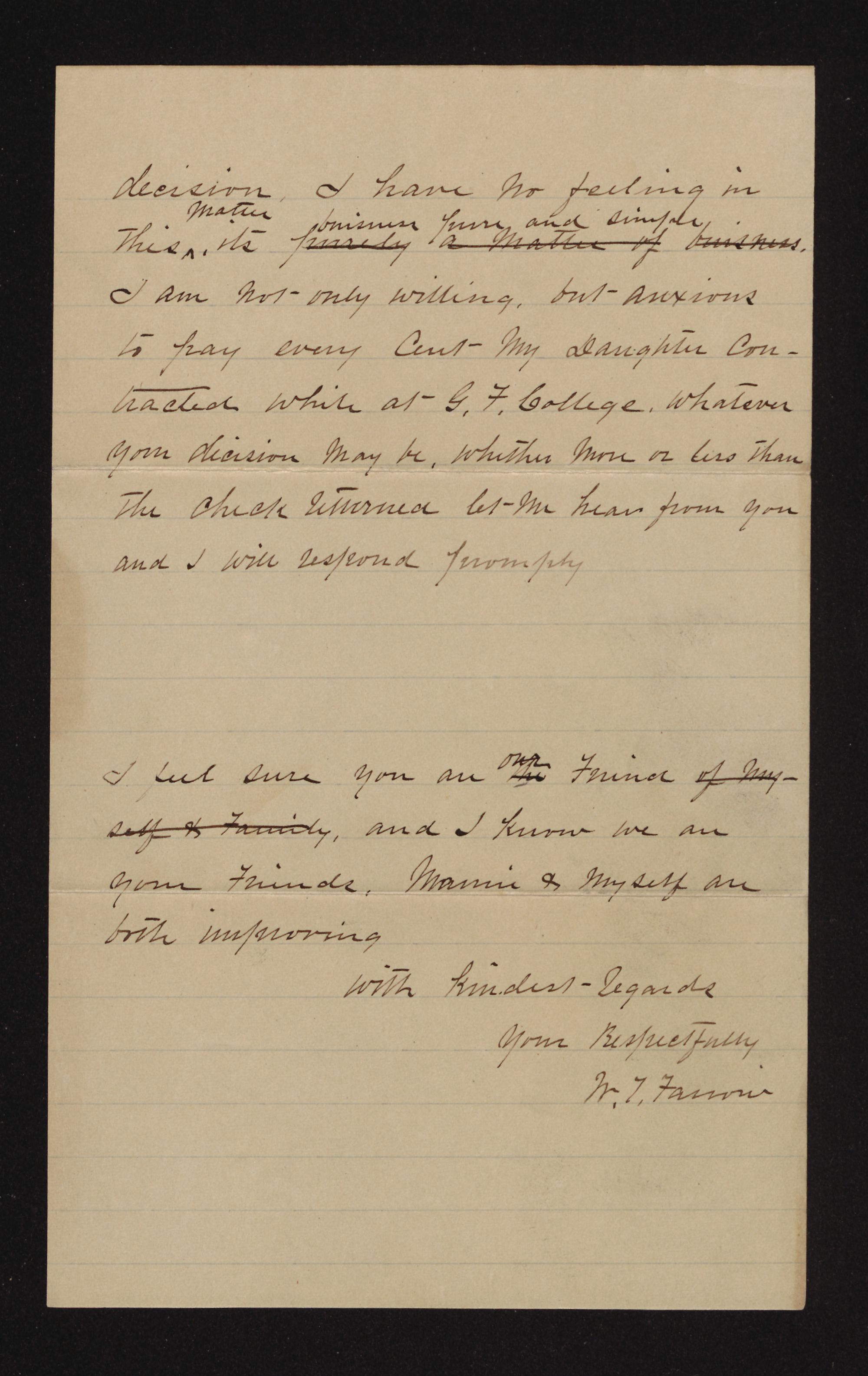 decision. I have no feeling in this matter. It's business pure and simple. I am not only willing, but anxious to pay every cent my daughter contracted while at G. F. College [Greensboro Female College]. Whatever your decision may be, whether more or less than the check returned let me hear from you and I will respond promptly.