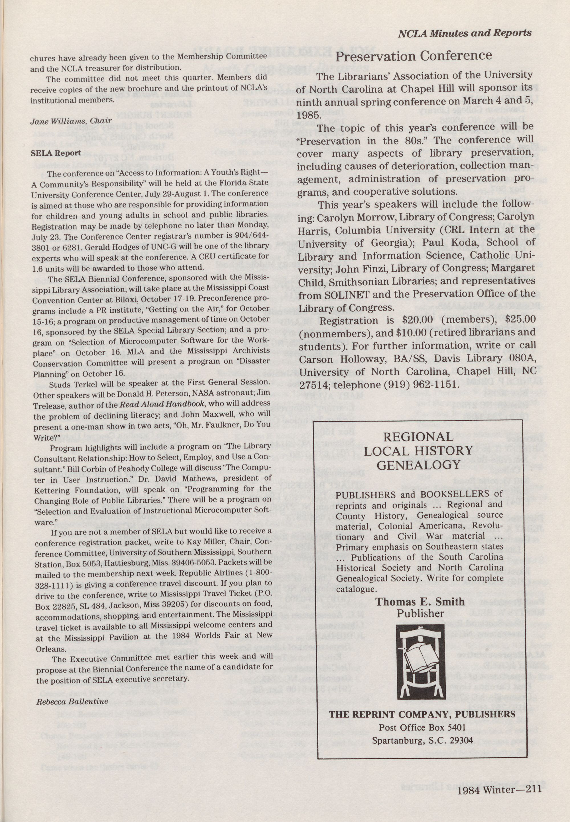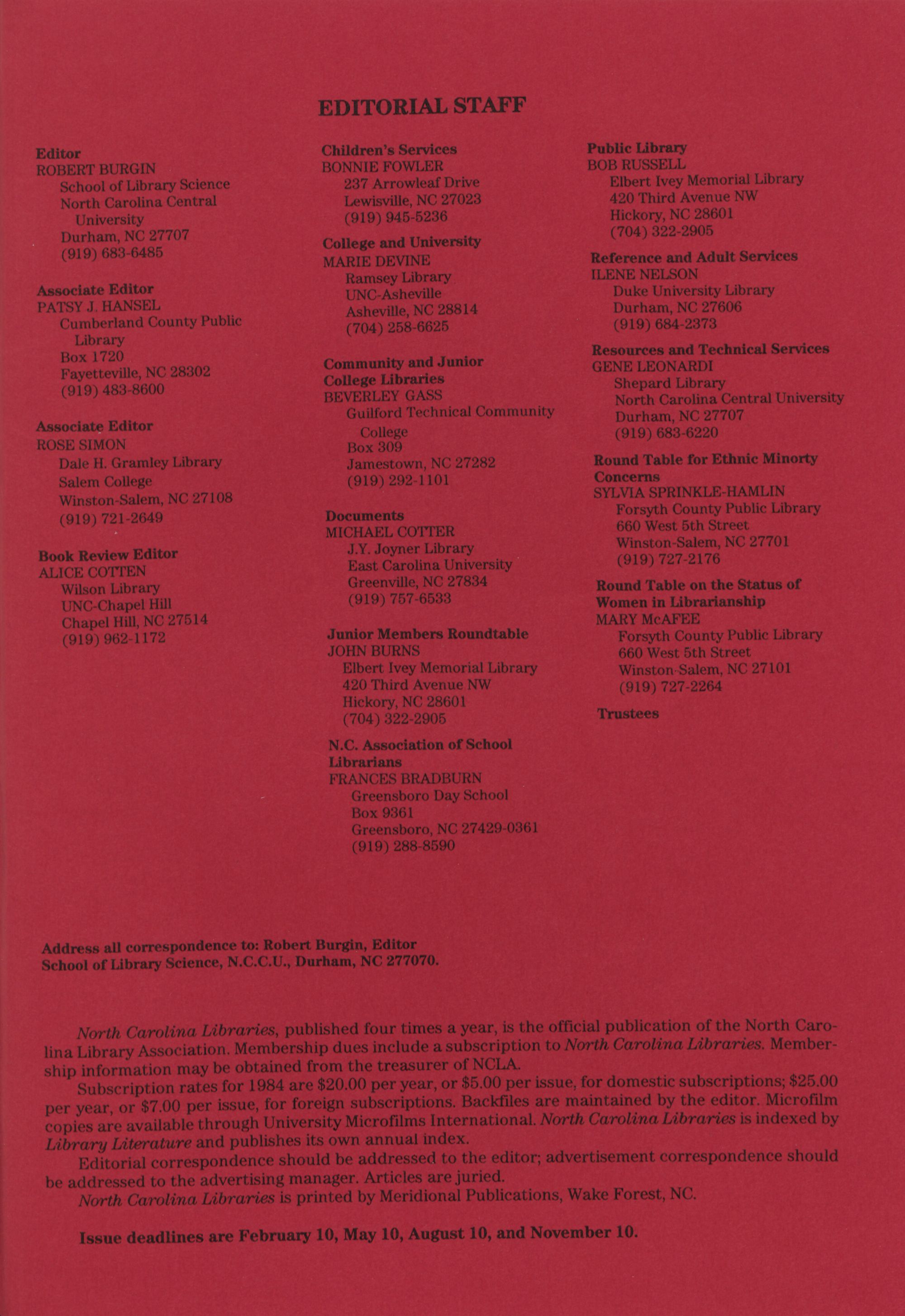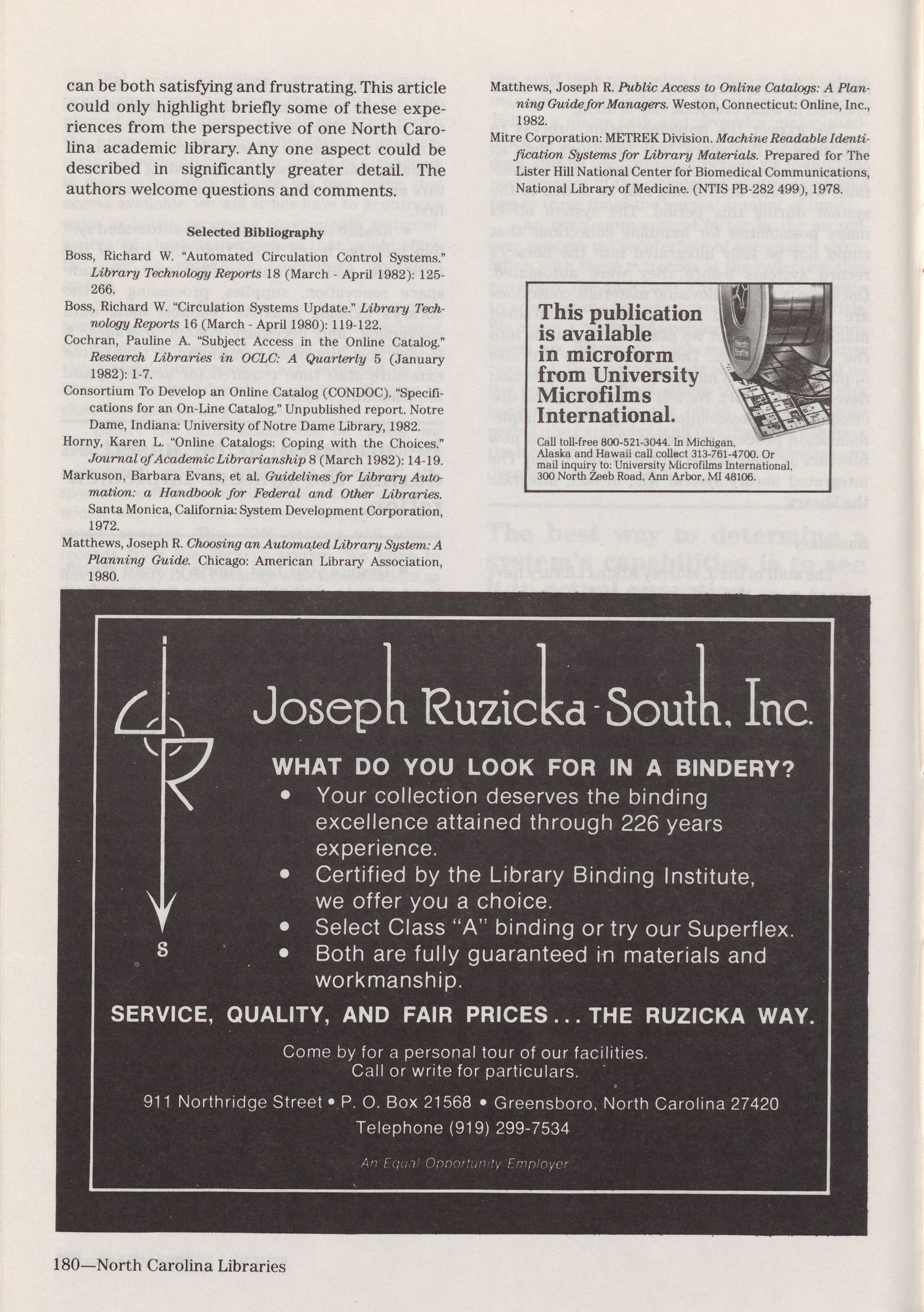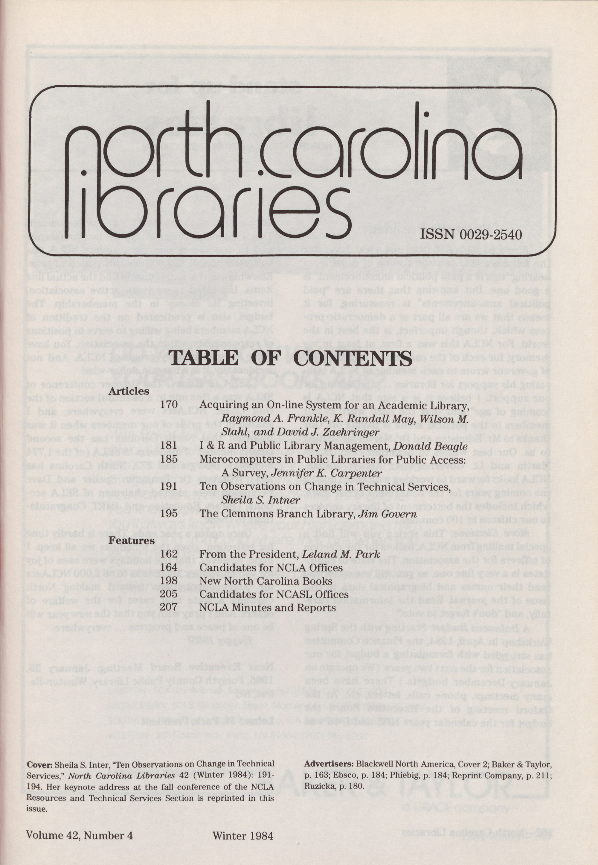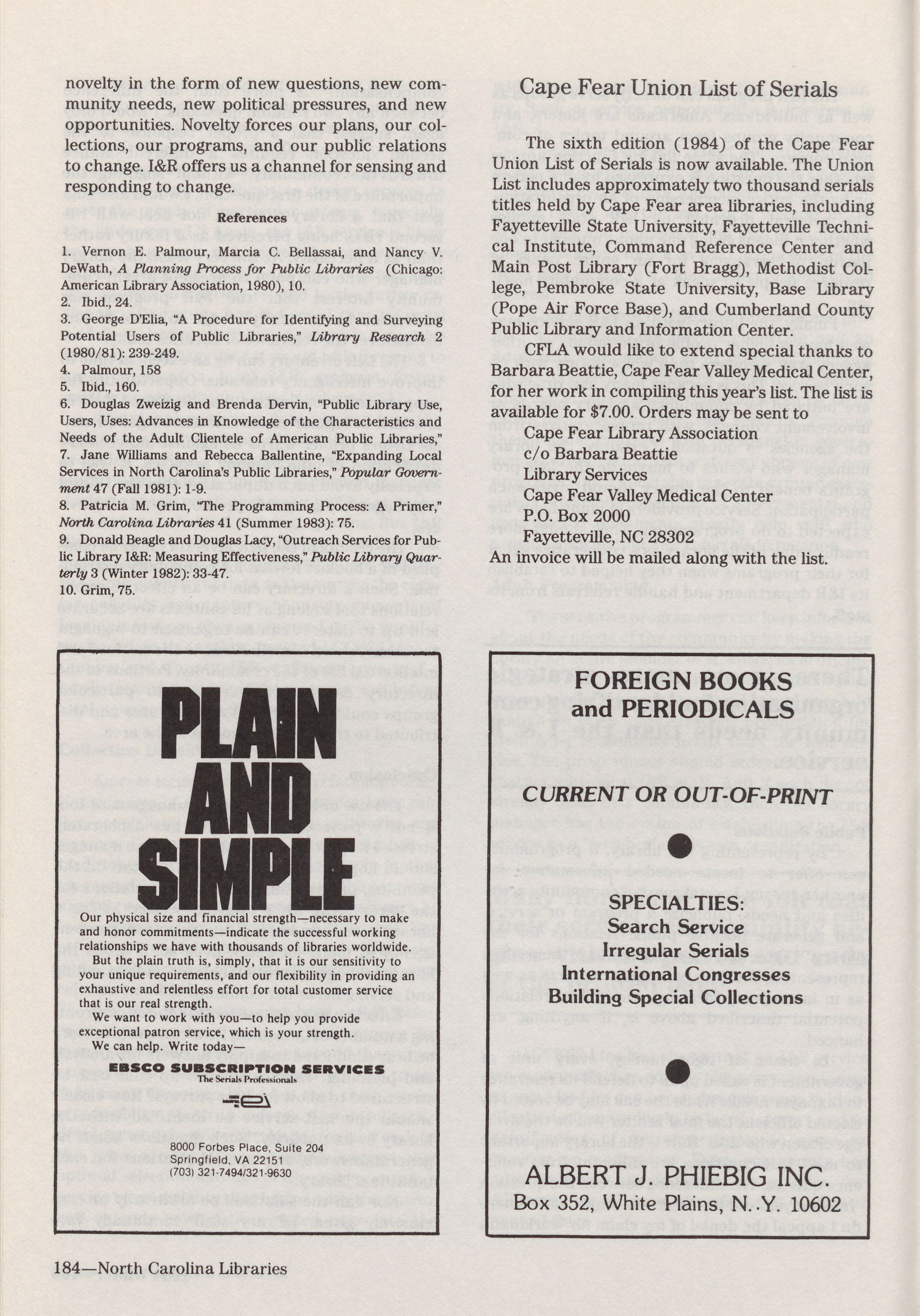 Services,� North Carolina Libraries 42 (Winter 1984): 191- p. 163; Ebsco, p. 184; Phiebig, p. 184; Reprint Company, p. 211;