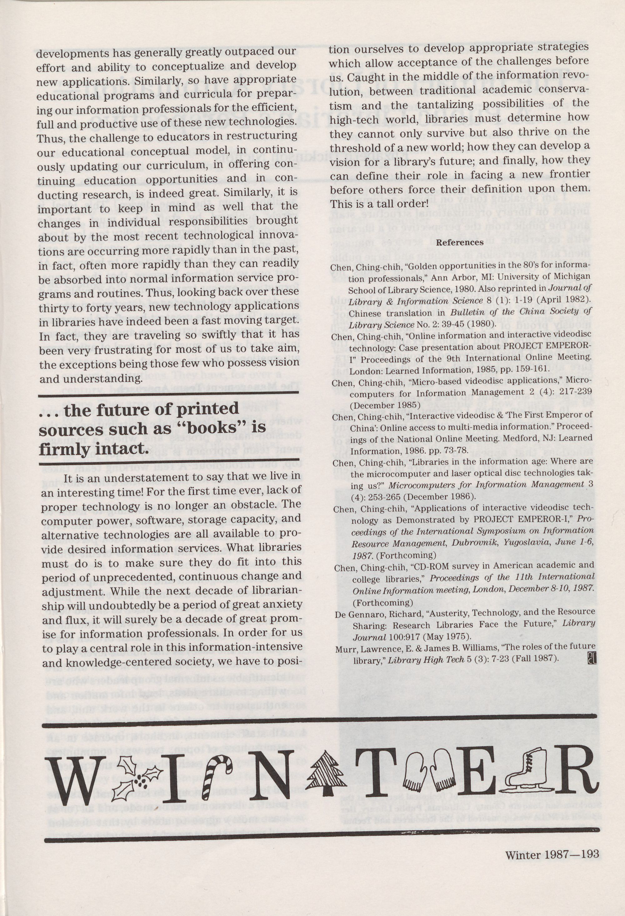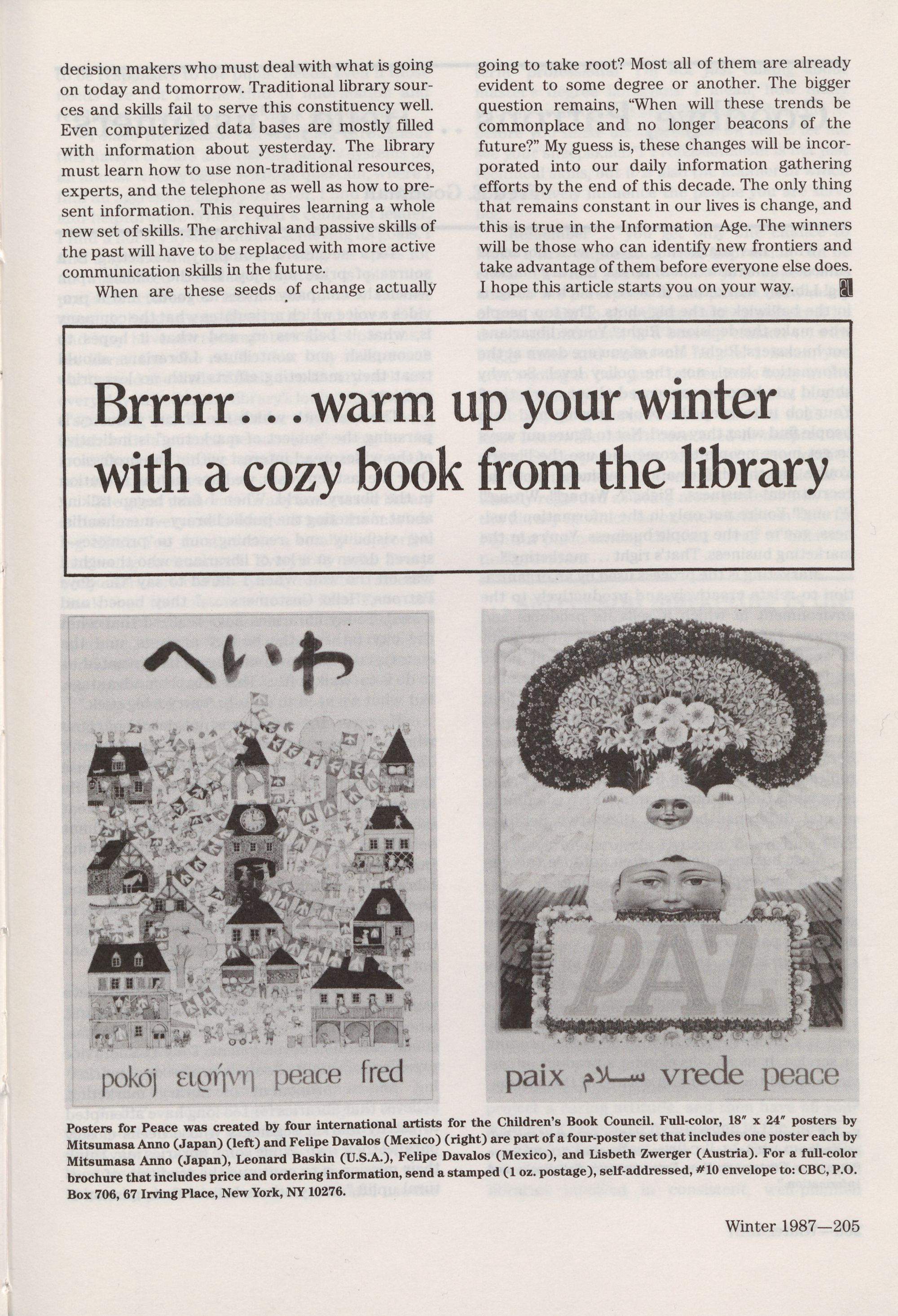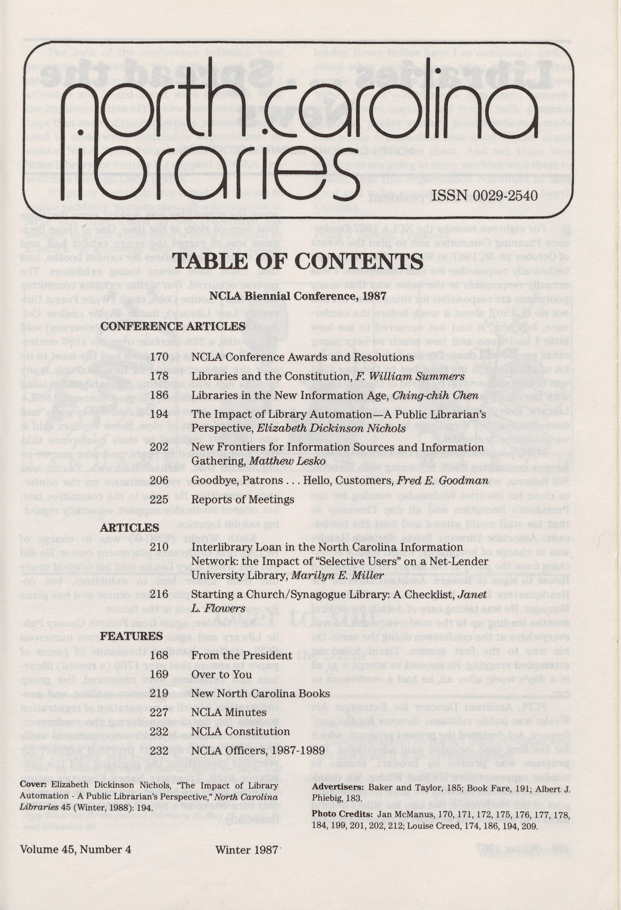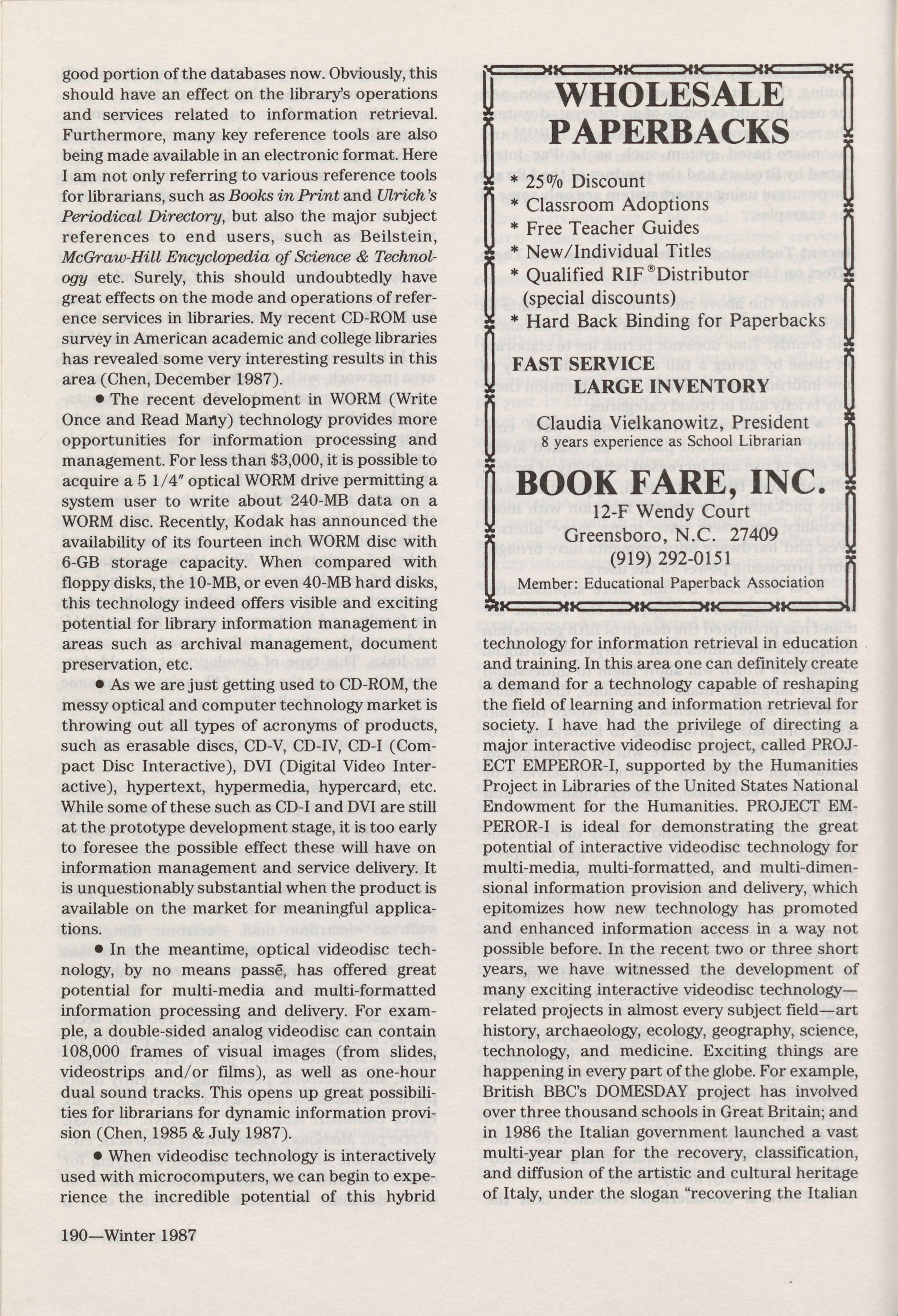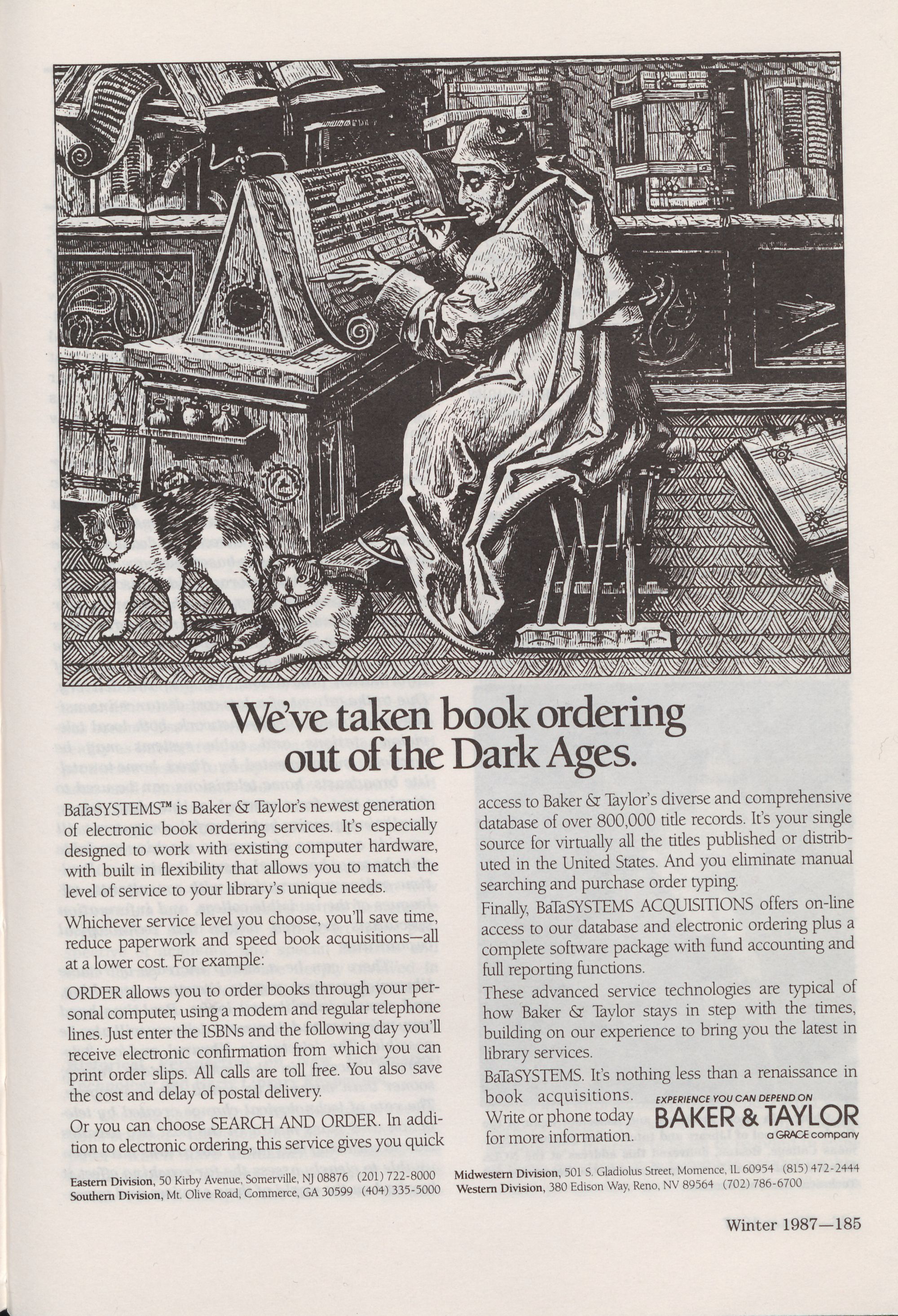 Cover: Elizabeth Dickinson Nichols, oThe Impact of Library Advertisers: Baker and Taylor, 185; Book Fare, 191; Albert J.
