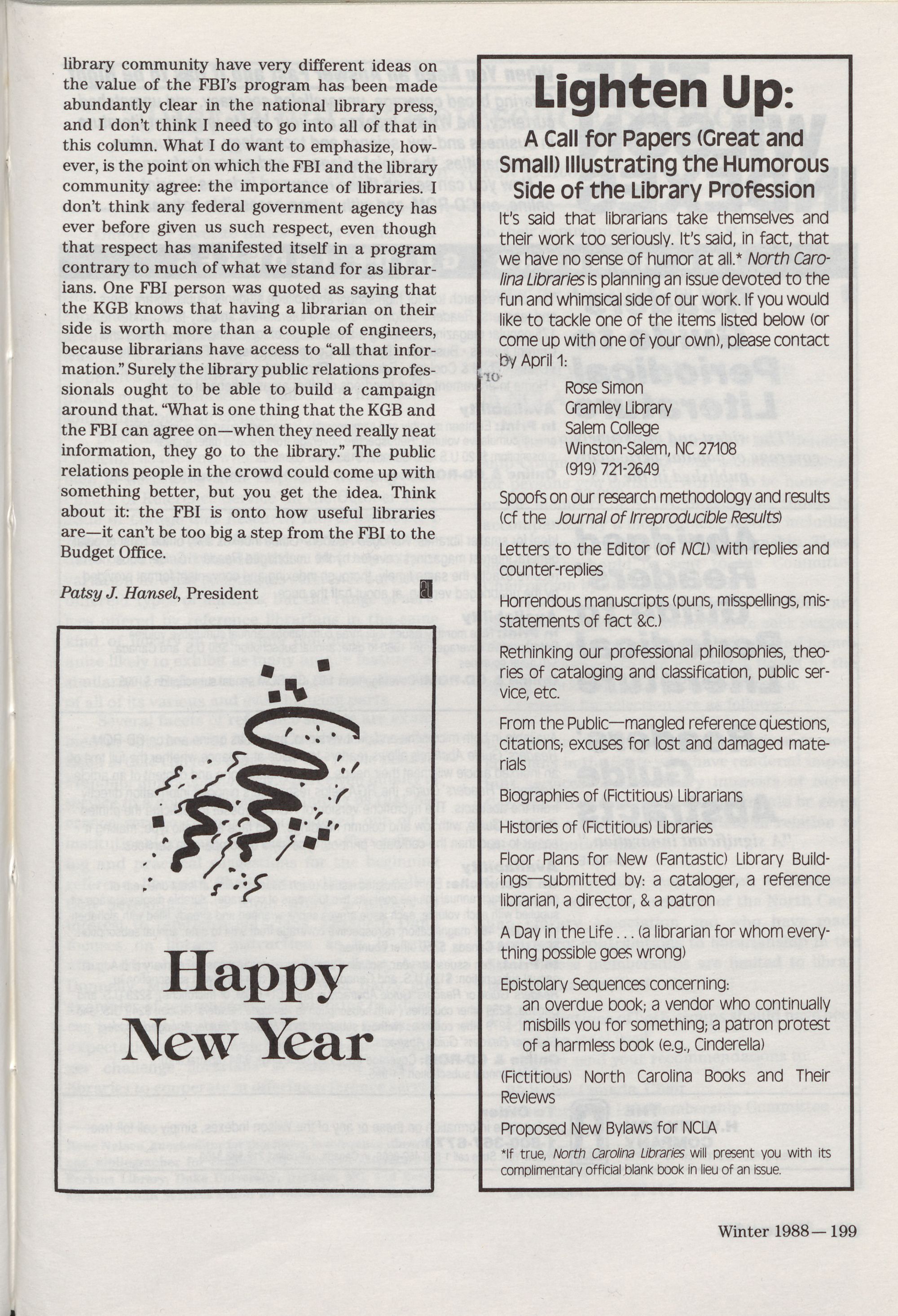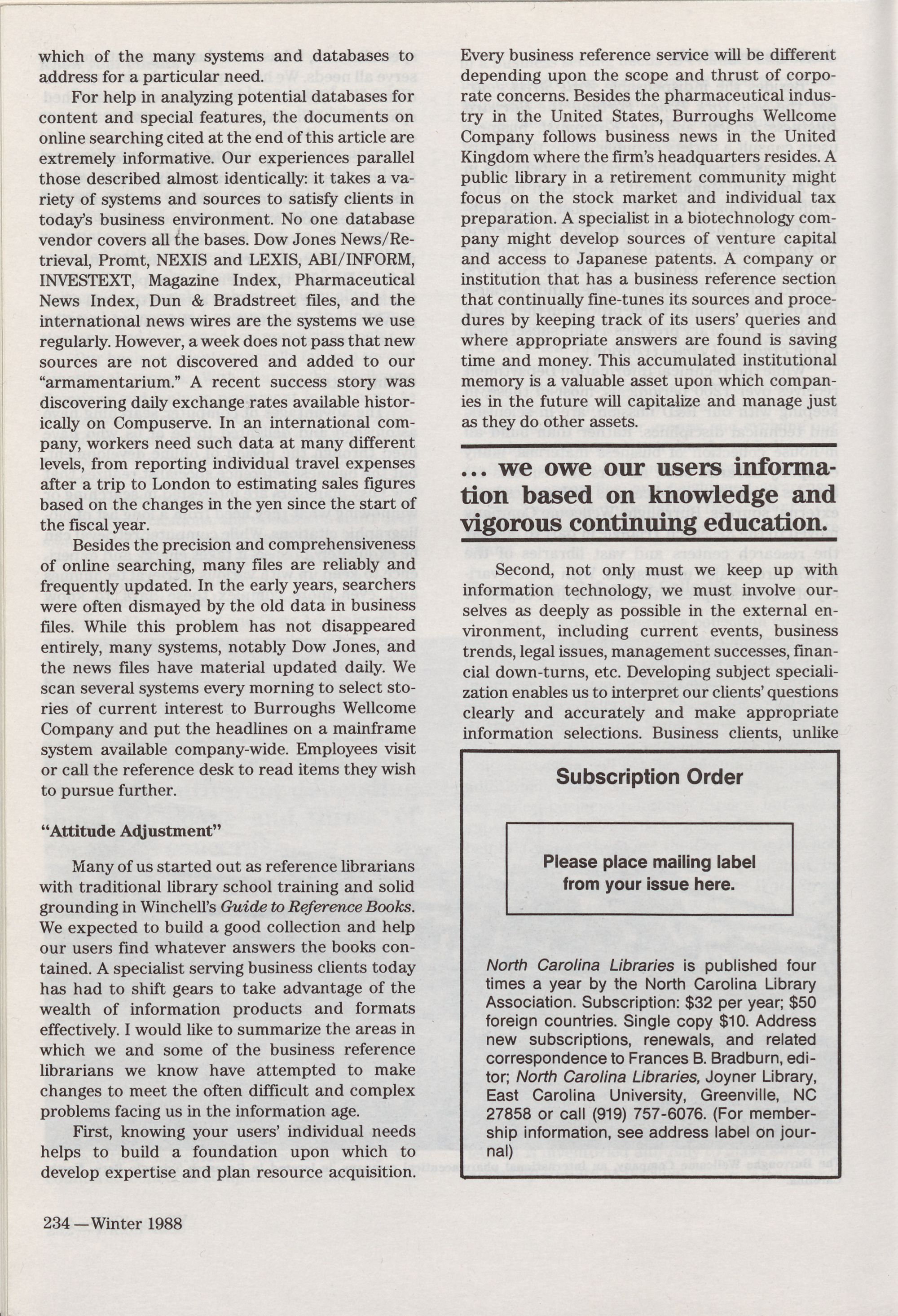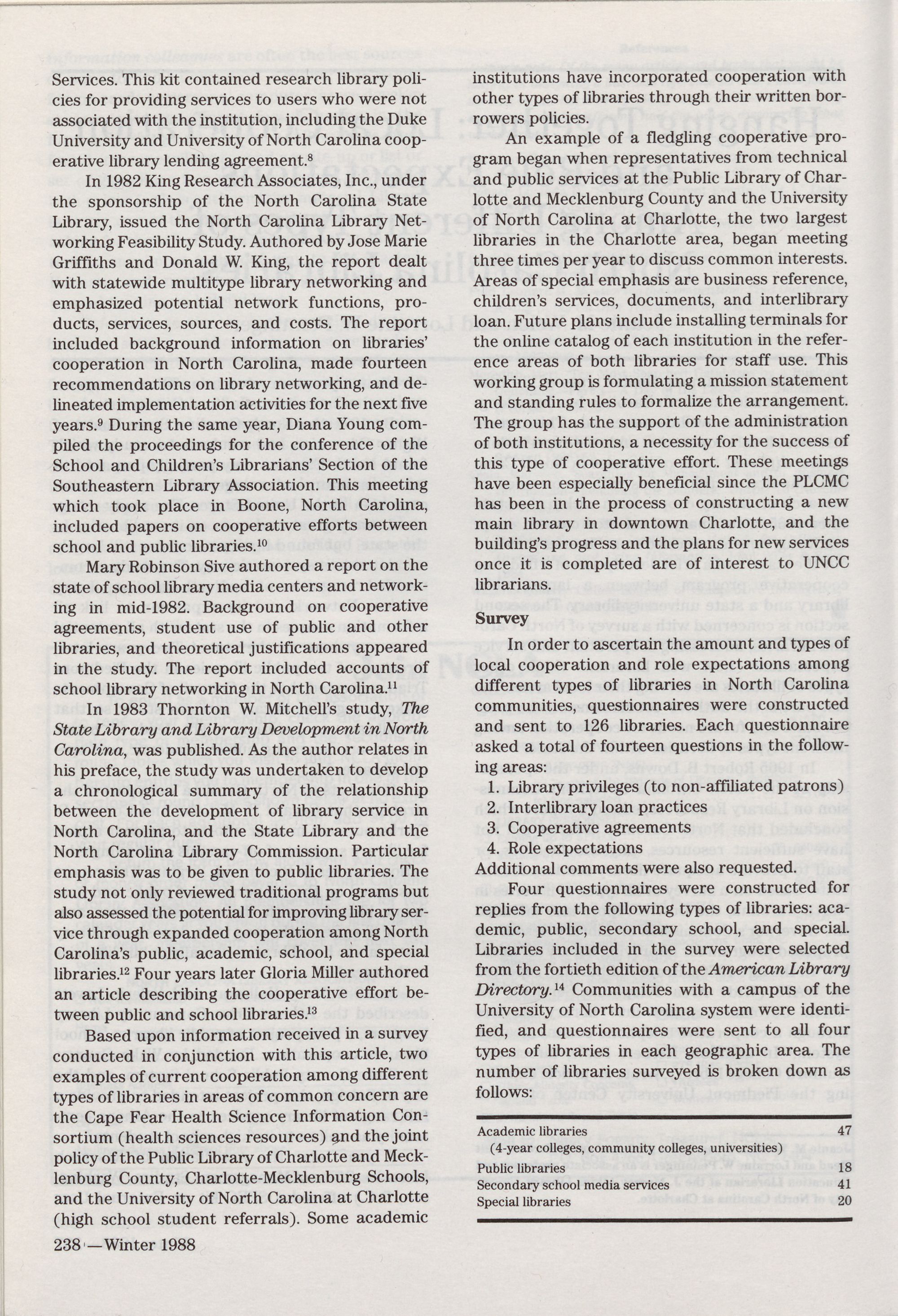North Carolina Libraries, published four times a year, is the official publication of the North Carolina