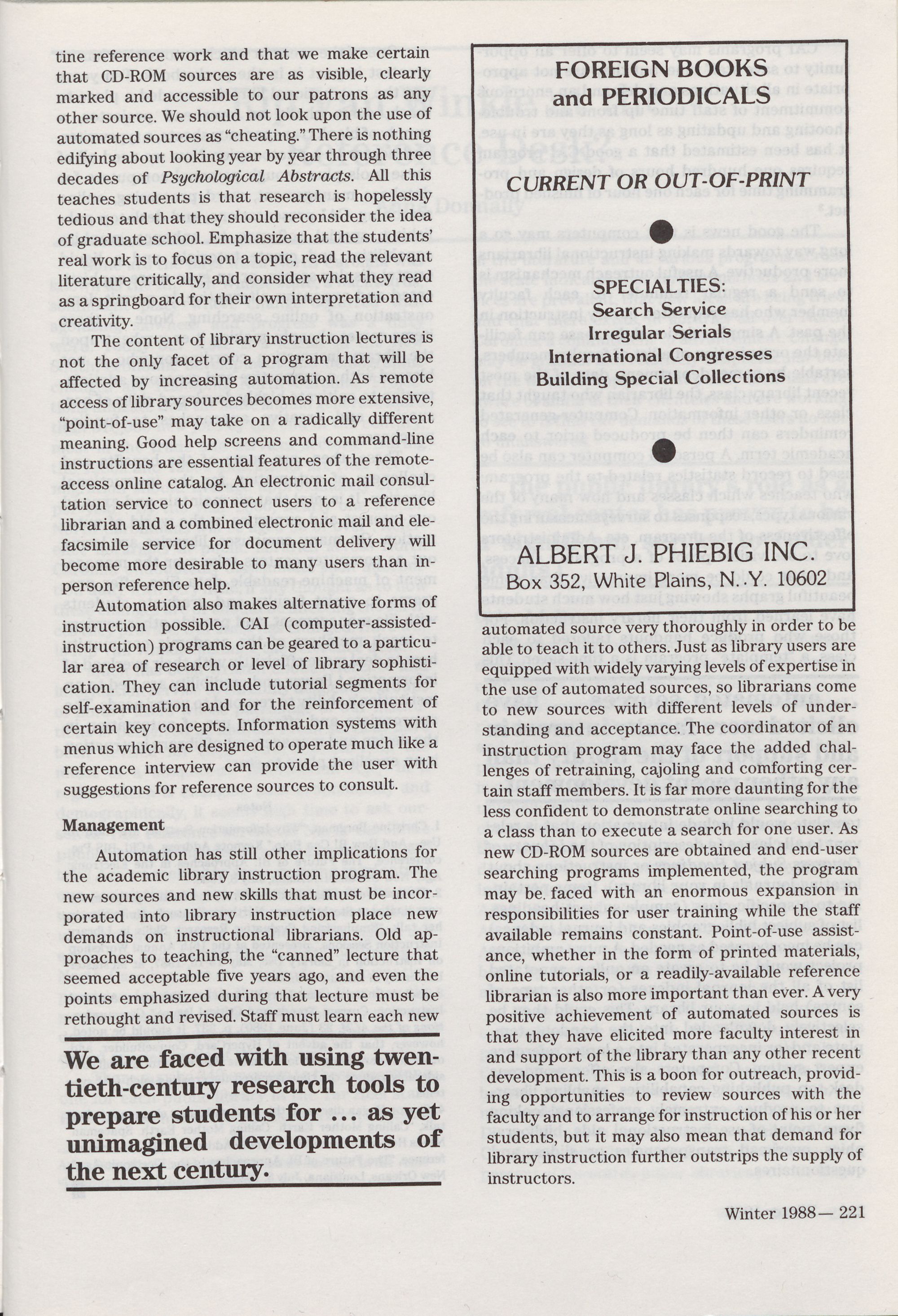 Cover: Elizabeth Bramm Dunn, oThe Challenge of Automation Advertisers: Ebsco, 217; Faxon, 208; H.W. Wilson, 200; Phiebig,, ~S