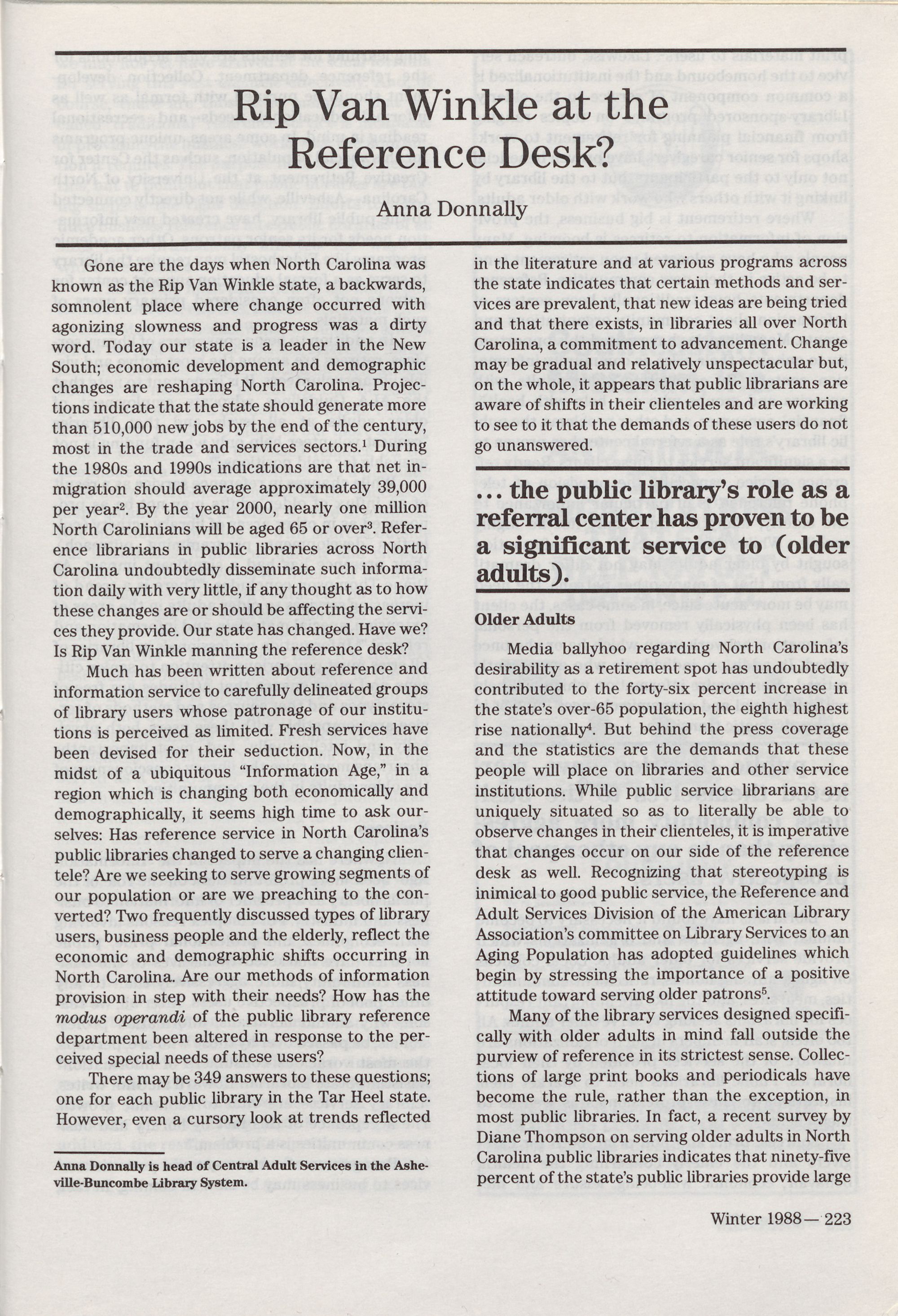 223 Rip Van Winkle at the Reference Desk? Anna Donnally