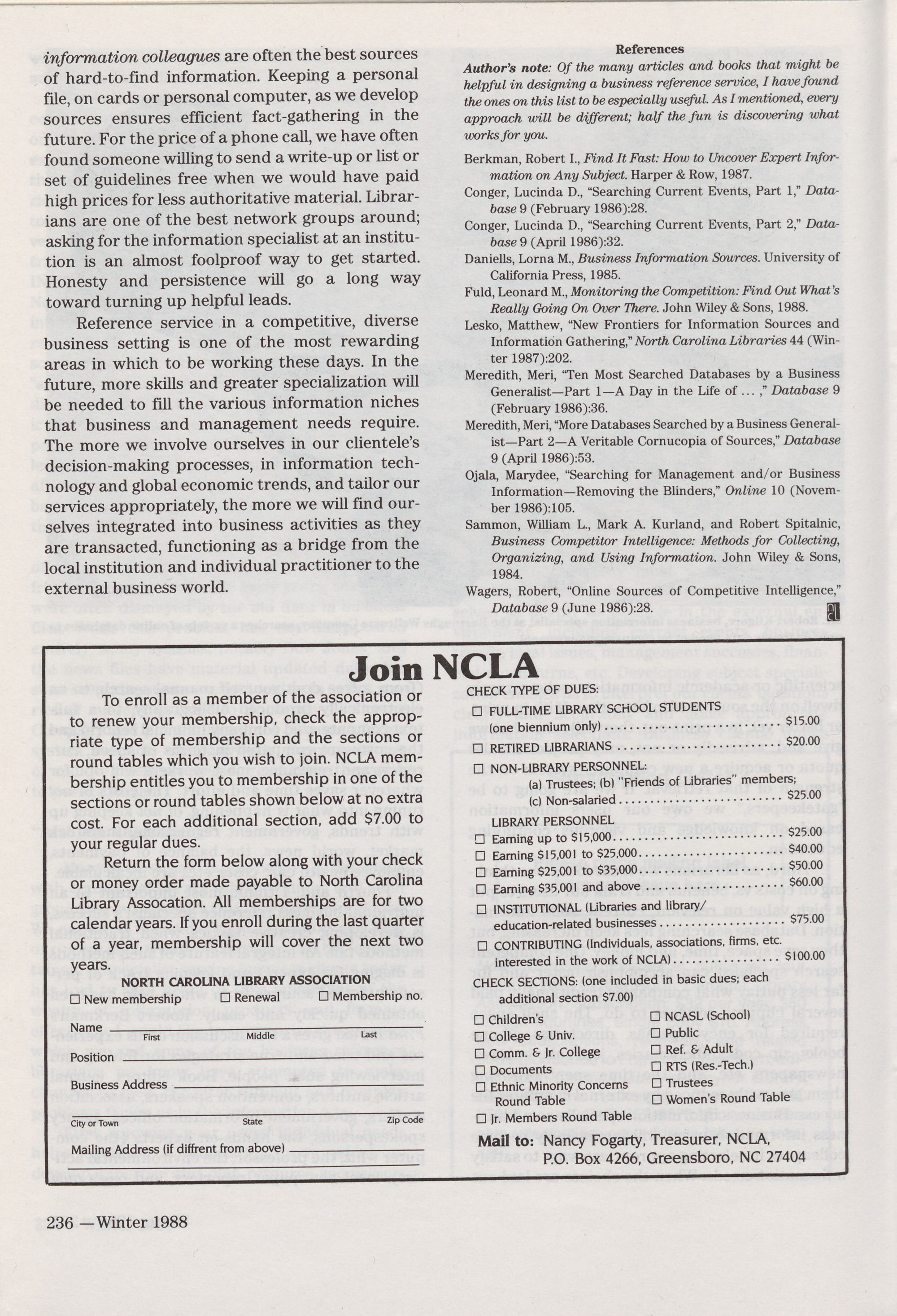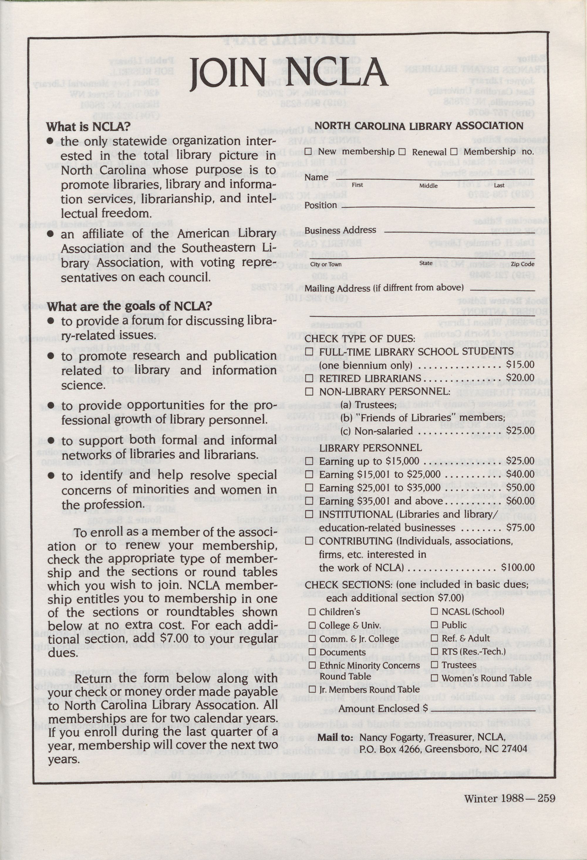 Library Association. Membership dues include a subscription to North Carolina Libraries. Membership