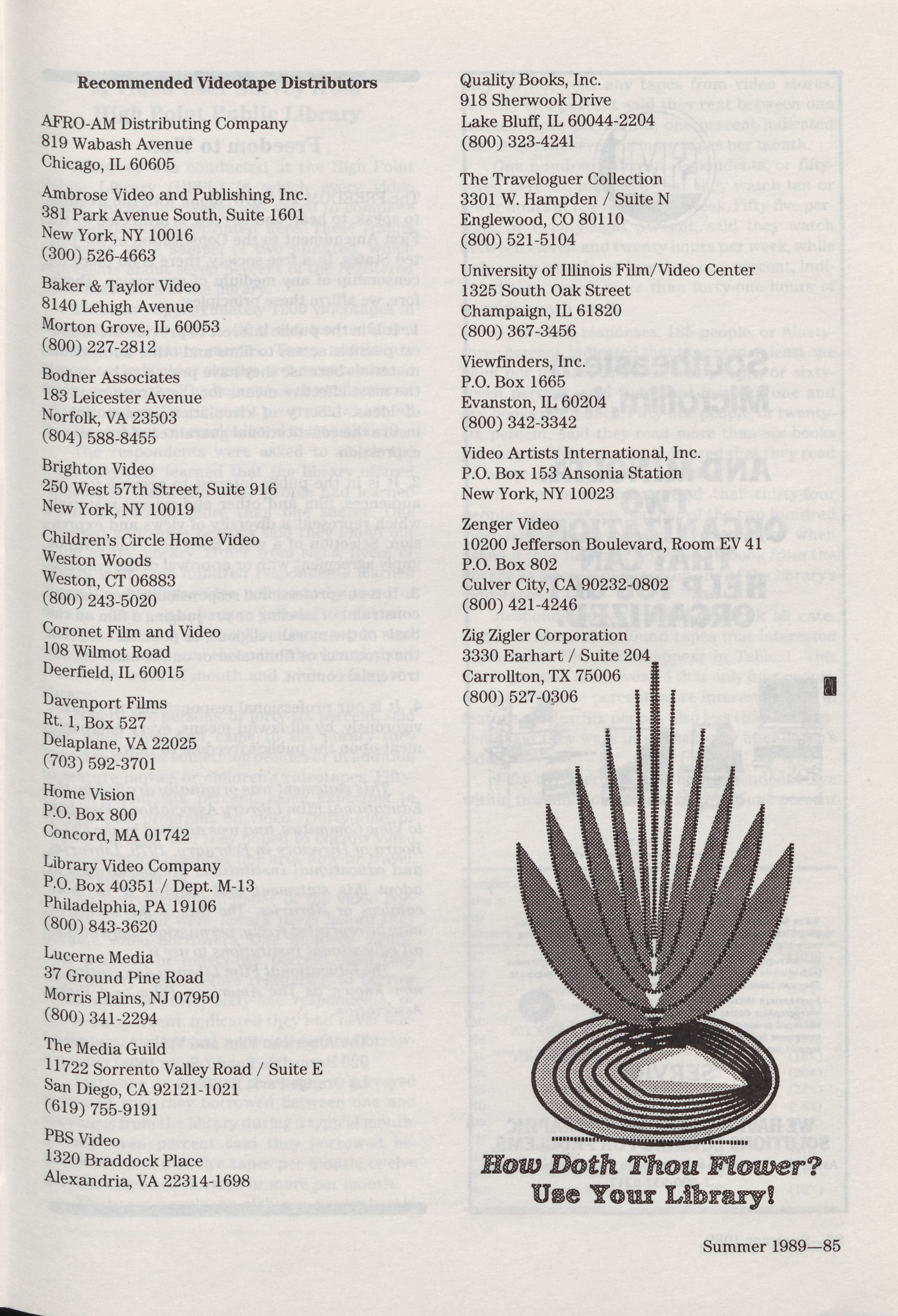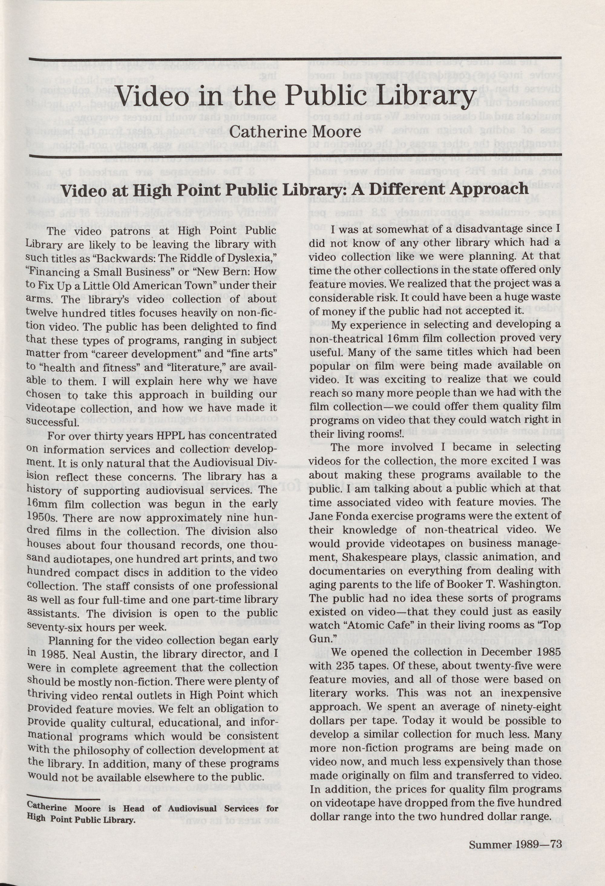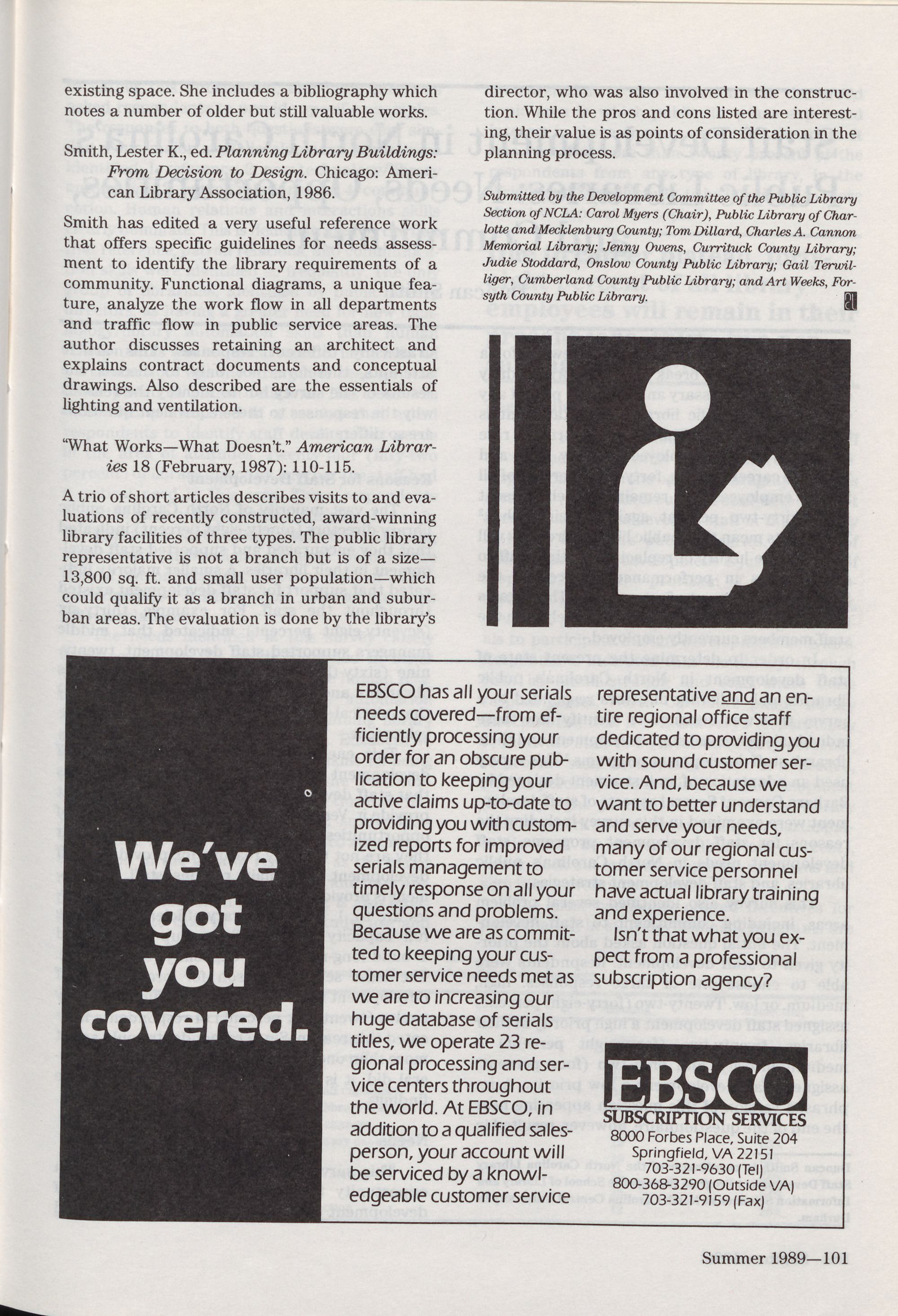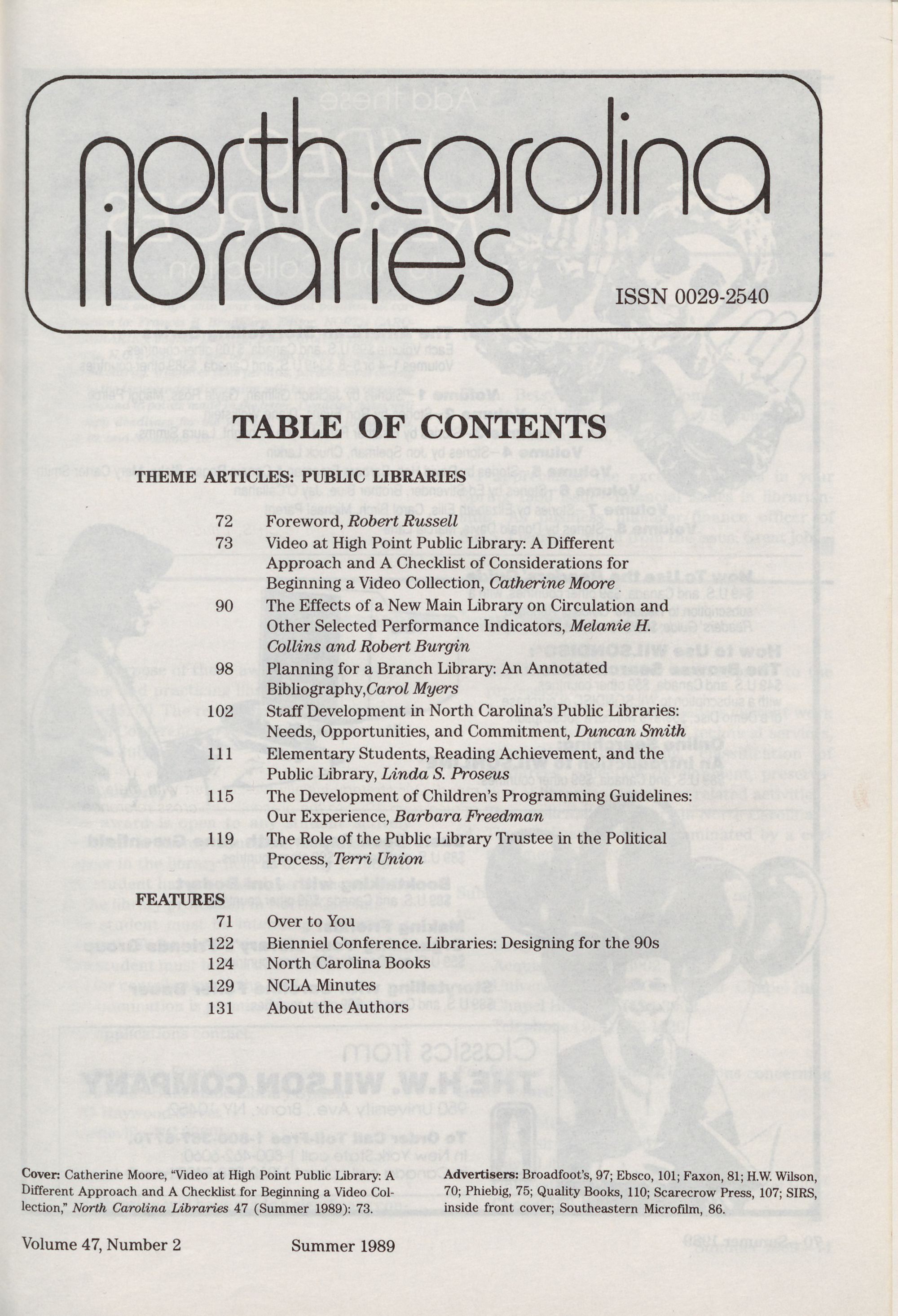 Cover: Catherine Moore, oVideo at High Point Public Library: A Advertisers: BroadfootTs, 97; Ebsco, 101; Faxon, 81; H.W. Wilson,