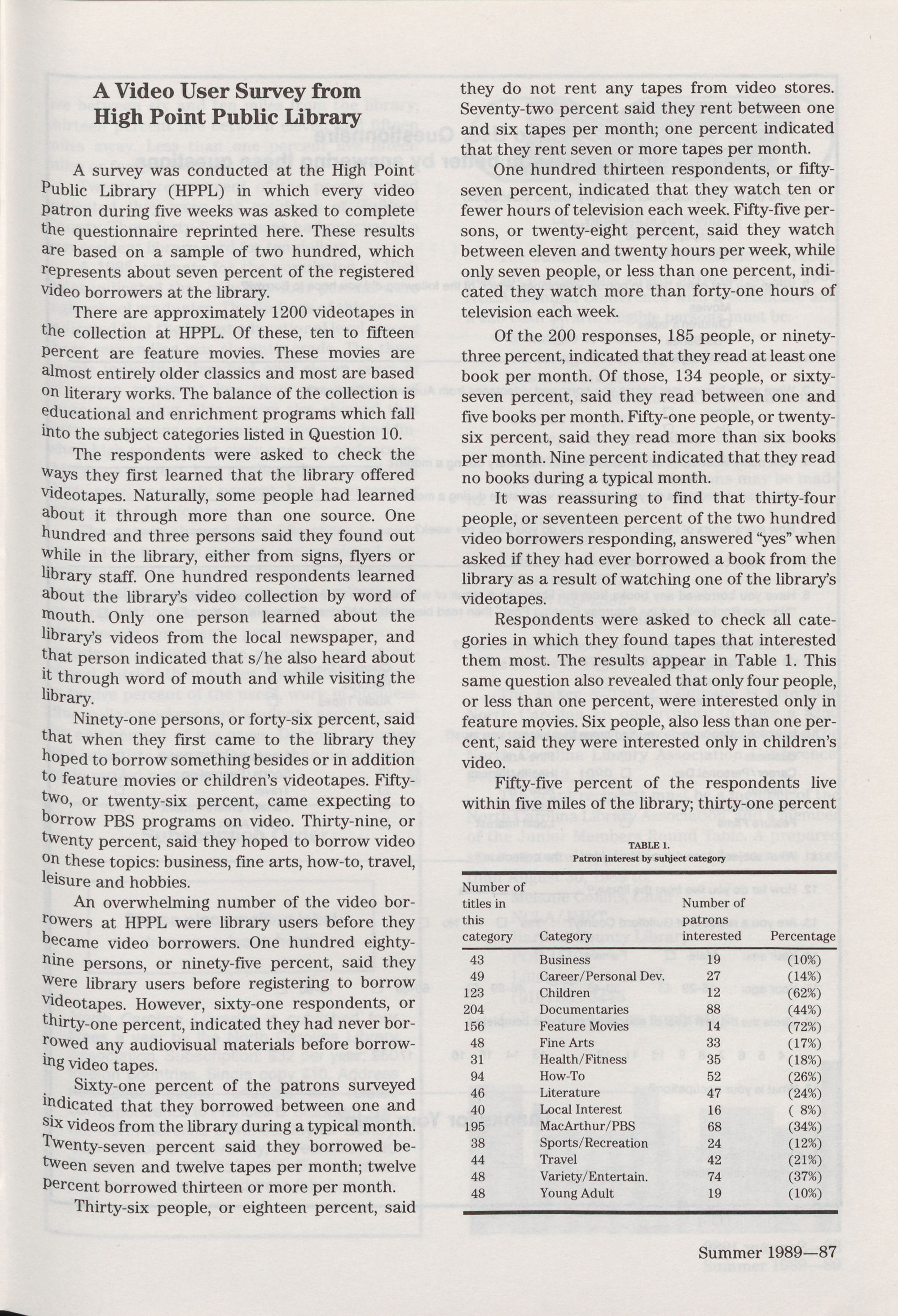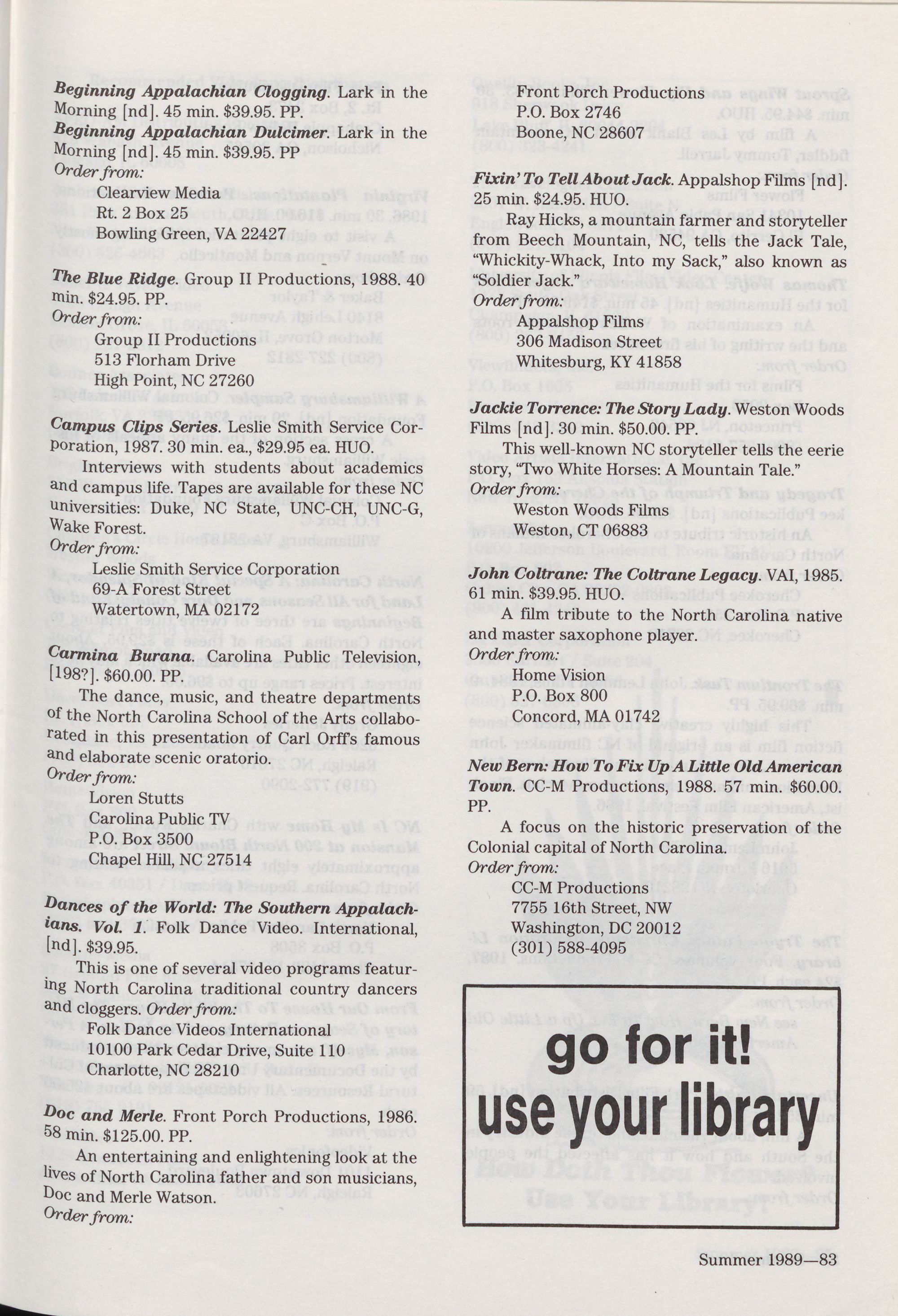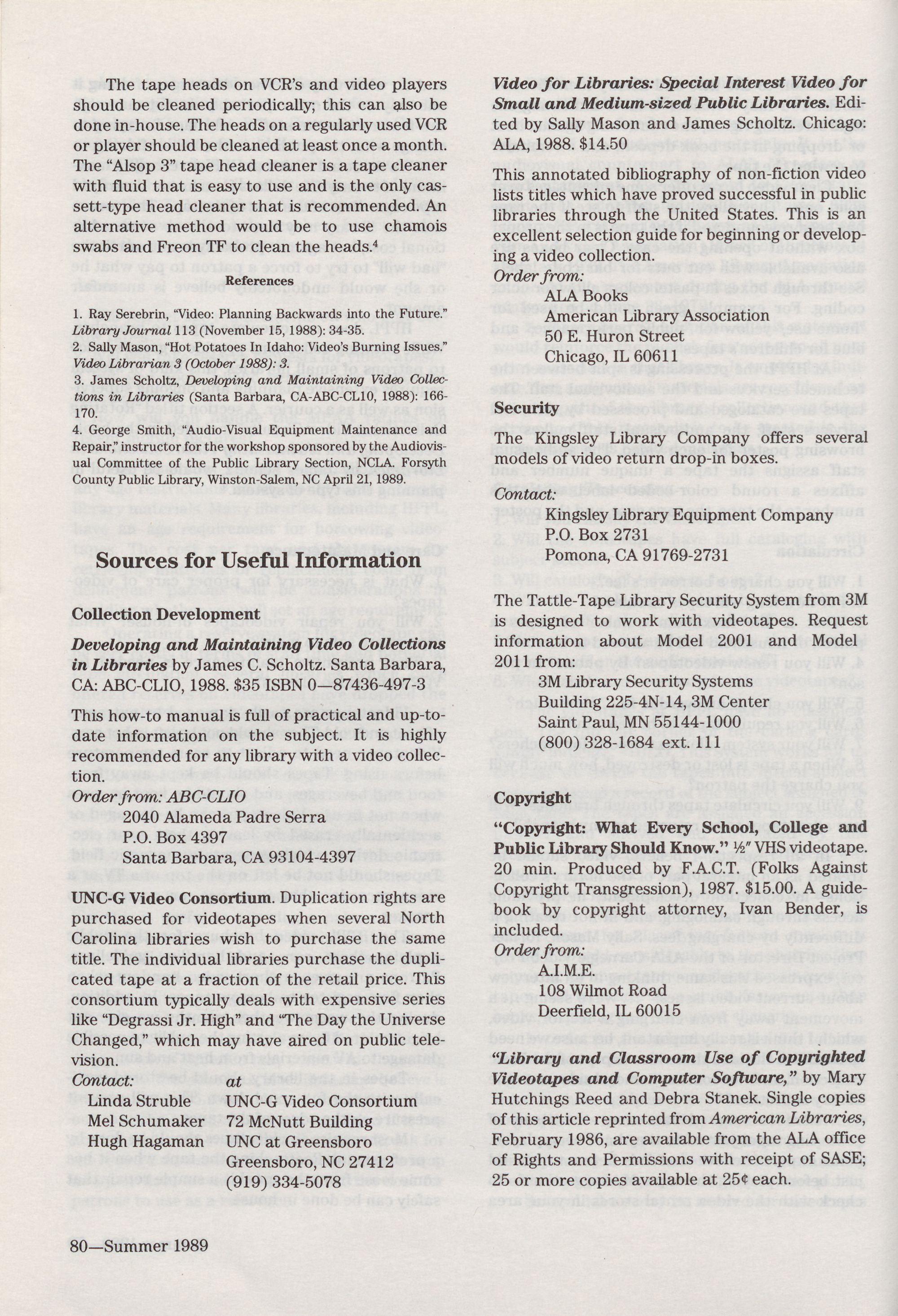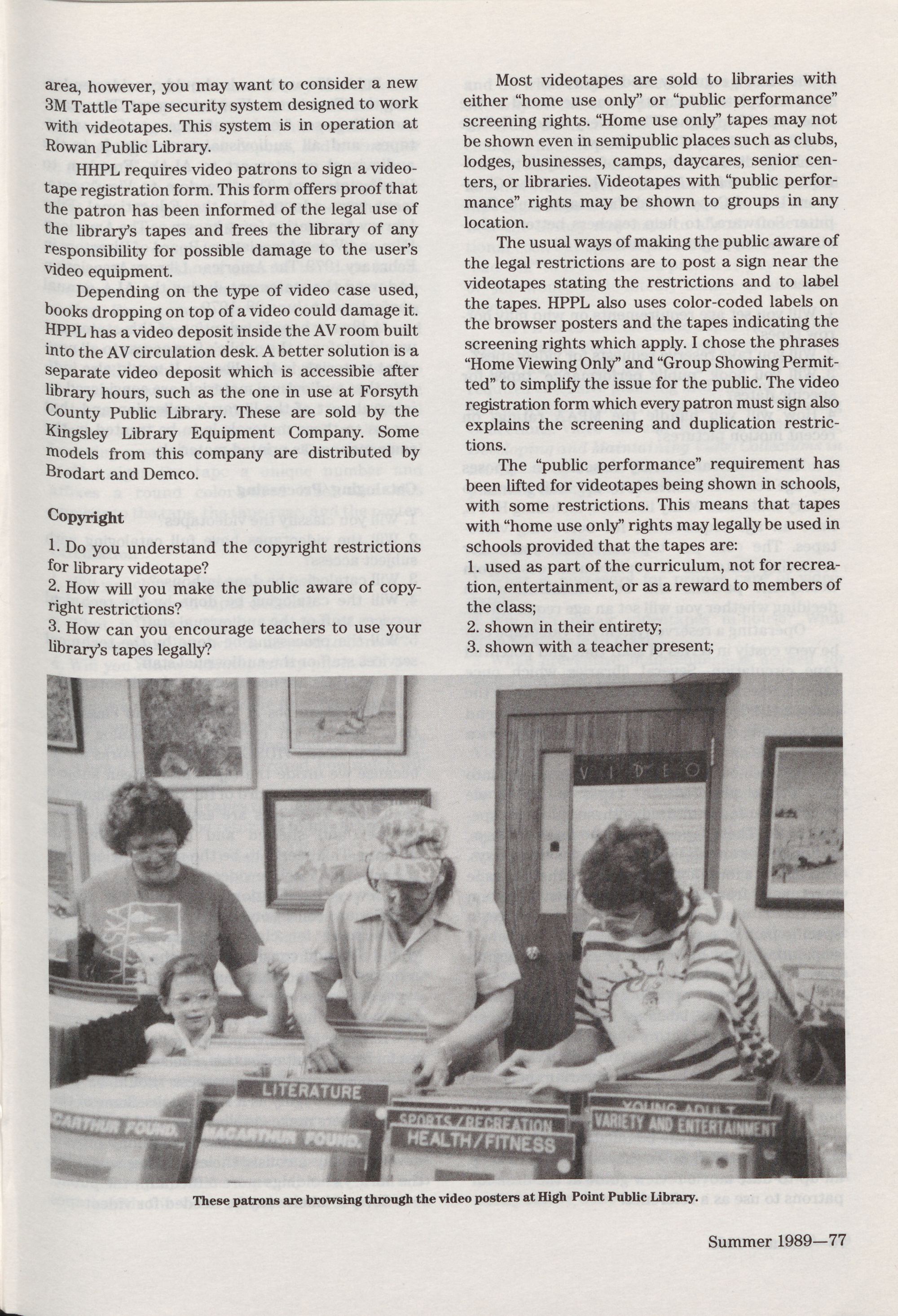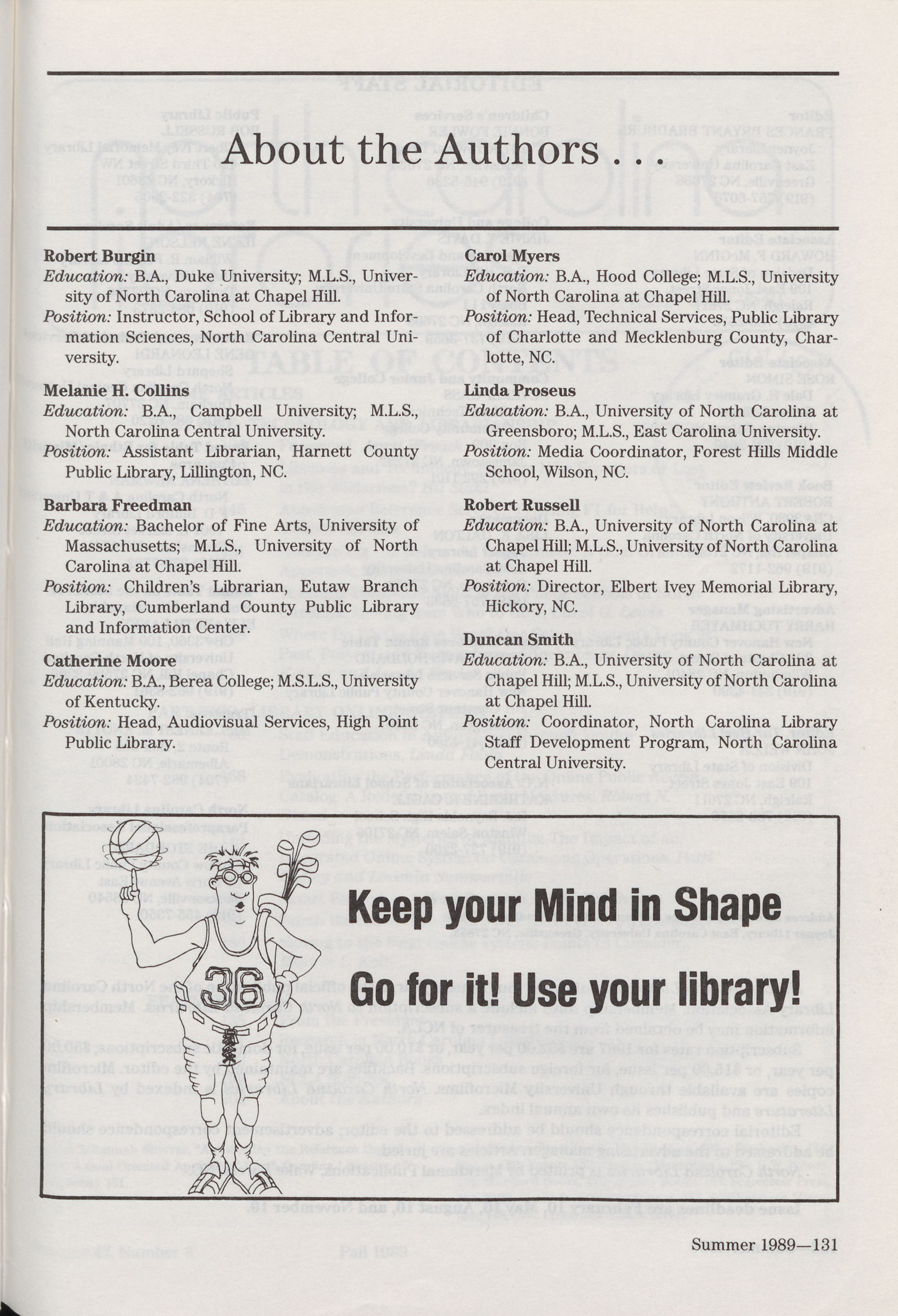 Cover: Catherine Moore, oVideo at High Point Public Library: A Advertisers: BroadfootTs, 97; Ebsco, 101; Faxon, 81; H.W. Wilson,