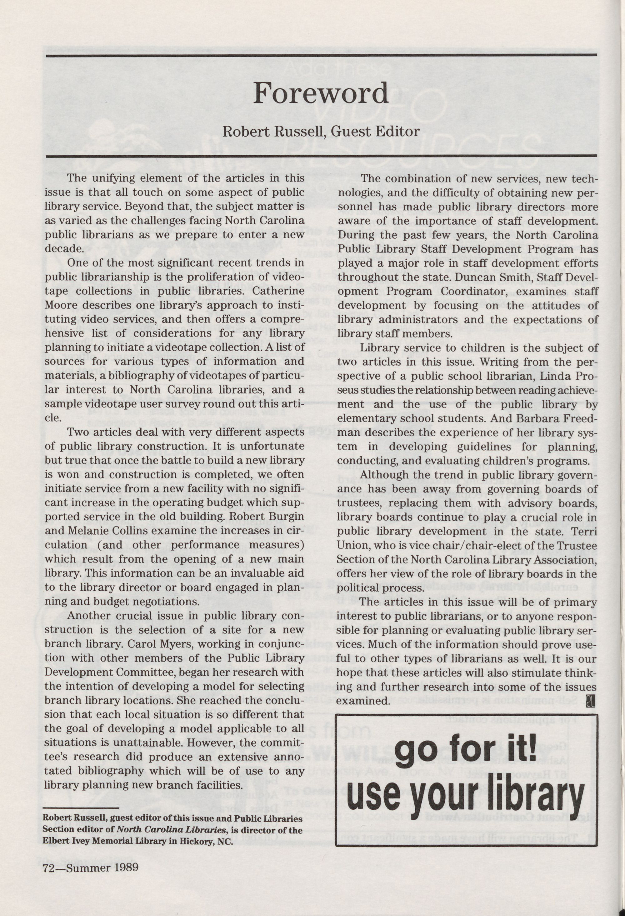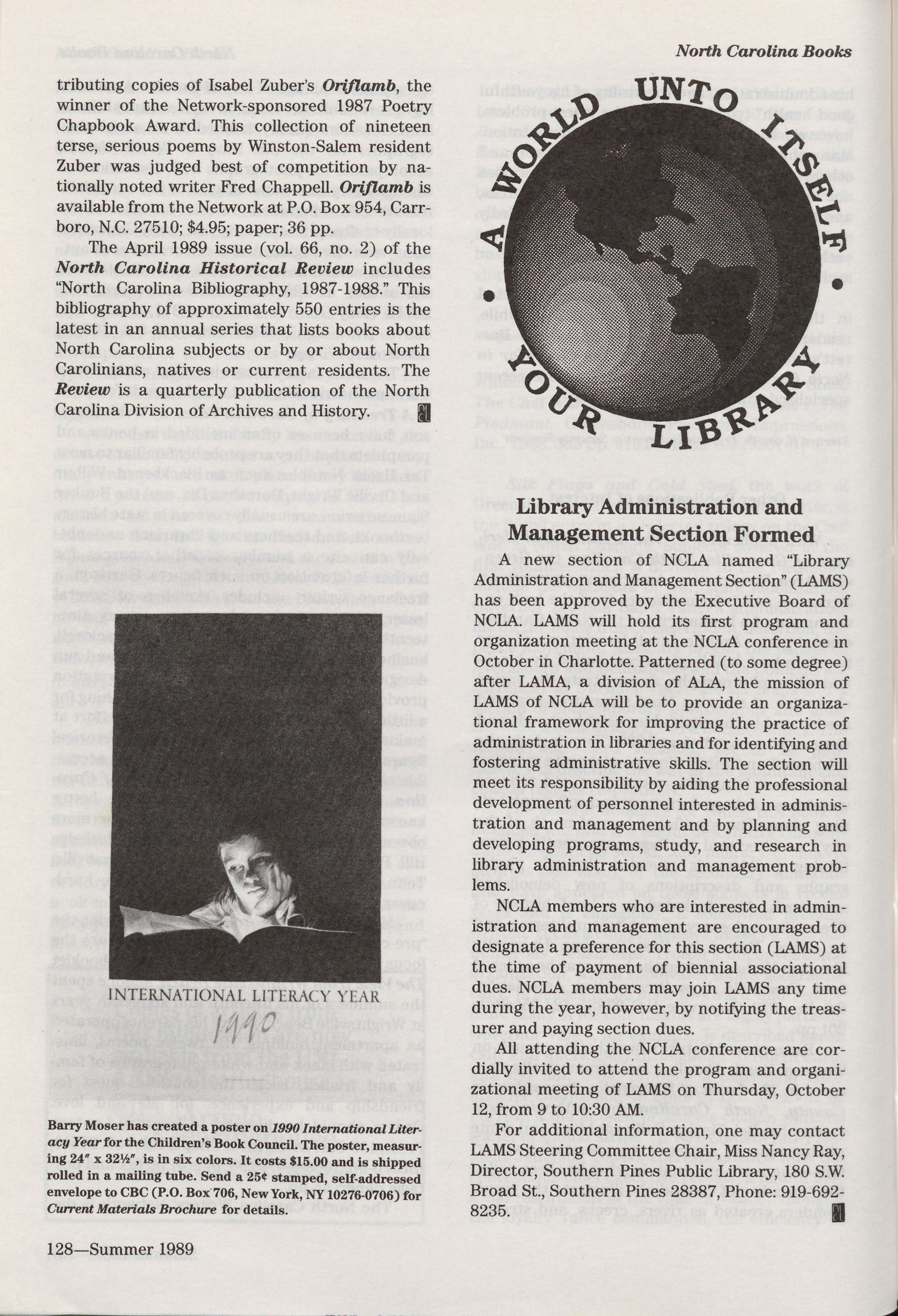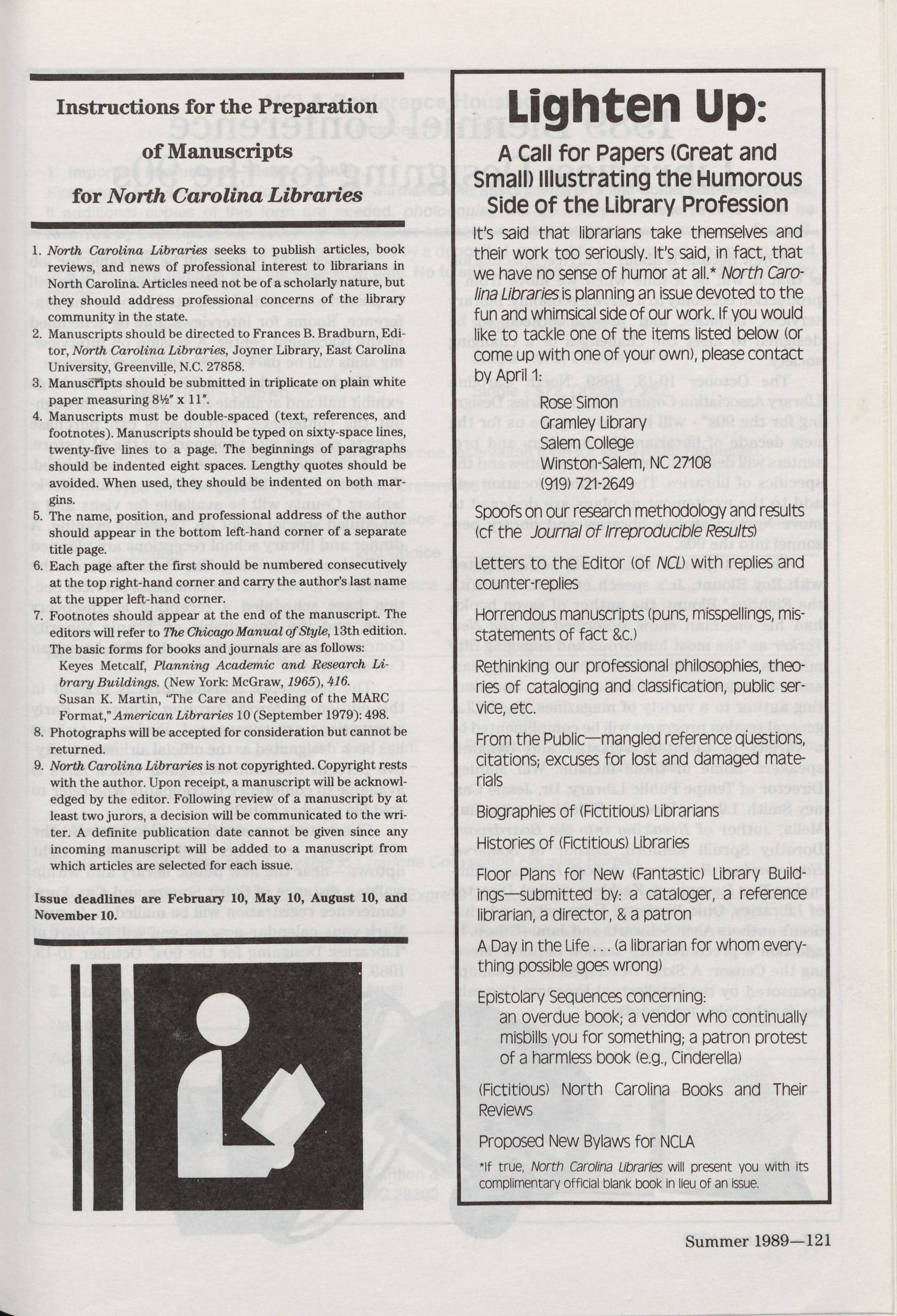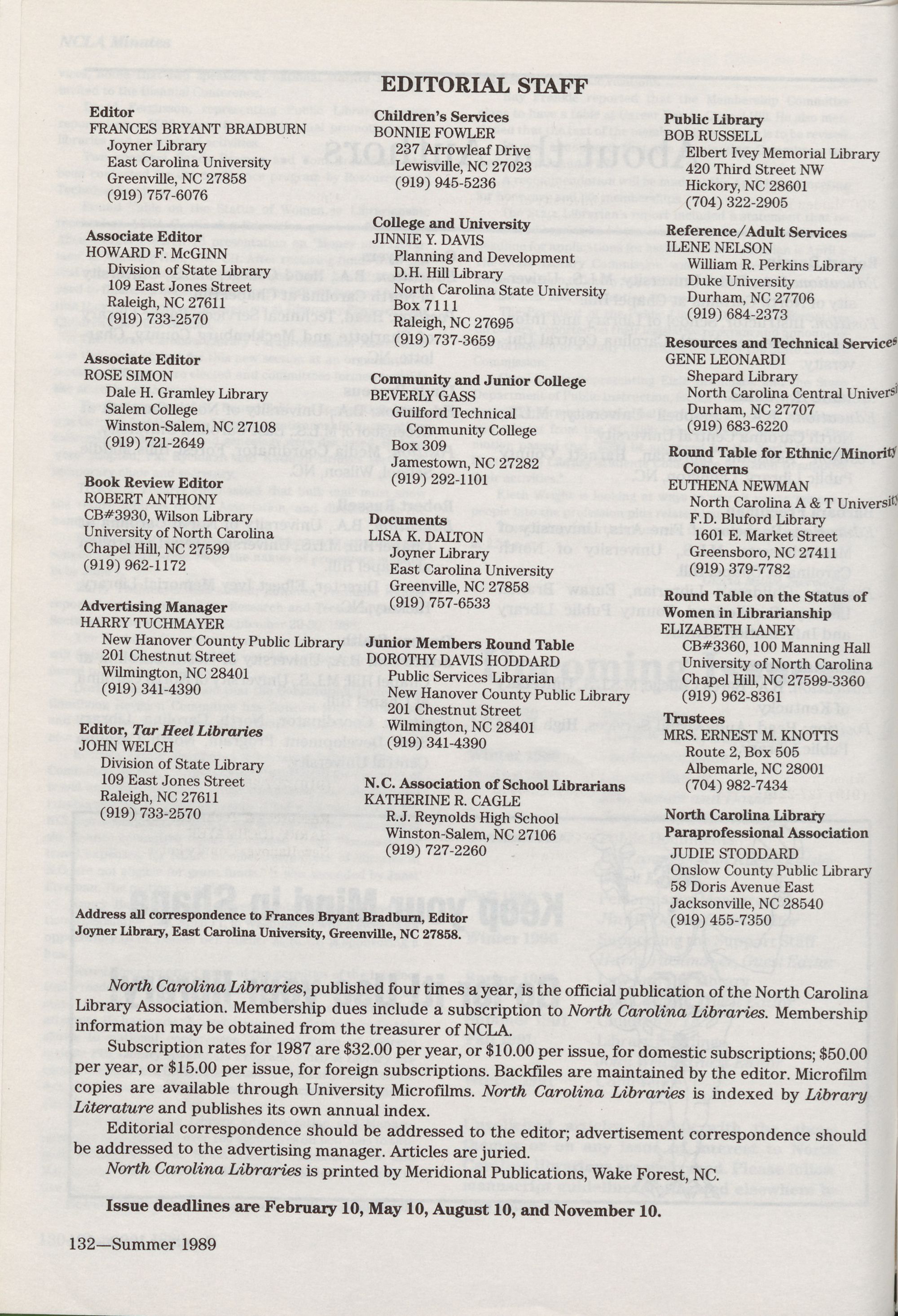 North Carolina Libraries, published four times a year, is the official publication of the North Carolina