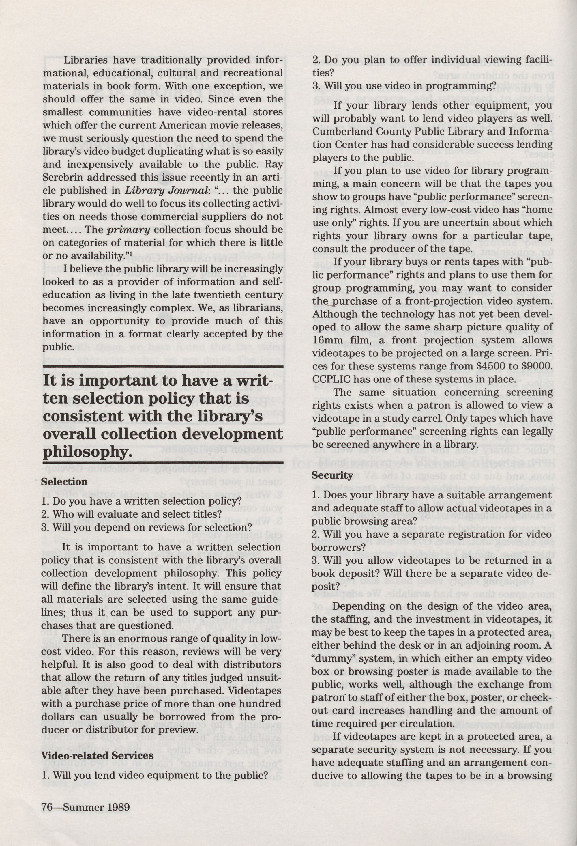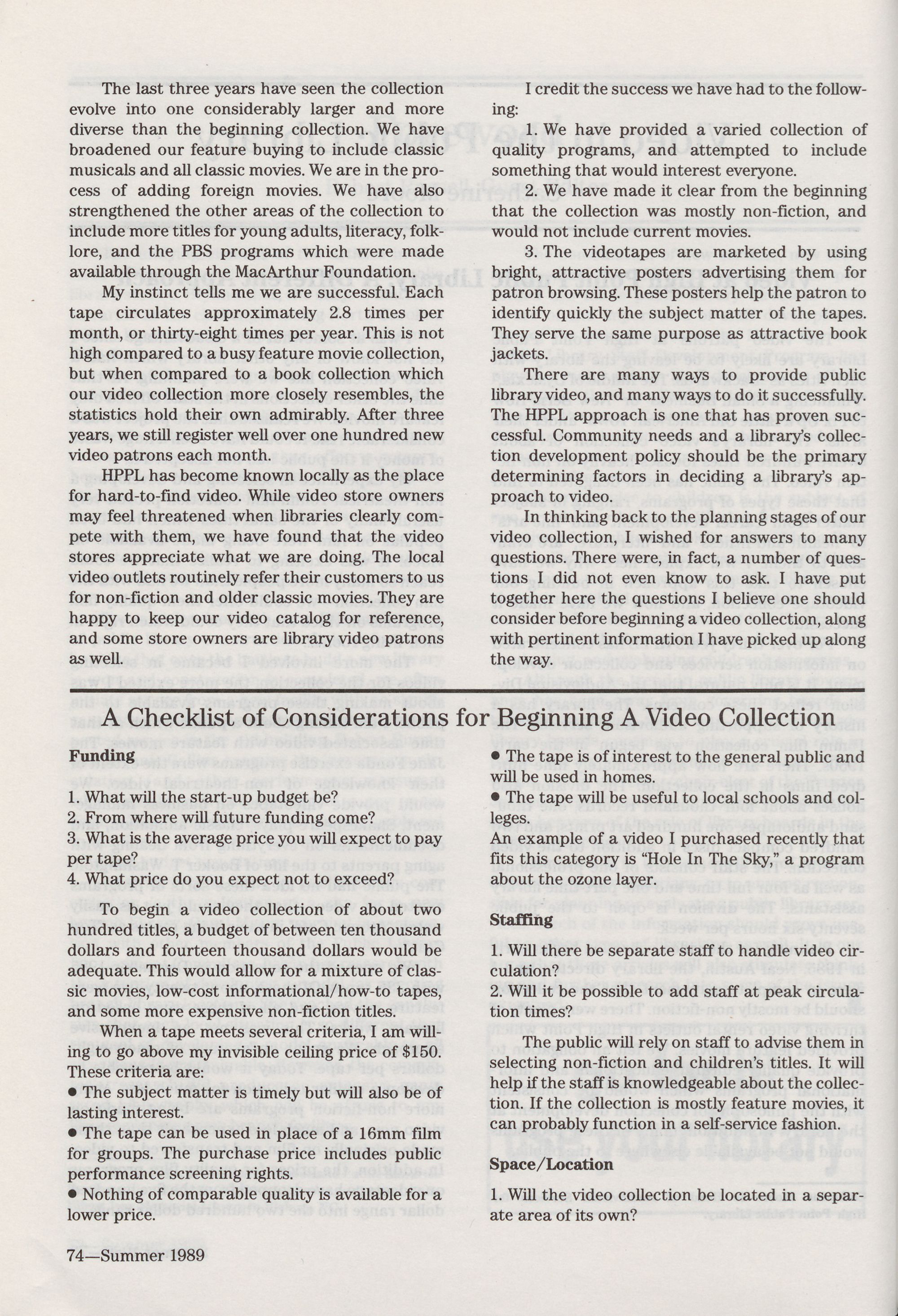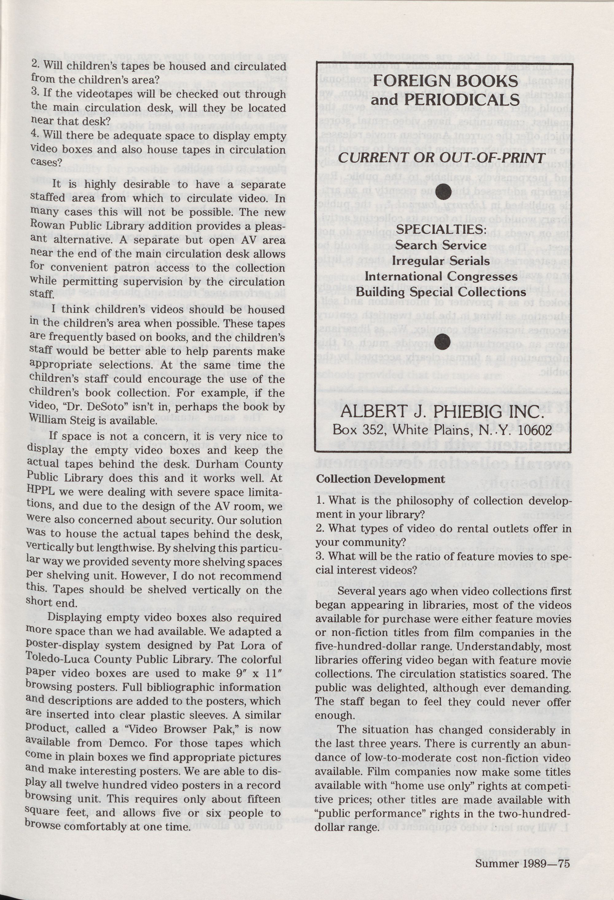 Different Approach and A Checklist for Beginning a Video Col- 70; Phiebig, 75; Quality Books, 110; Scarecrow Press, 107; SIRS,