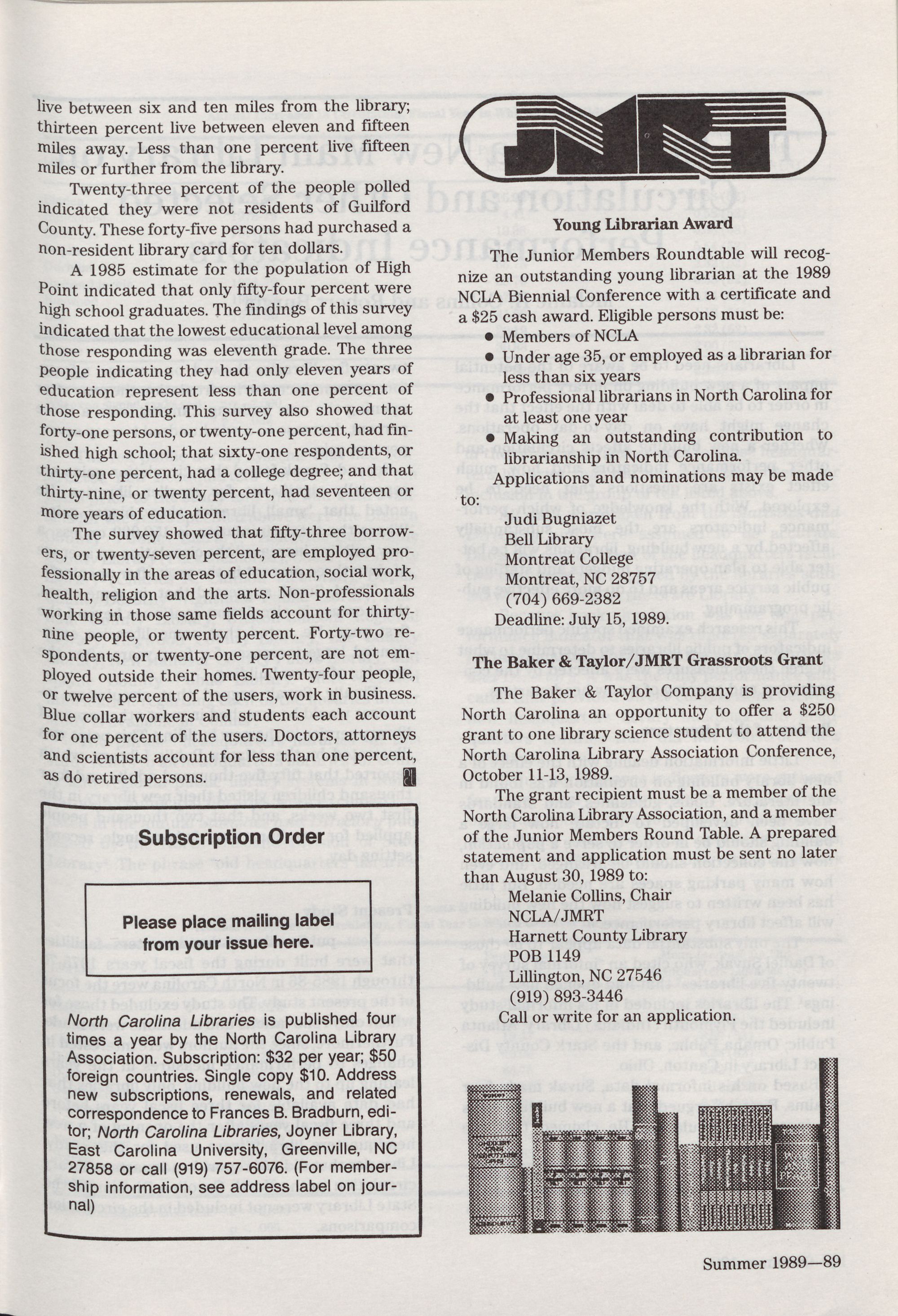 Library Association. Membership dues include a subscription to North Carolina Libraries. Membership