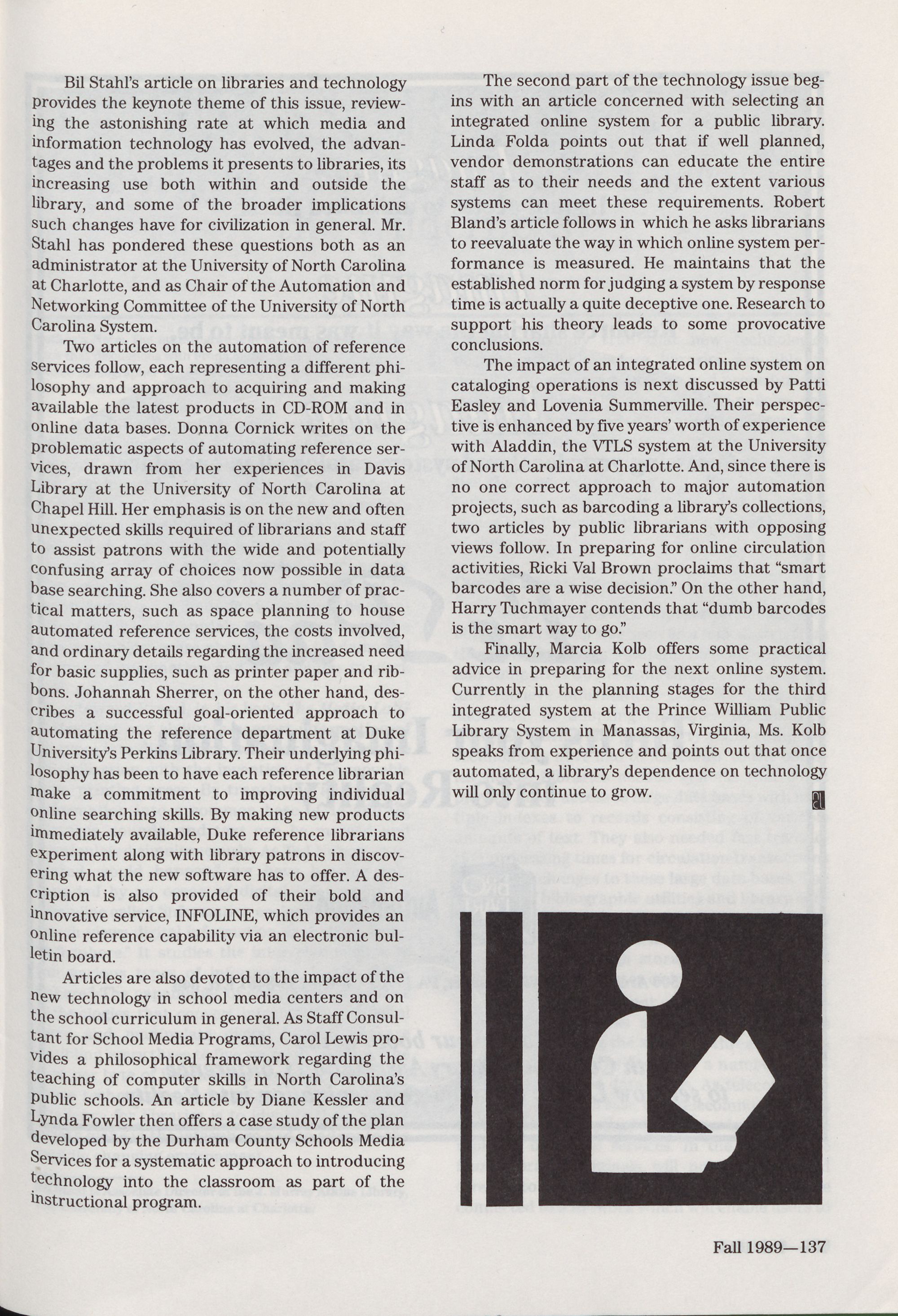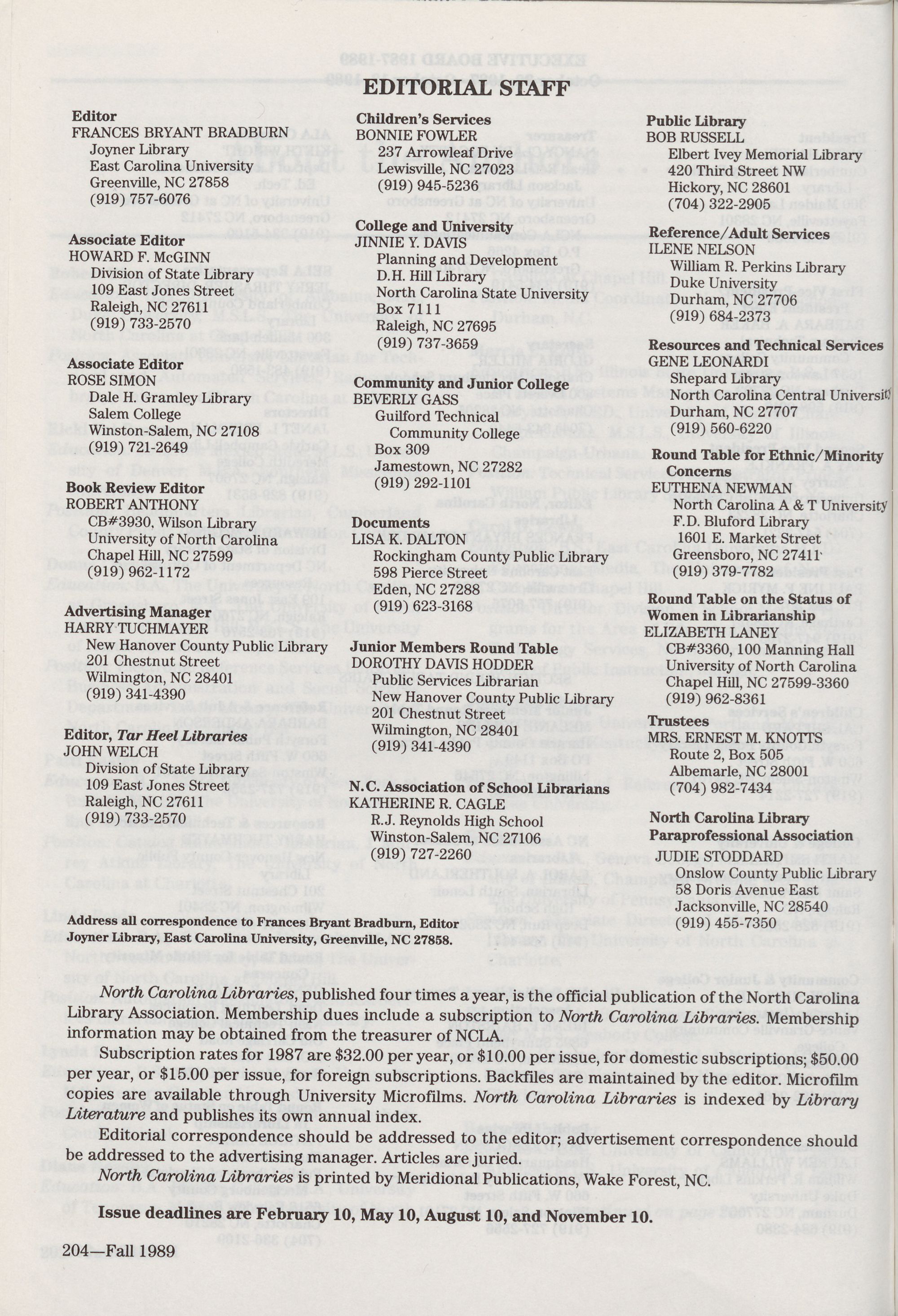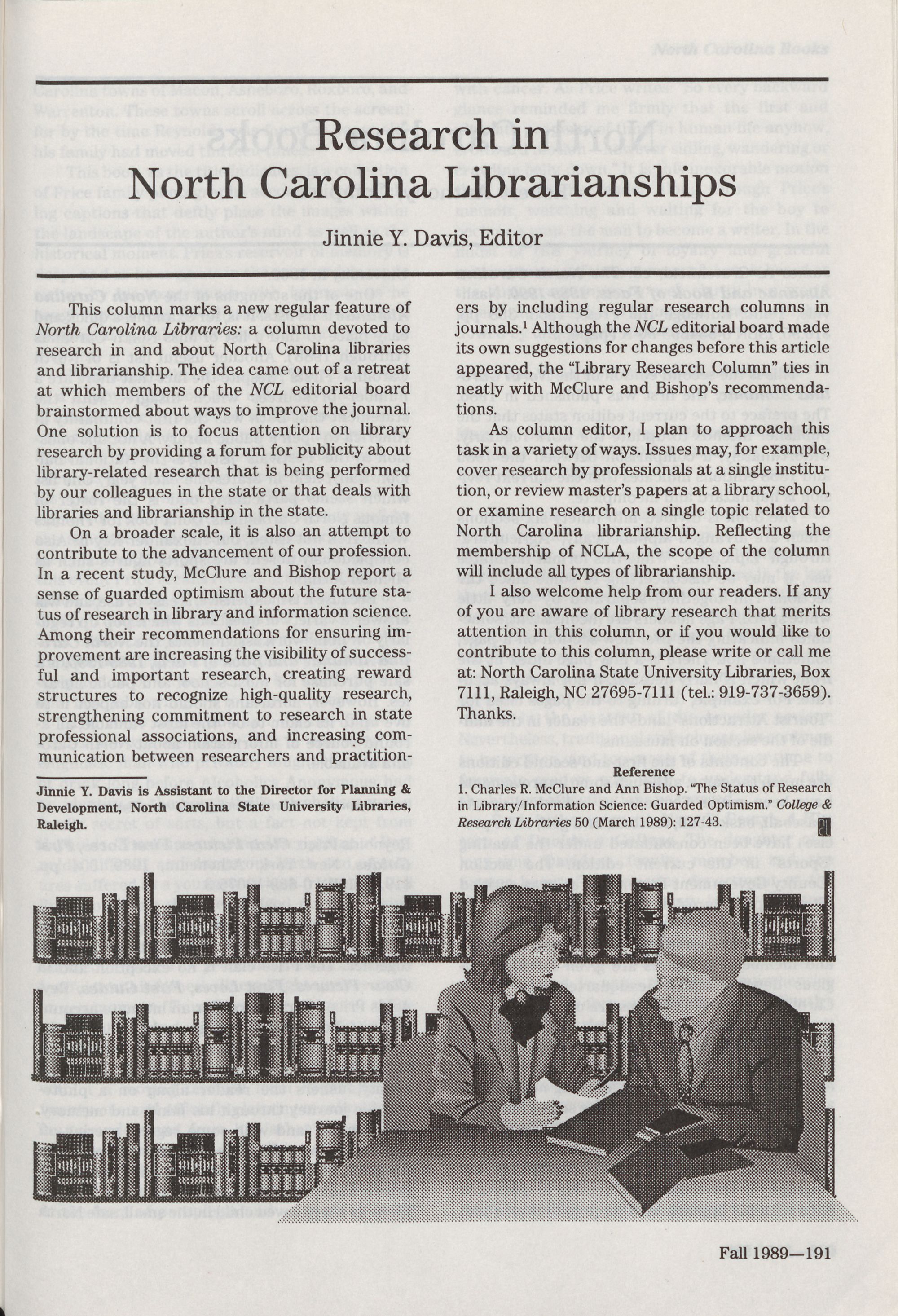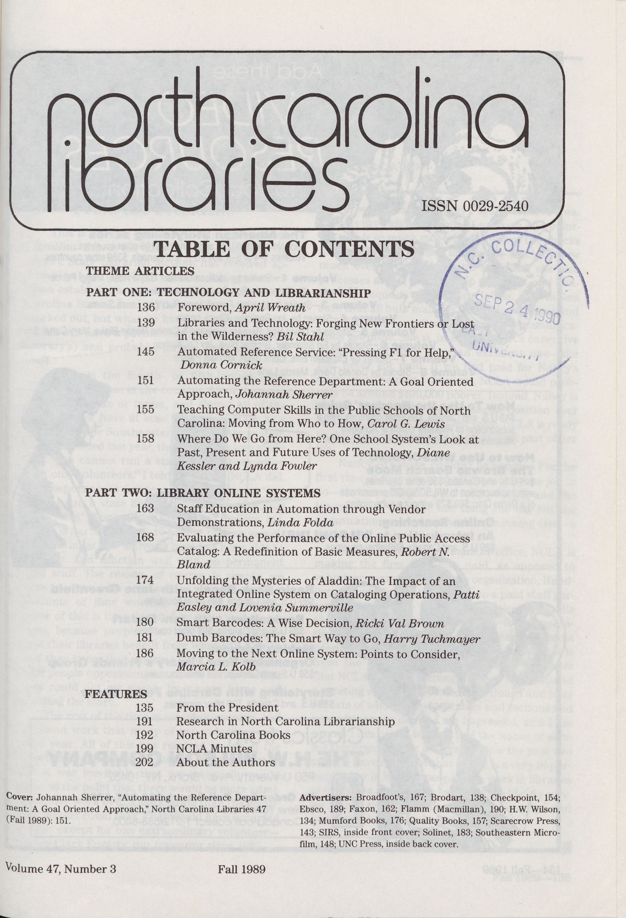 North Carolina Libraries, published four times a year, is the official publication of the North Carolina