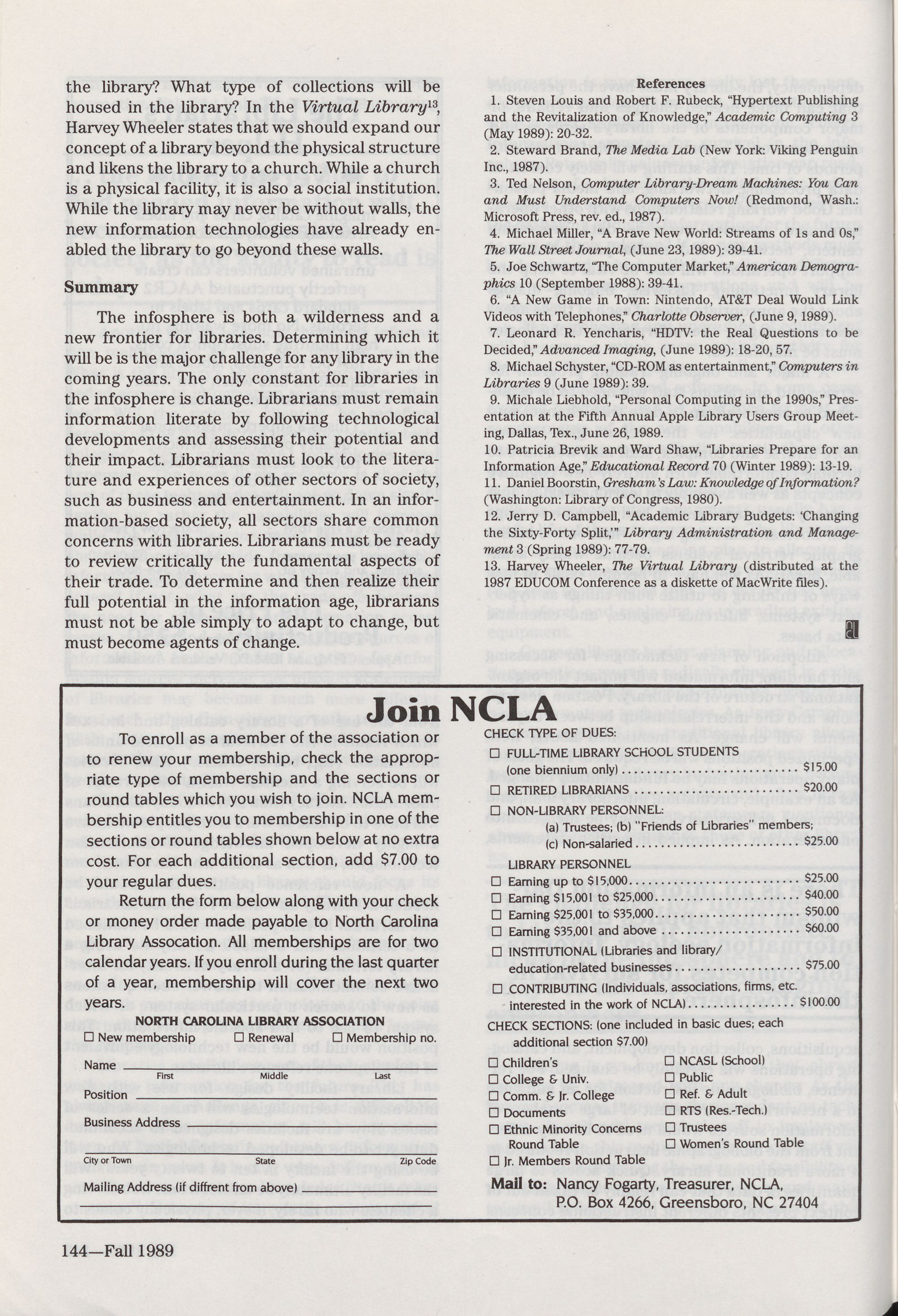 Library Association. Membership dues include a subscription to North Carolina Libraries. Membership