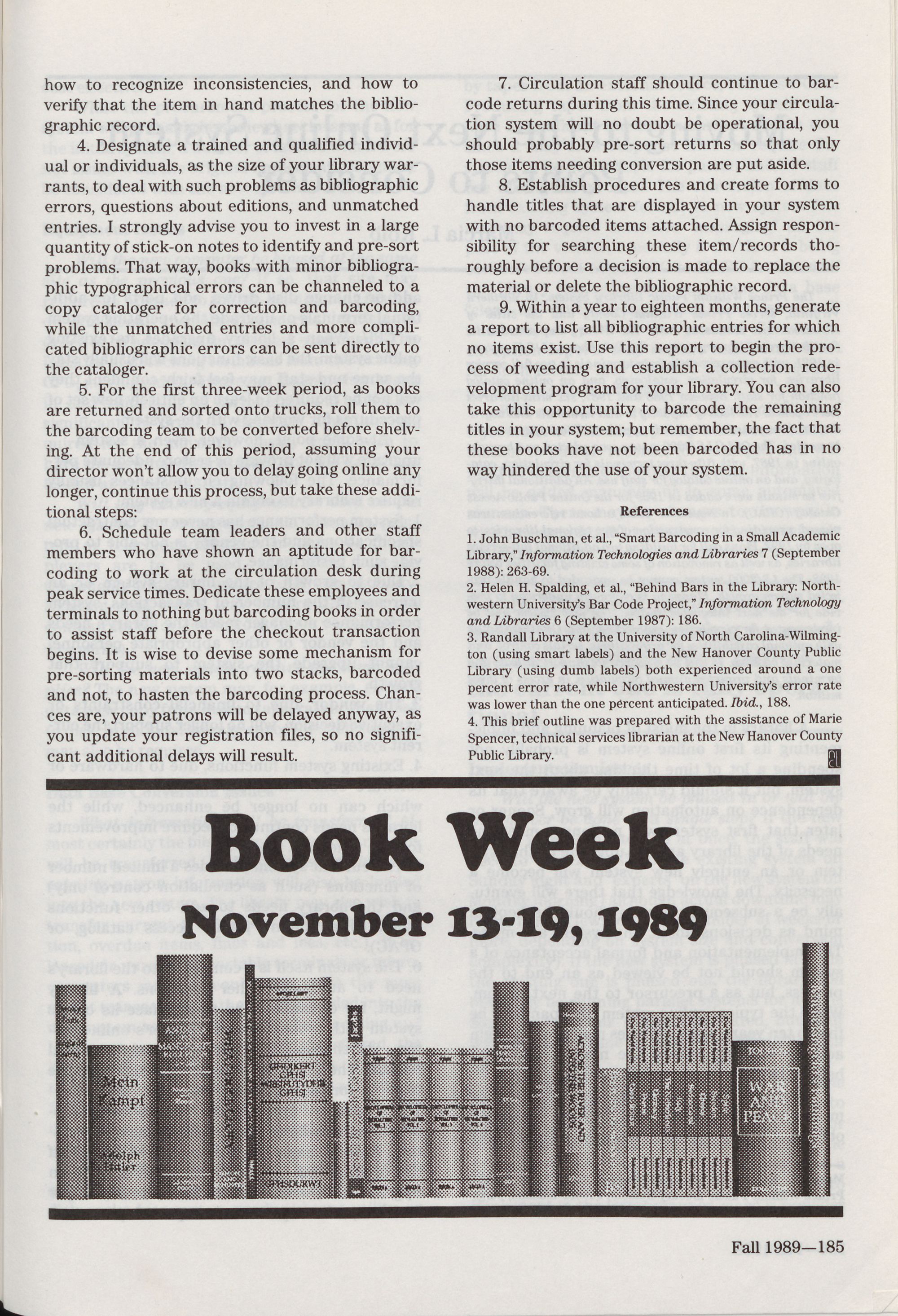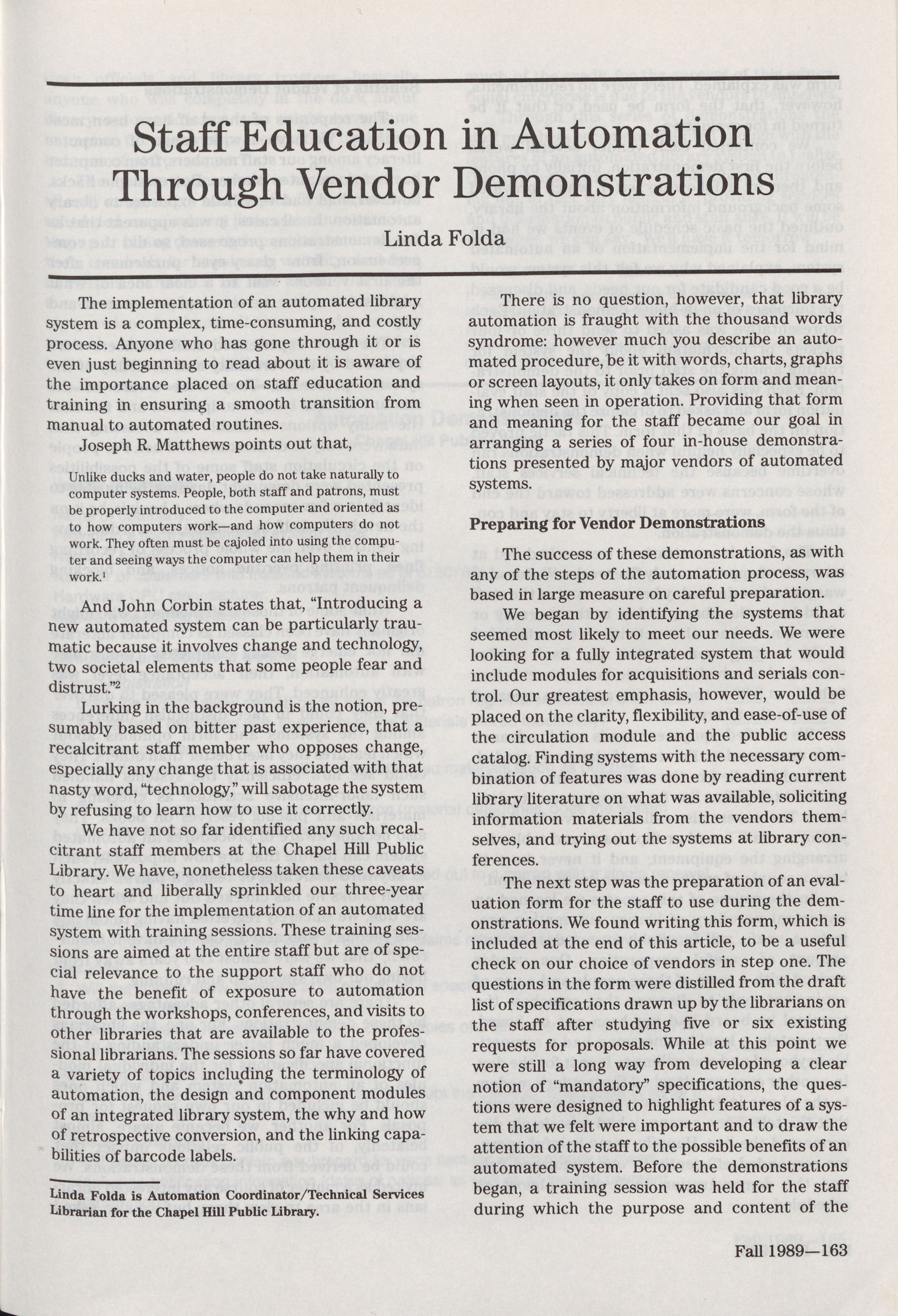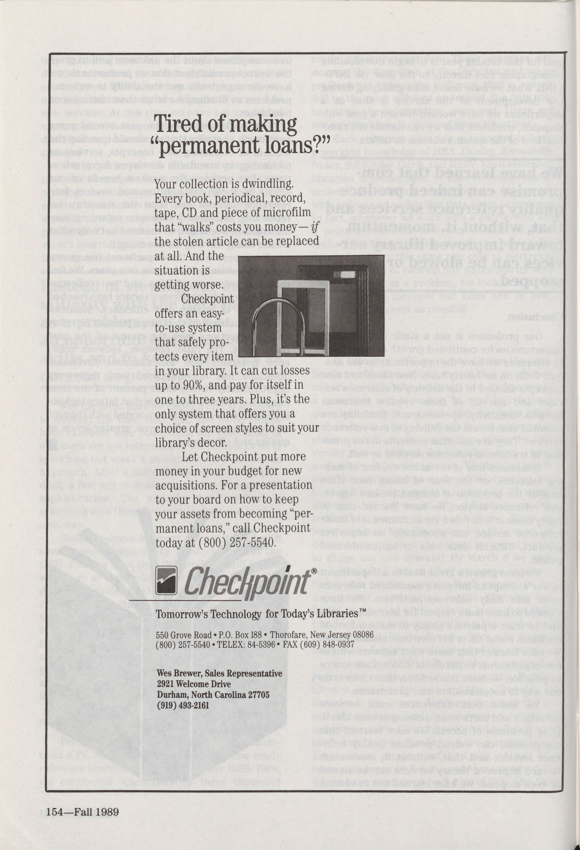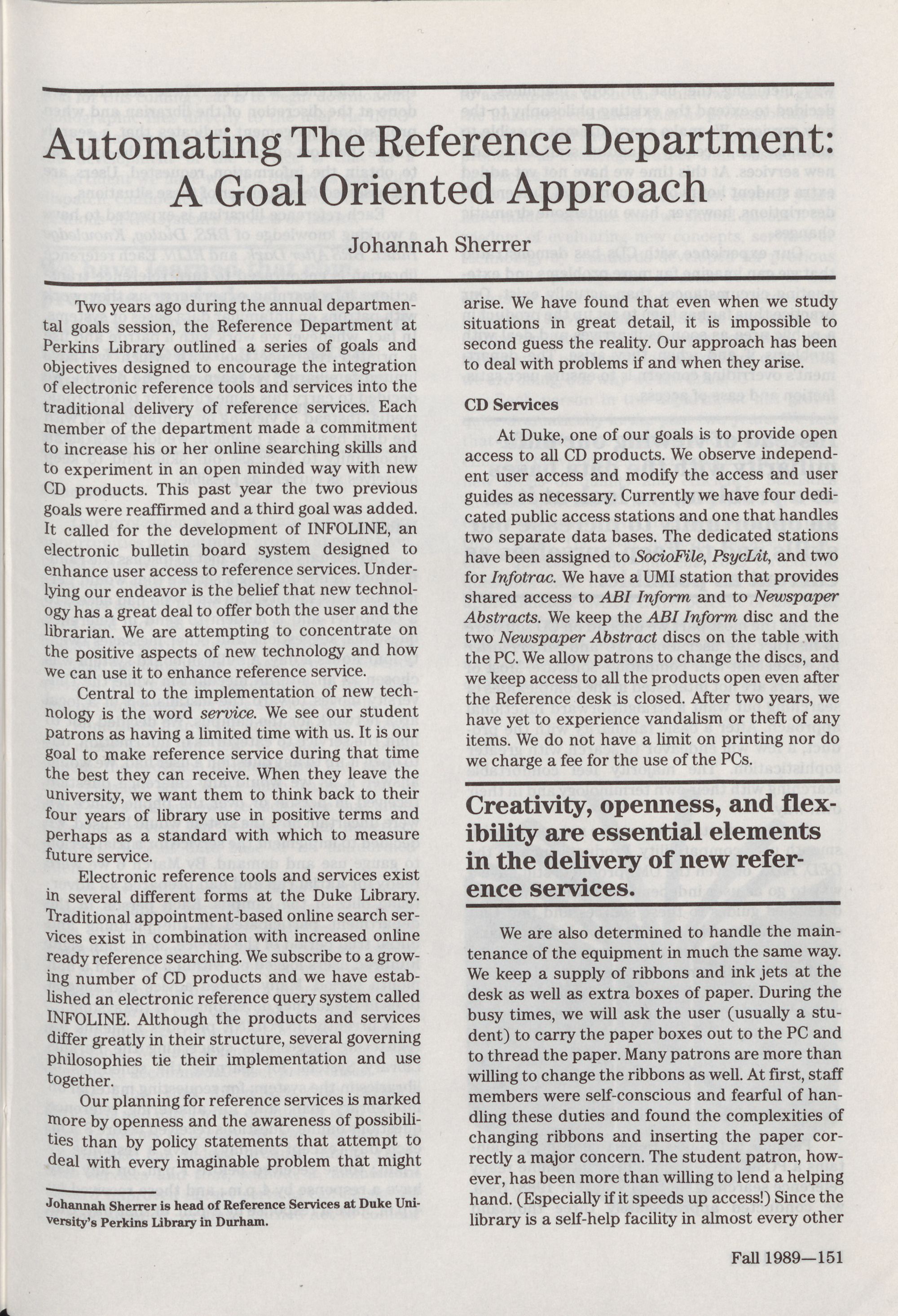 Cover: Johannah Sherrer, oAutomating the Reference Depart- Advertisers: BroadfootTs, 167; Brodart, 138; Checkpoint, 154;