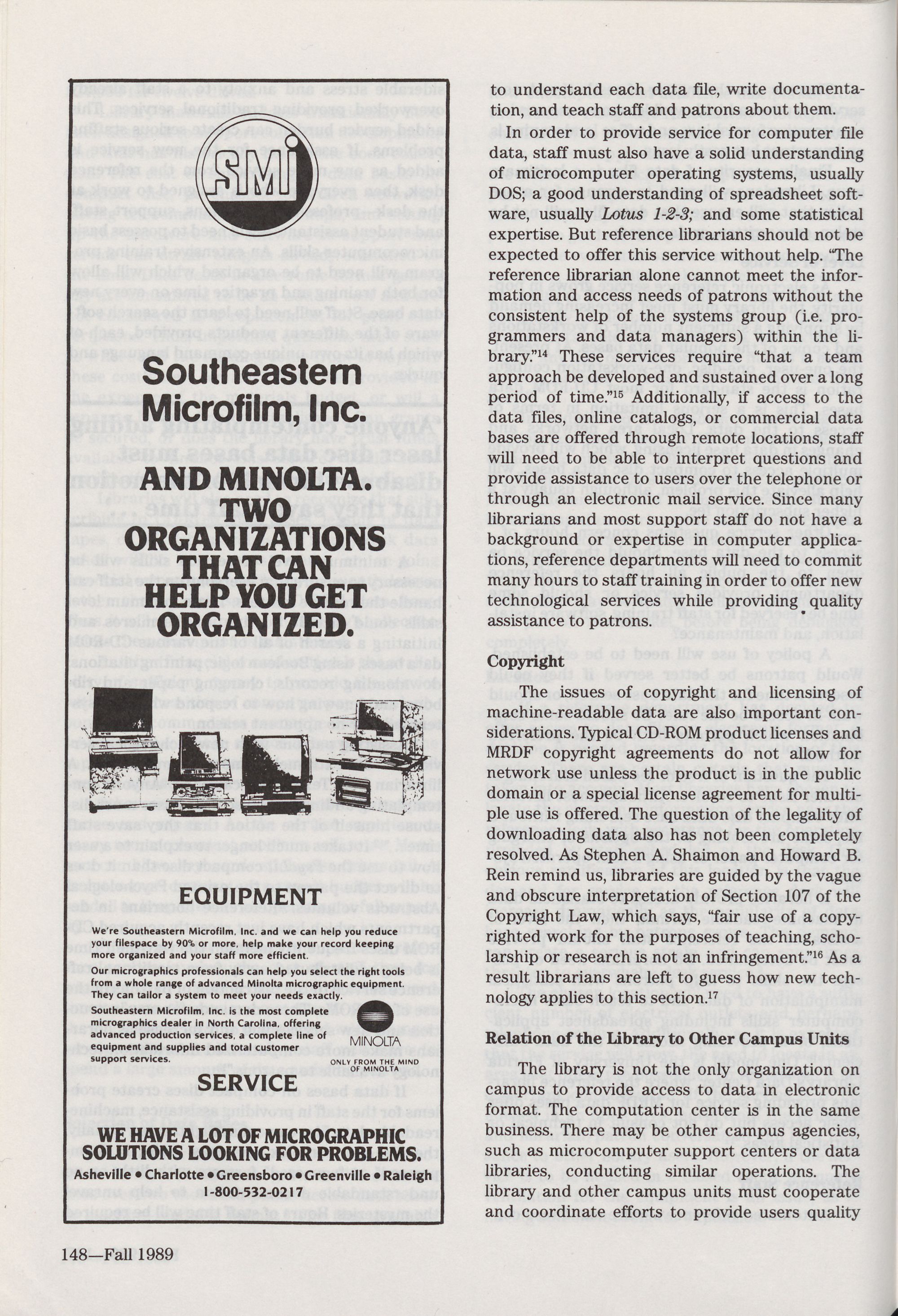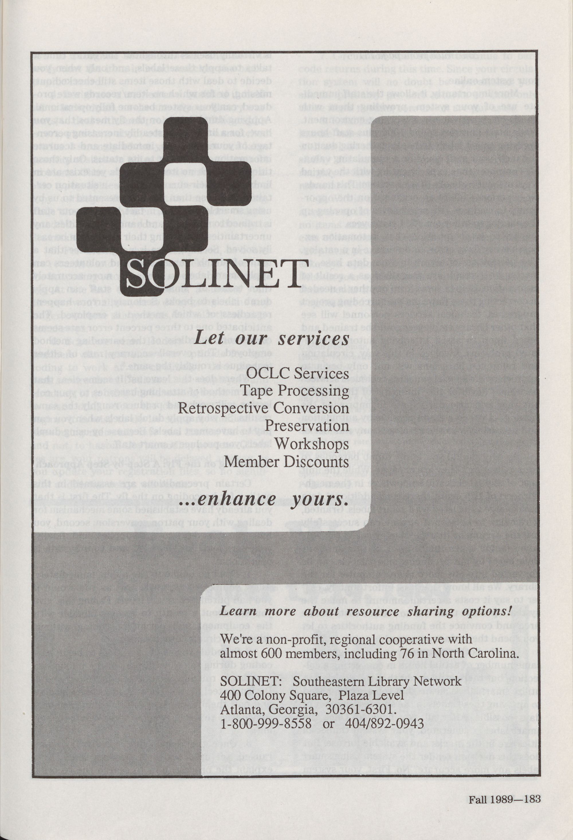 143; SIRS, inside front cover; Solinet, 183; Southeastern Micro-