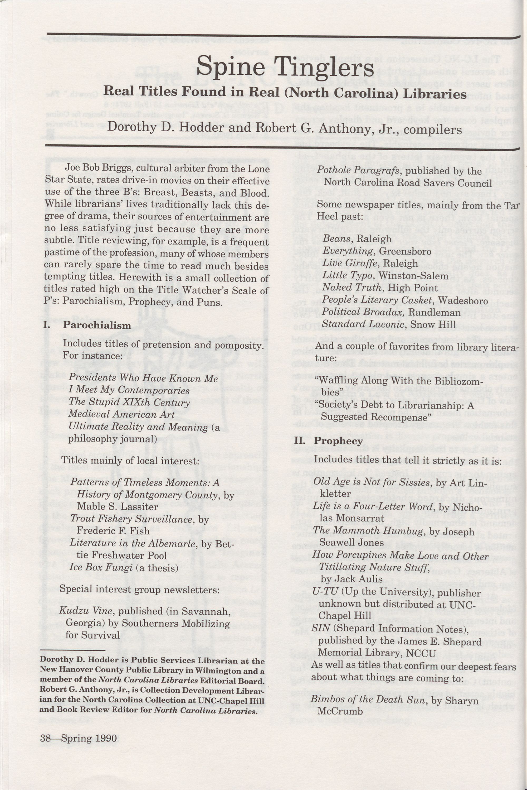 ~ 38 Spine Tinglers: Real Titles in Real (North Carolina)