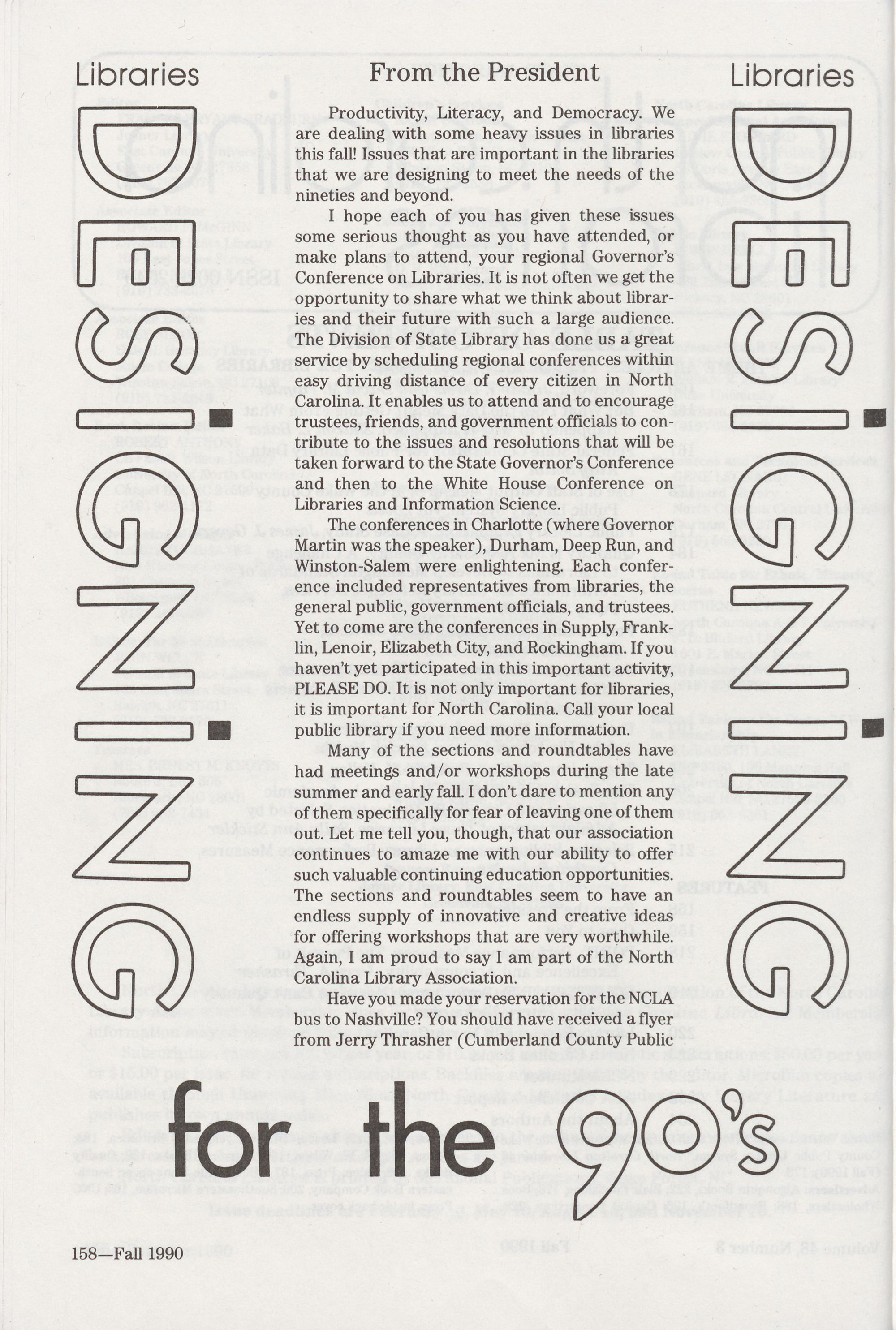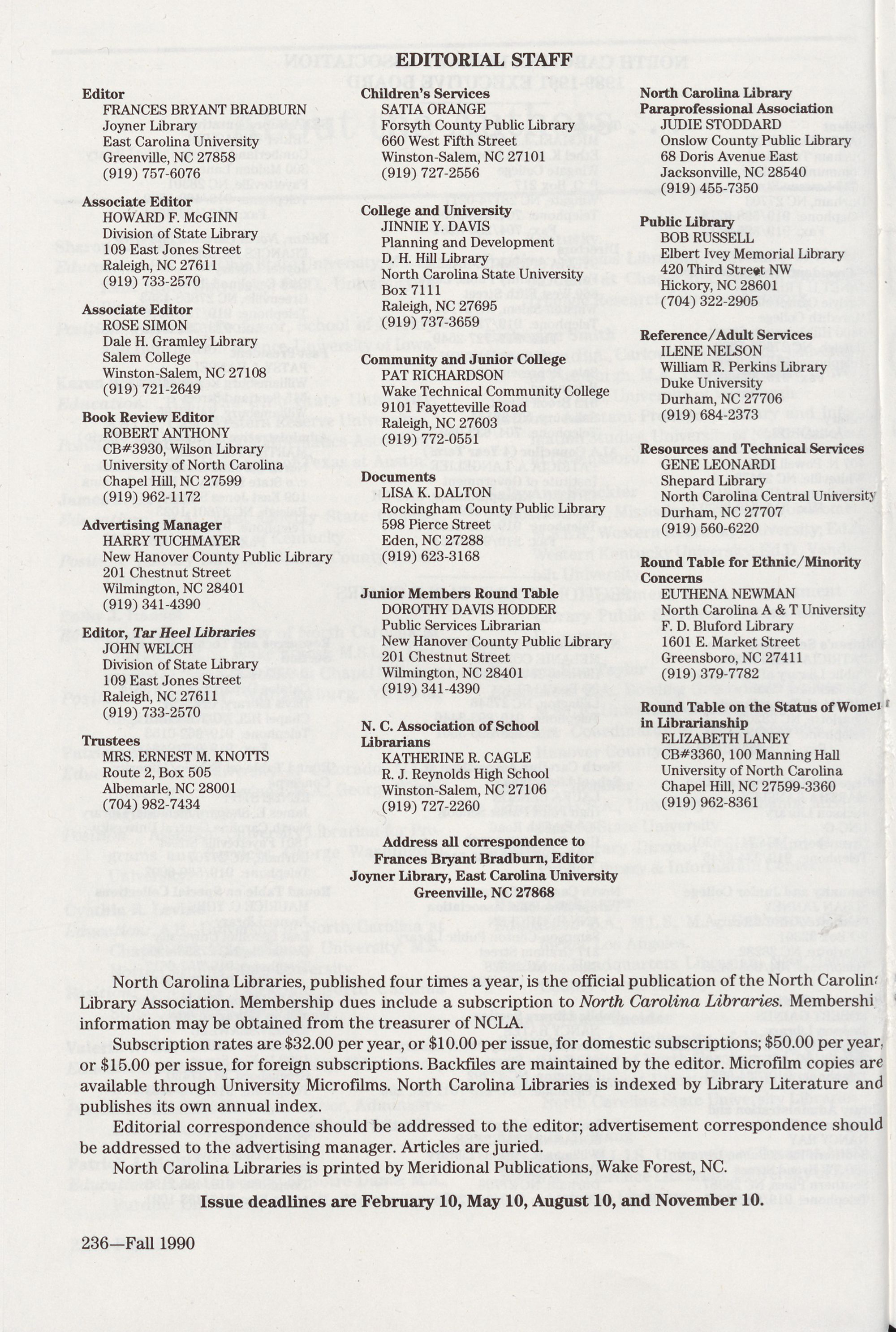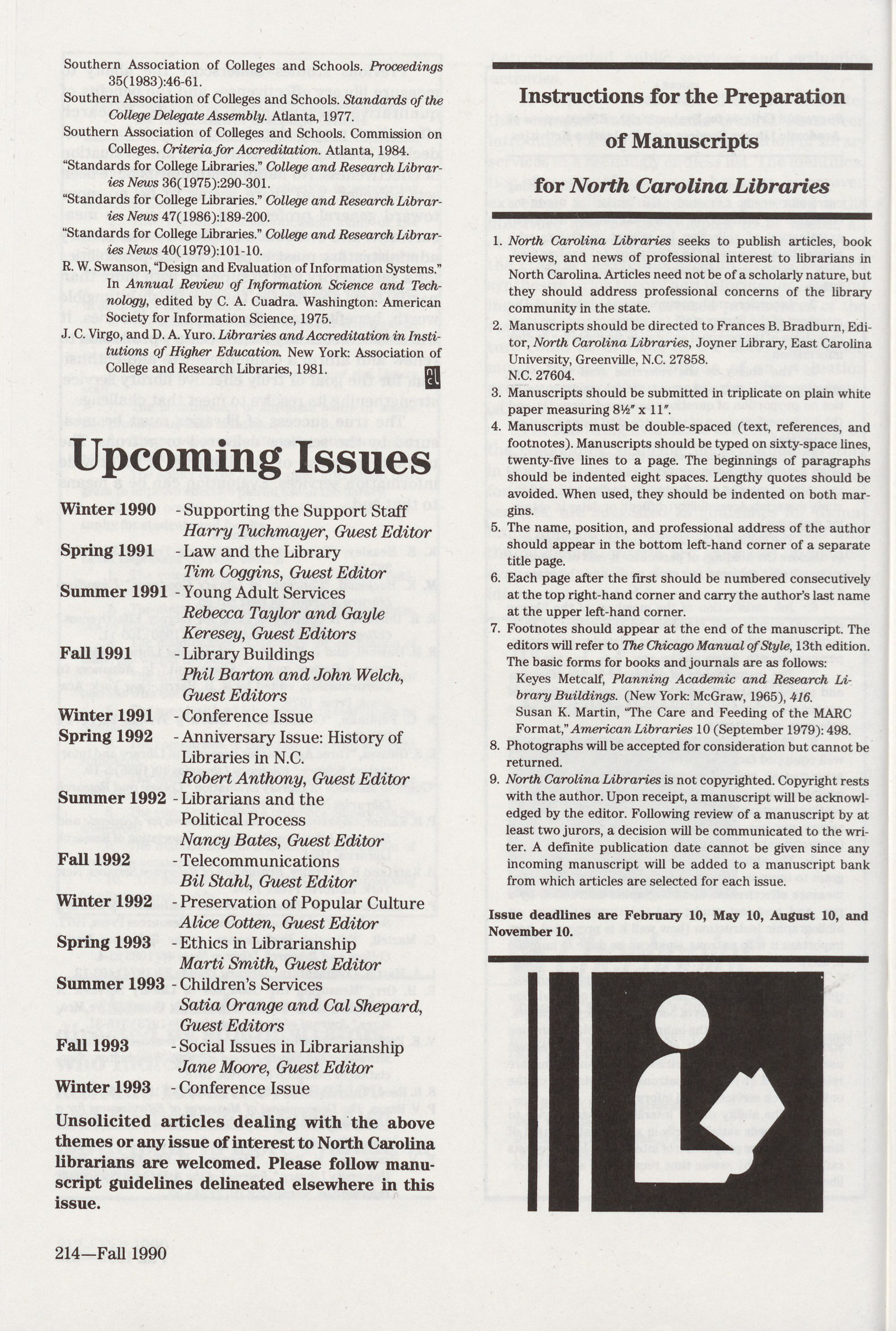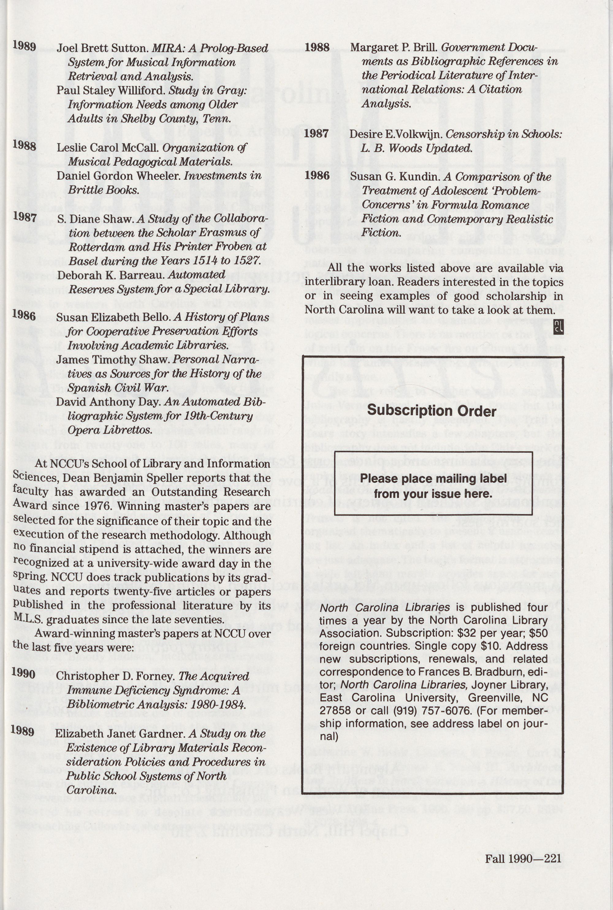 available through University Microfilms. North Carolina Libraries is indexed by Library Literature and