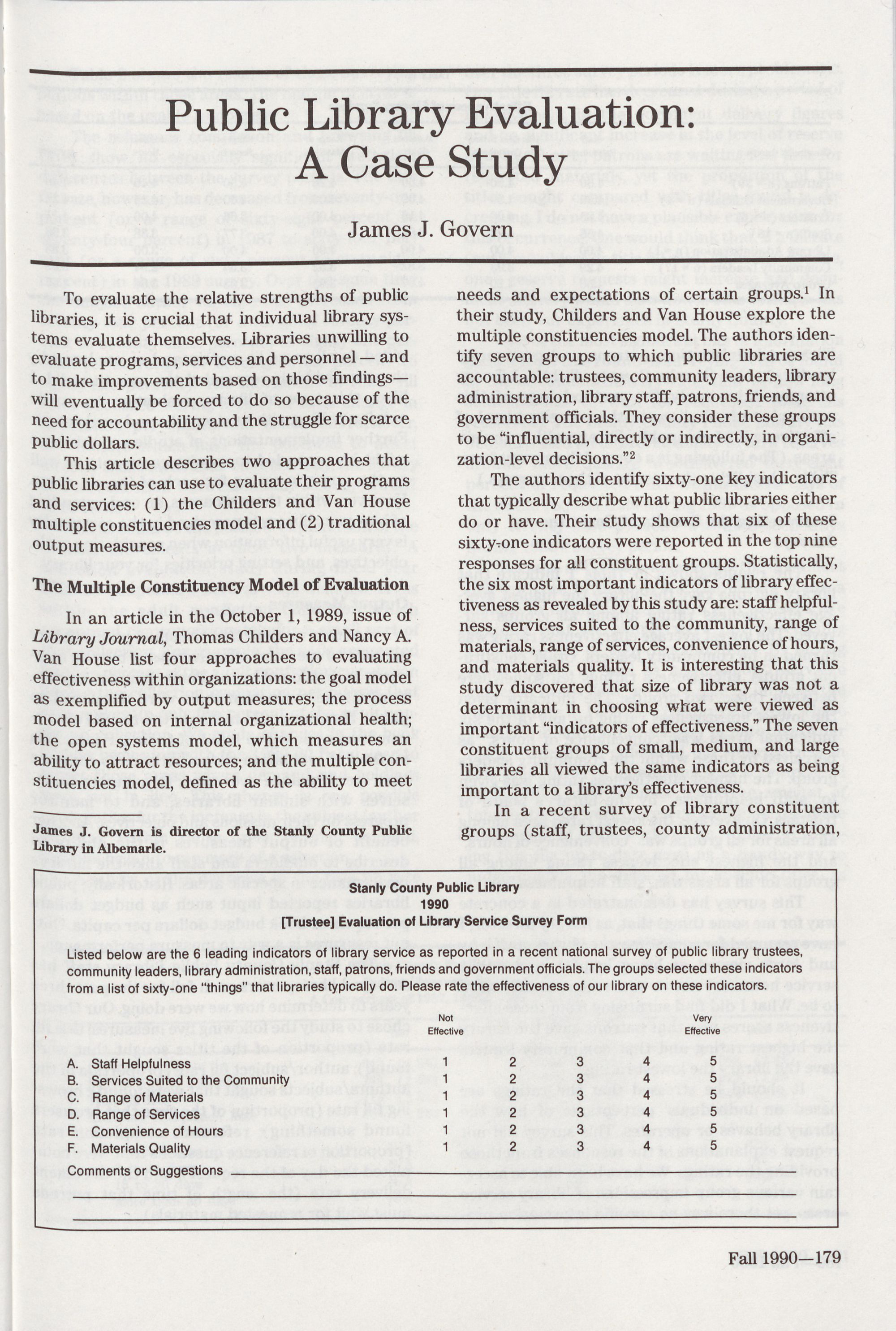 179 Public Library Evaluation: A Case Study, James J. Govern