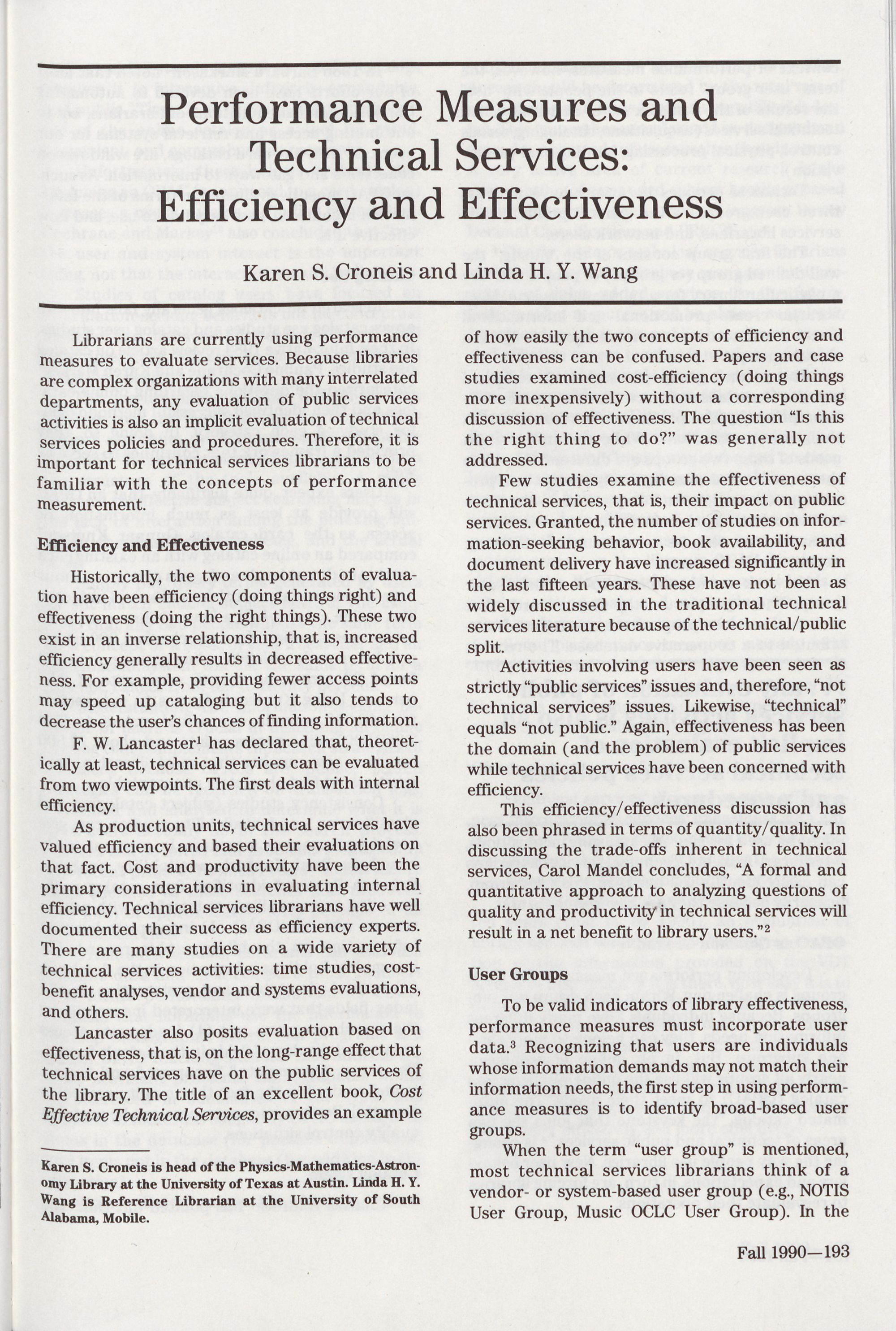 Efficiency and Effectiveness, Karen S. Croneis