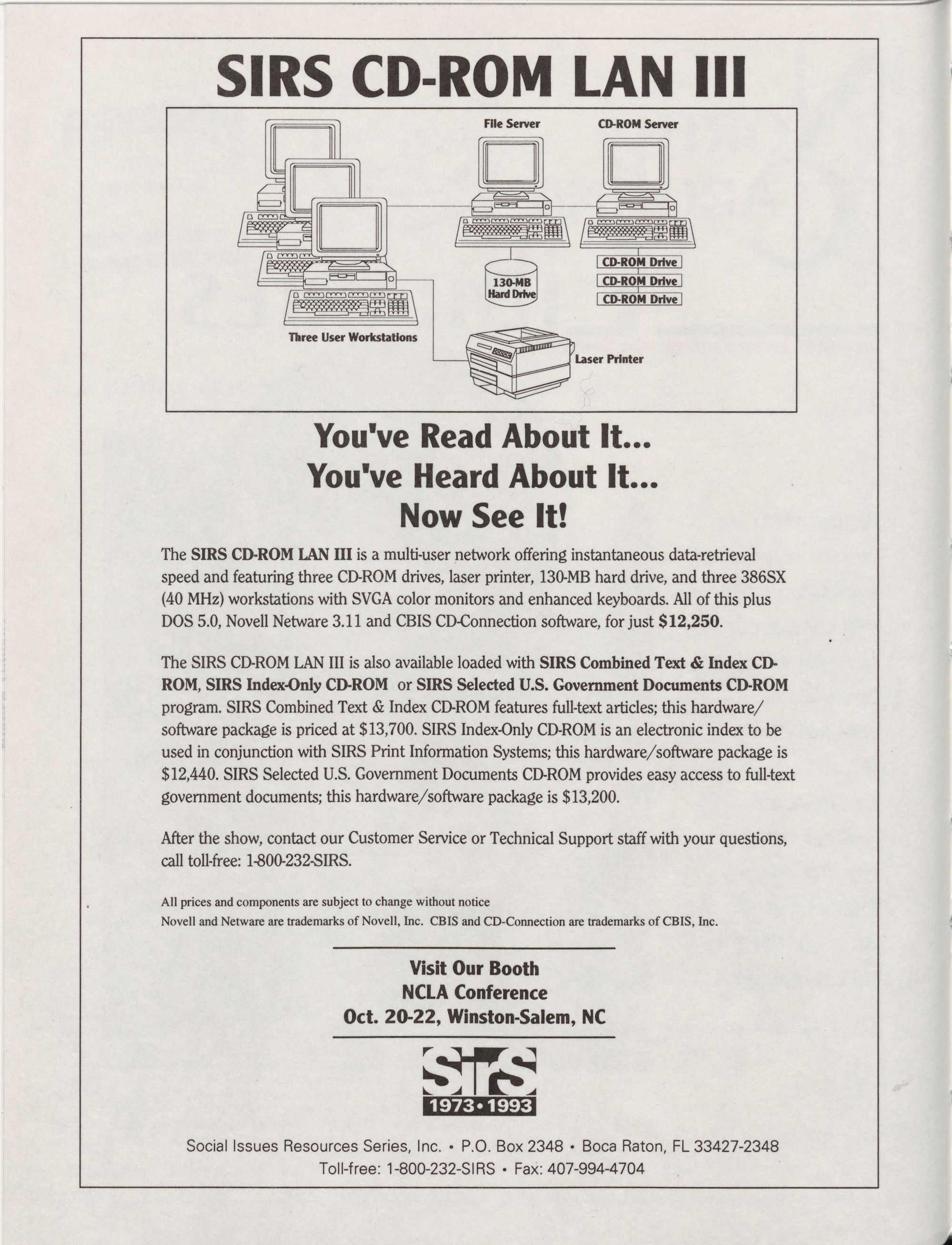 The SIRS CD-ROM LAN III is a multi-user network offering instantaneous data-retrieval