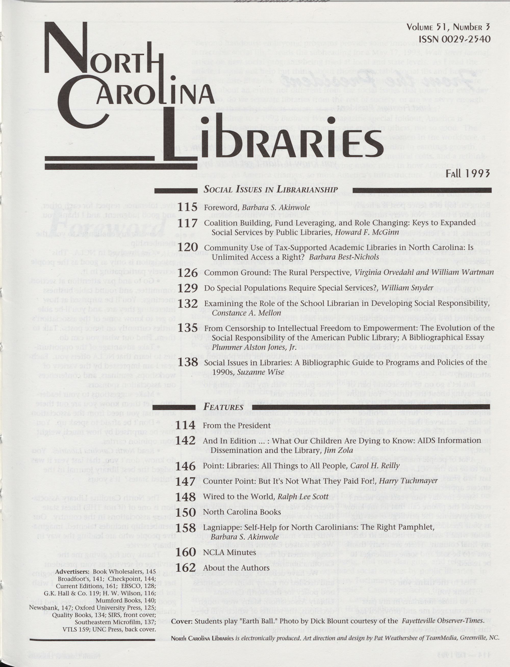 Southeastern Microfilm, 137; Cover: Students play "Earth Ball." Photo by Dick Blount courtesy of the Fayetteville Observer-Times.