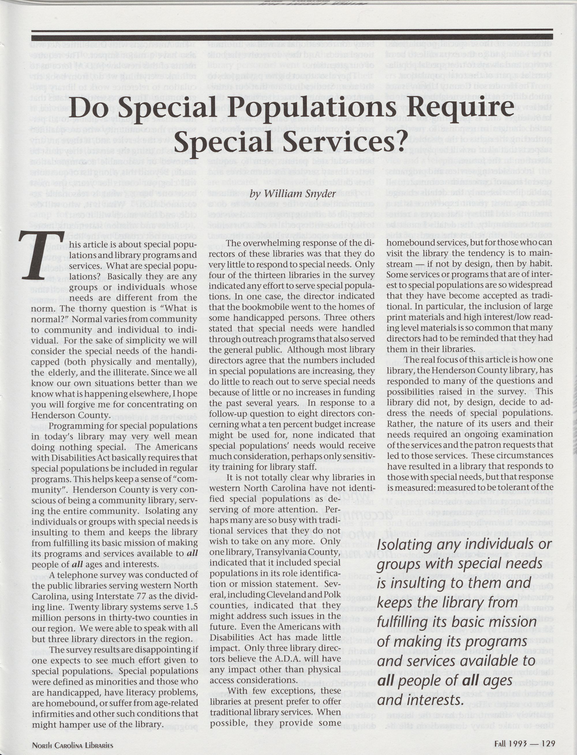 129 Do Special Populations Require Special Services?, William Snyder