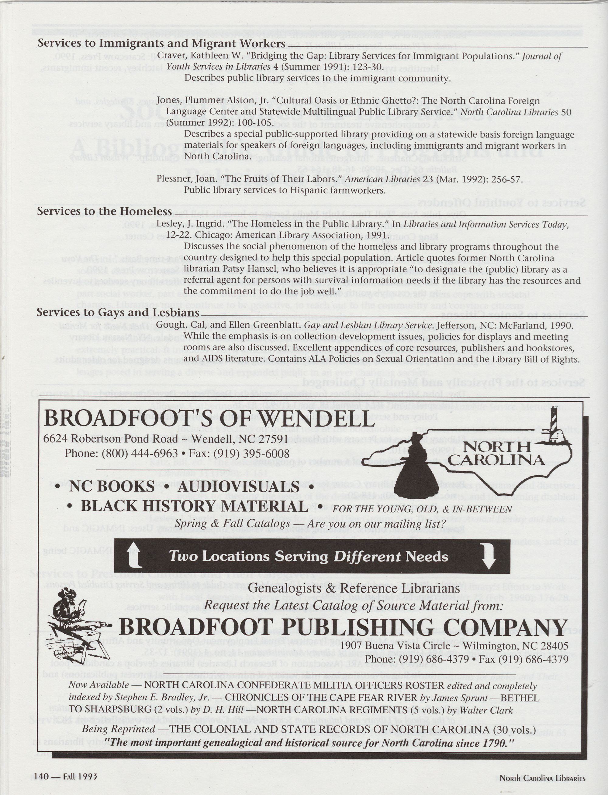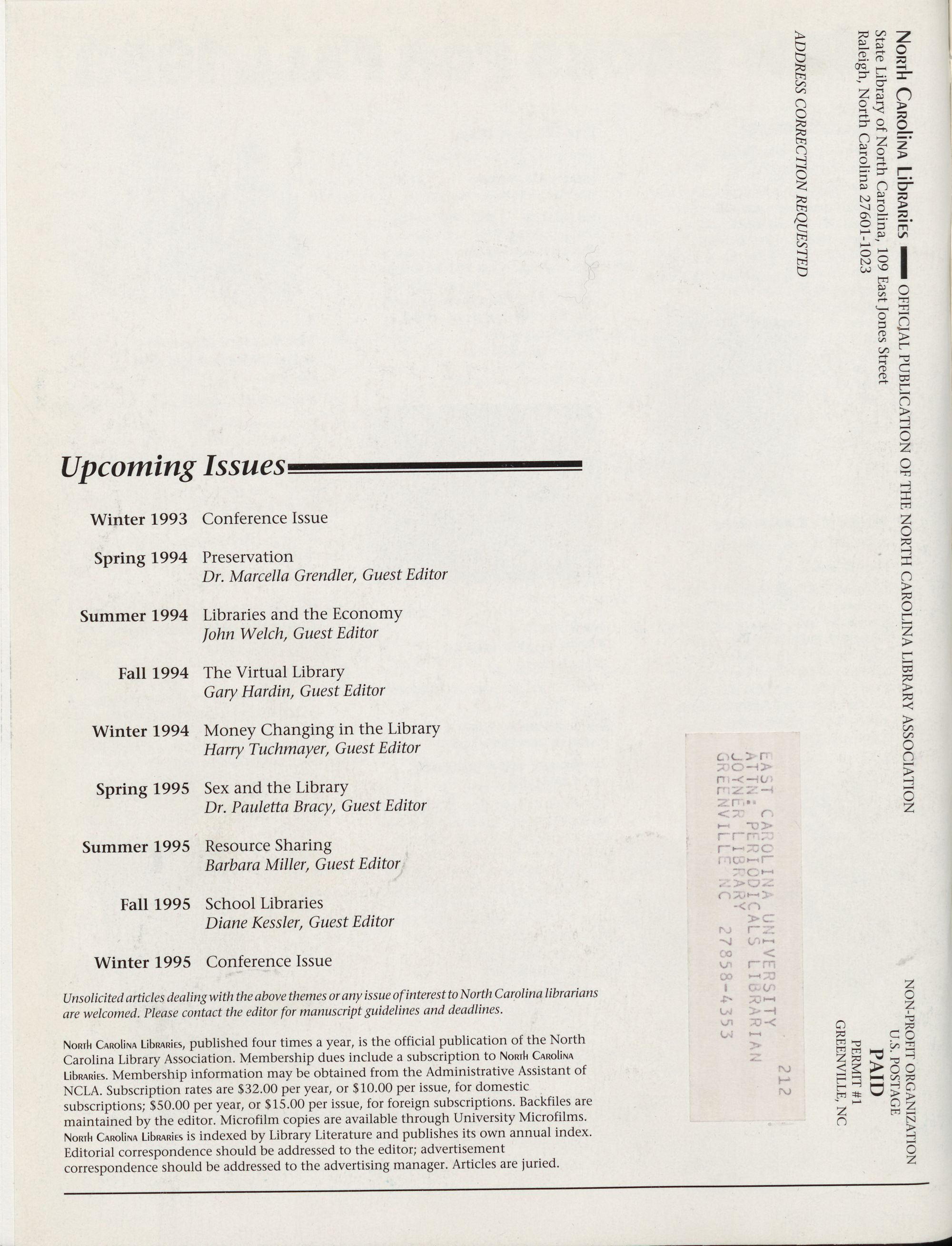 North Carolina Libraries is indexed by Library Literature and publishes its own annual index.