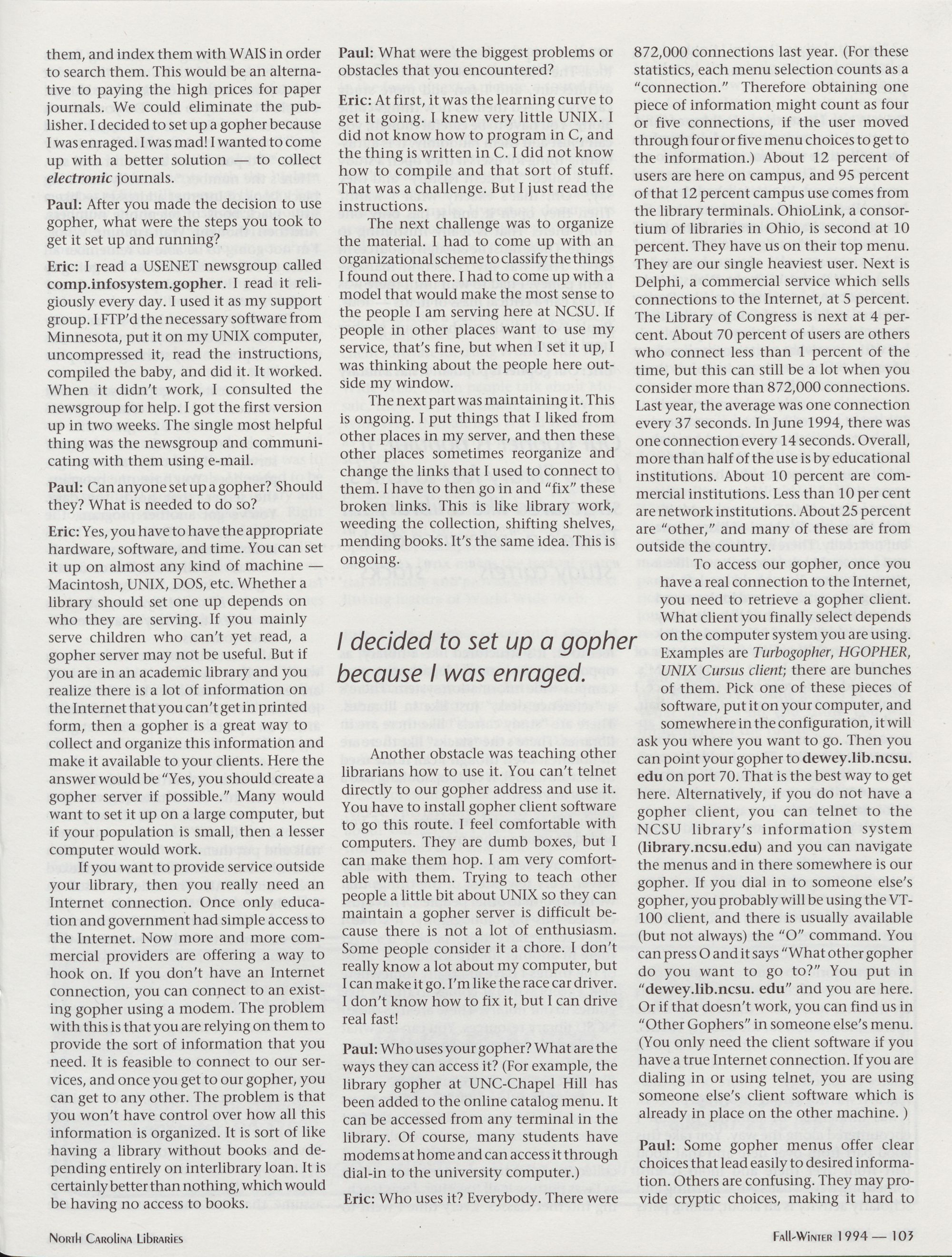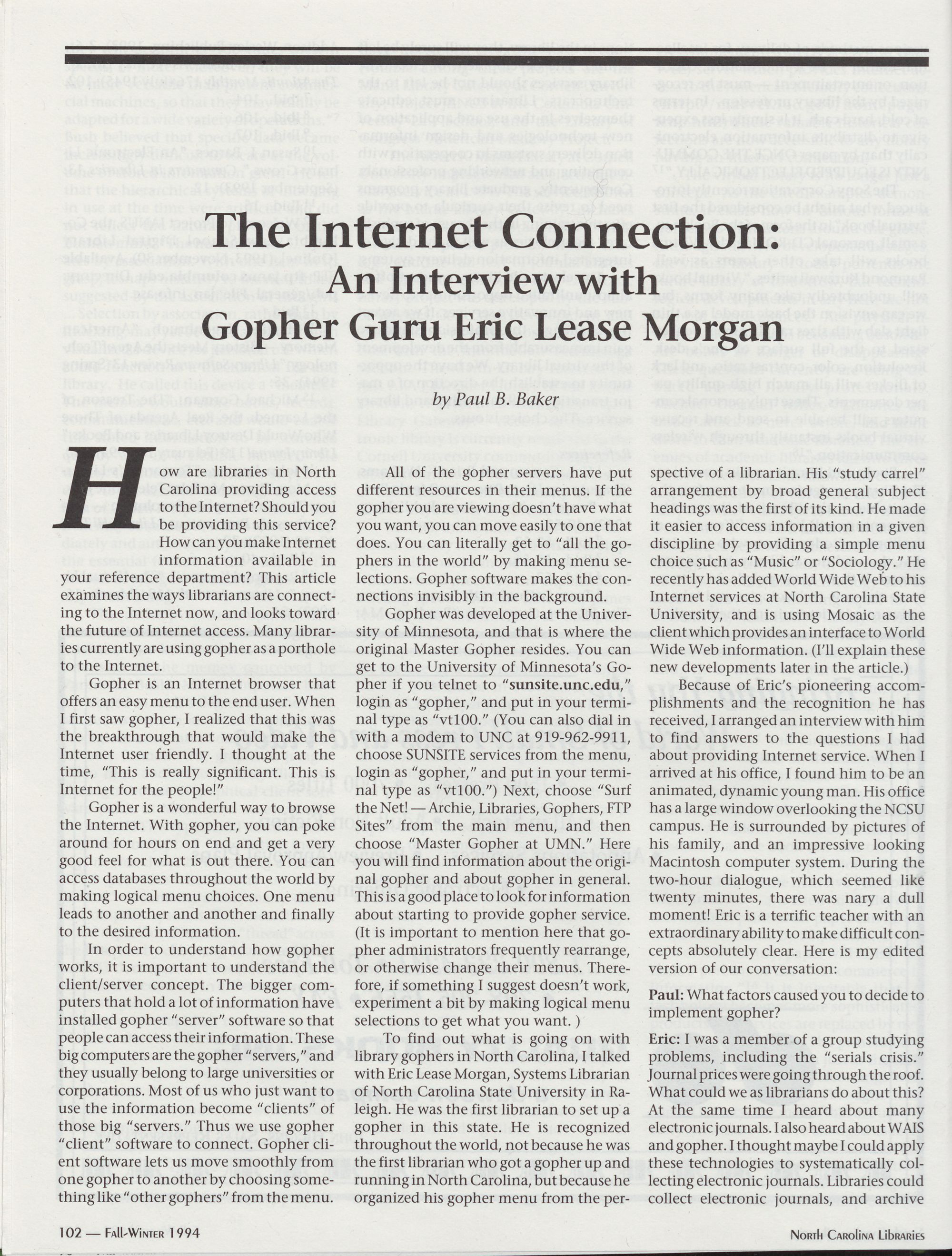 102 The Internet Connection: An Interview with Gopher Guru Eric LeaseT Morgan,