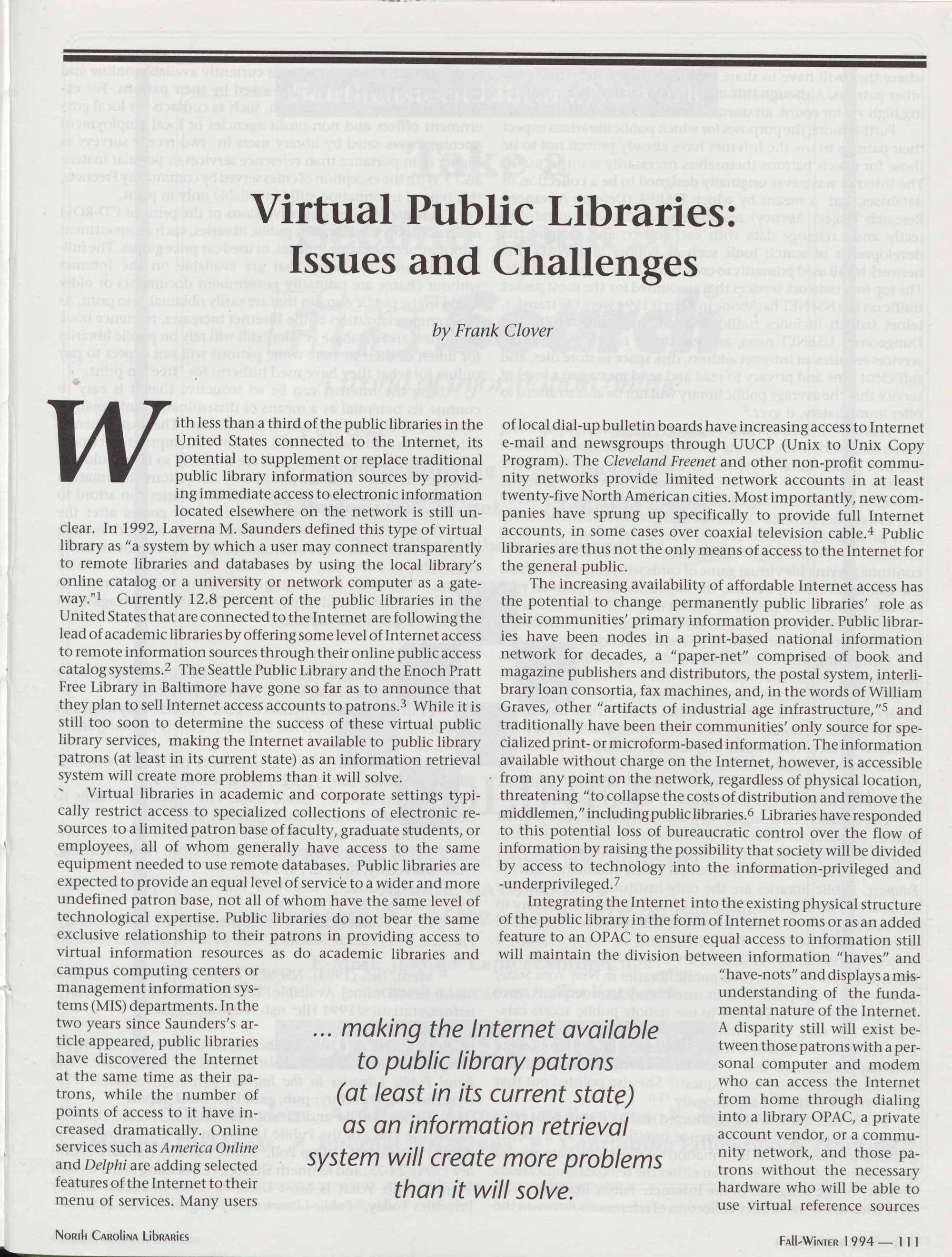 111. Virtual Public Libraries: Issues and Challenges, Frank Clover